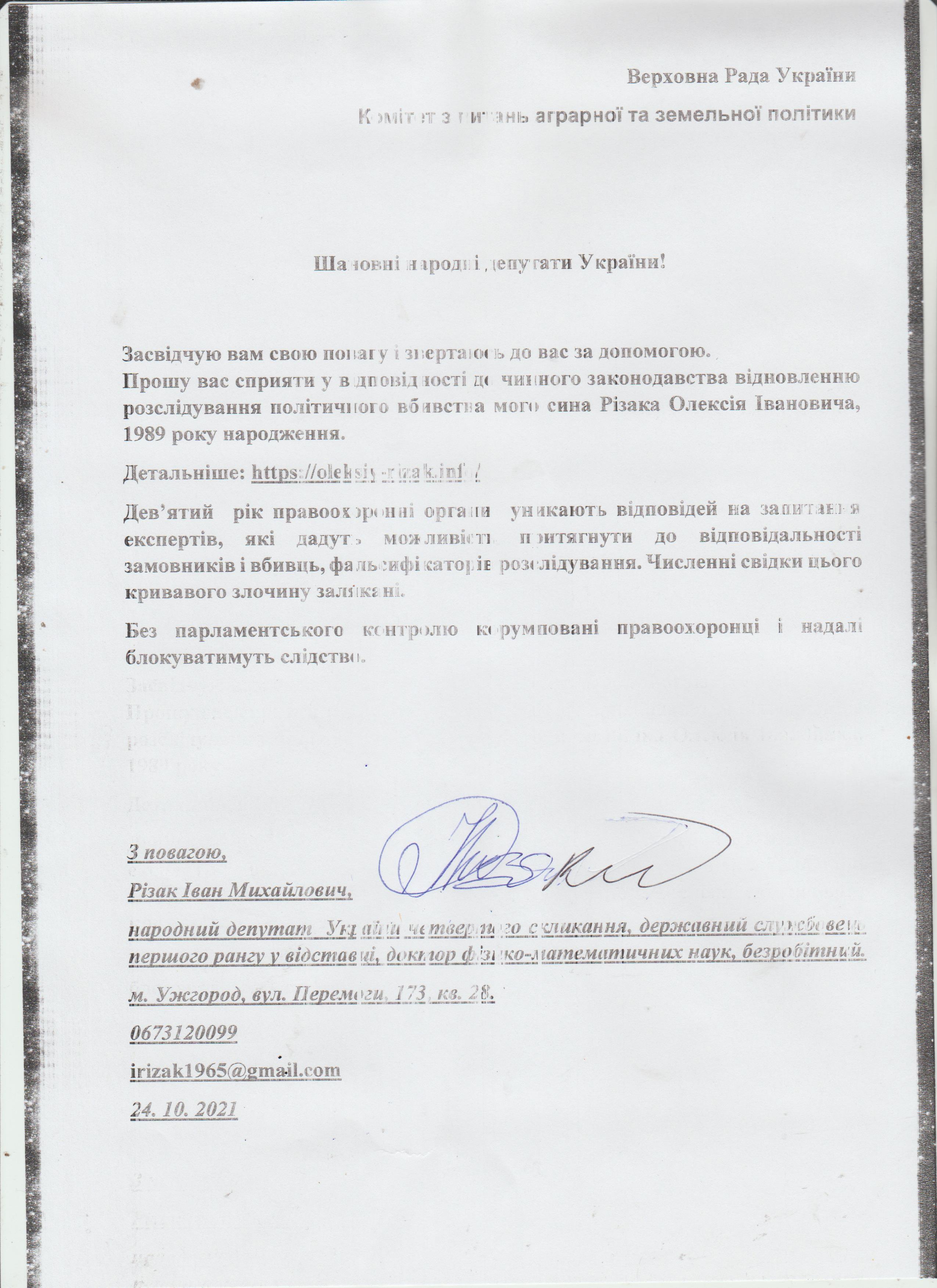 24.10. 2021. Важливе звернення Івана Різака до Комітету Верховної Ради України з питань аграрної та земельної політики