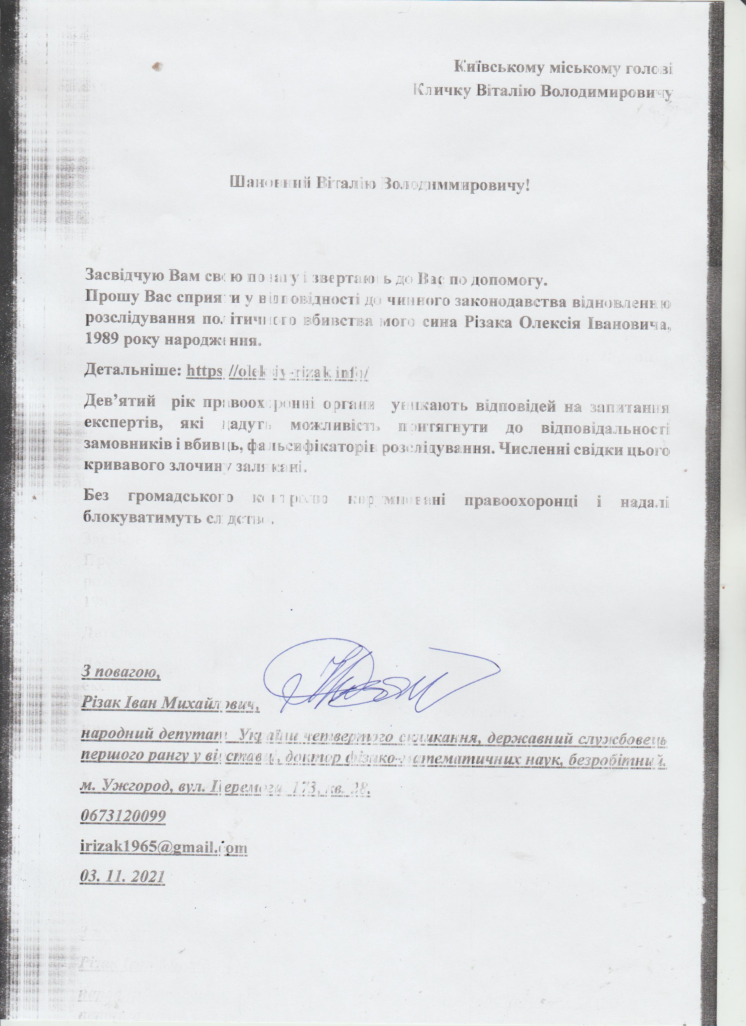 03.11. 2021. Звернення Івана Різака до Київського міського голови Віталія Кличка