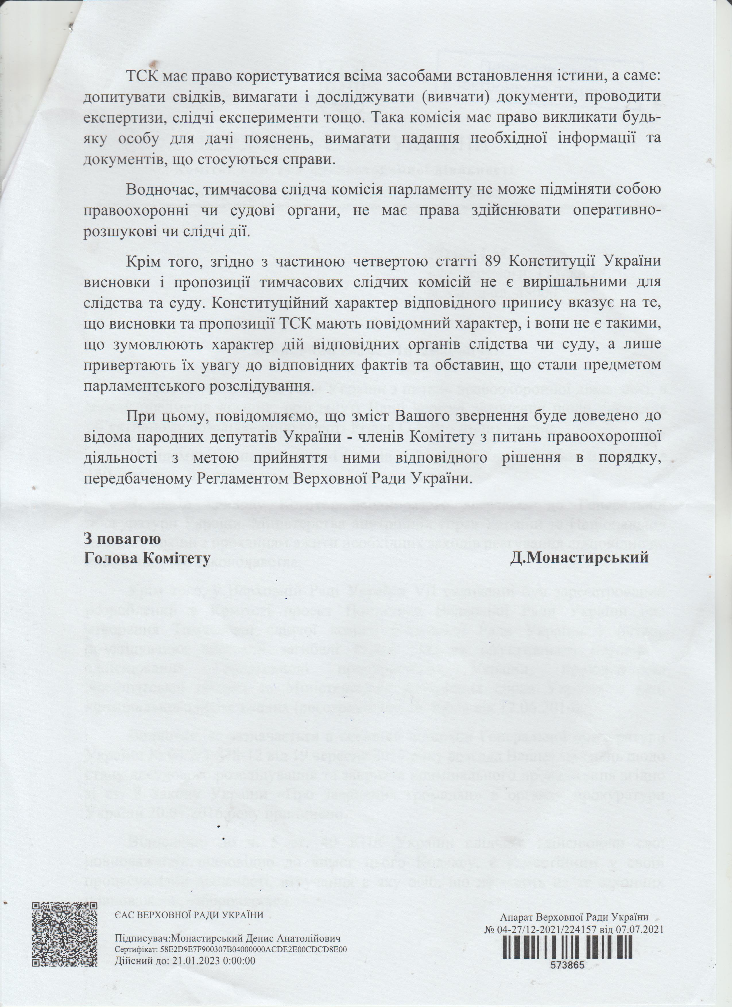 05.11.2021. Відповідь Комітету Верховної Ради України з питань правоохоронної діяльності