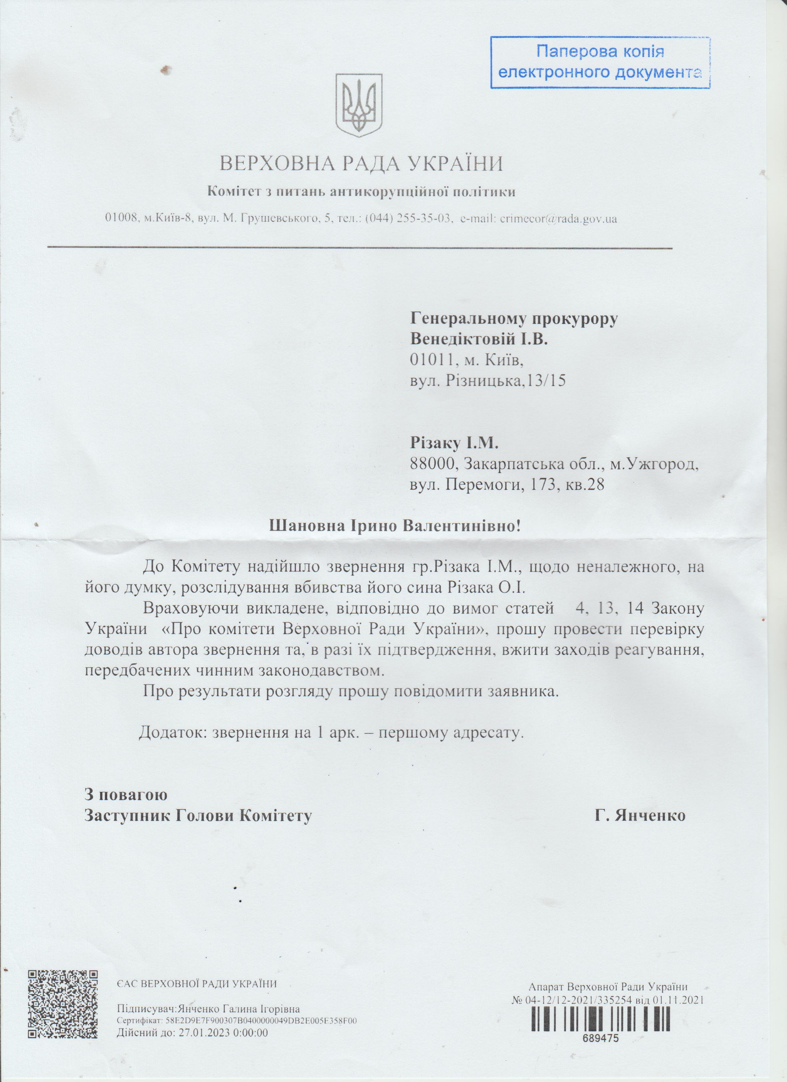 13. 11.2021. Дякуємо Заступнику Голови Комітету Верховної Ради України Галині Янченко за реагування на звернення Івана Різака!