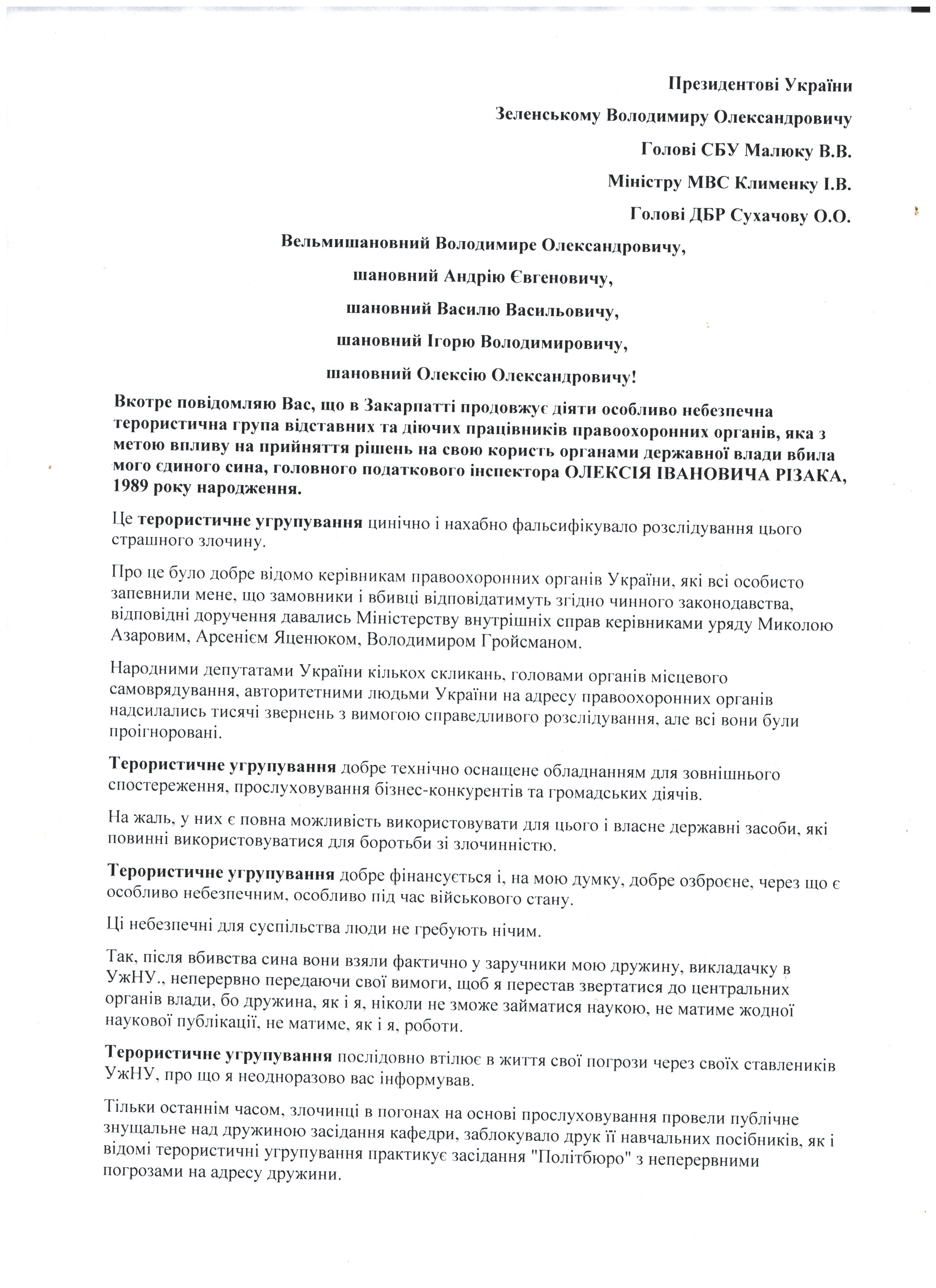 Вкотре повідомляю Вас, що в Закарпатті продовжує діяти особливо небезпечна терористична група відставних та діючих працівників правоохоронних органів, яка з метою впливу на прийняття рішень на свою користь органами державної влади вбила мого єдиного сина, головного податкового інспектора ОЛЕКСІЯ ІВАНОВИЧА РІЗАКА, 1989 року народження.