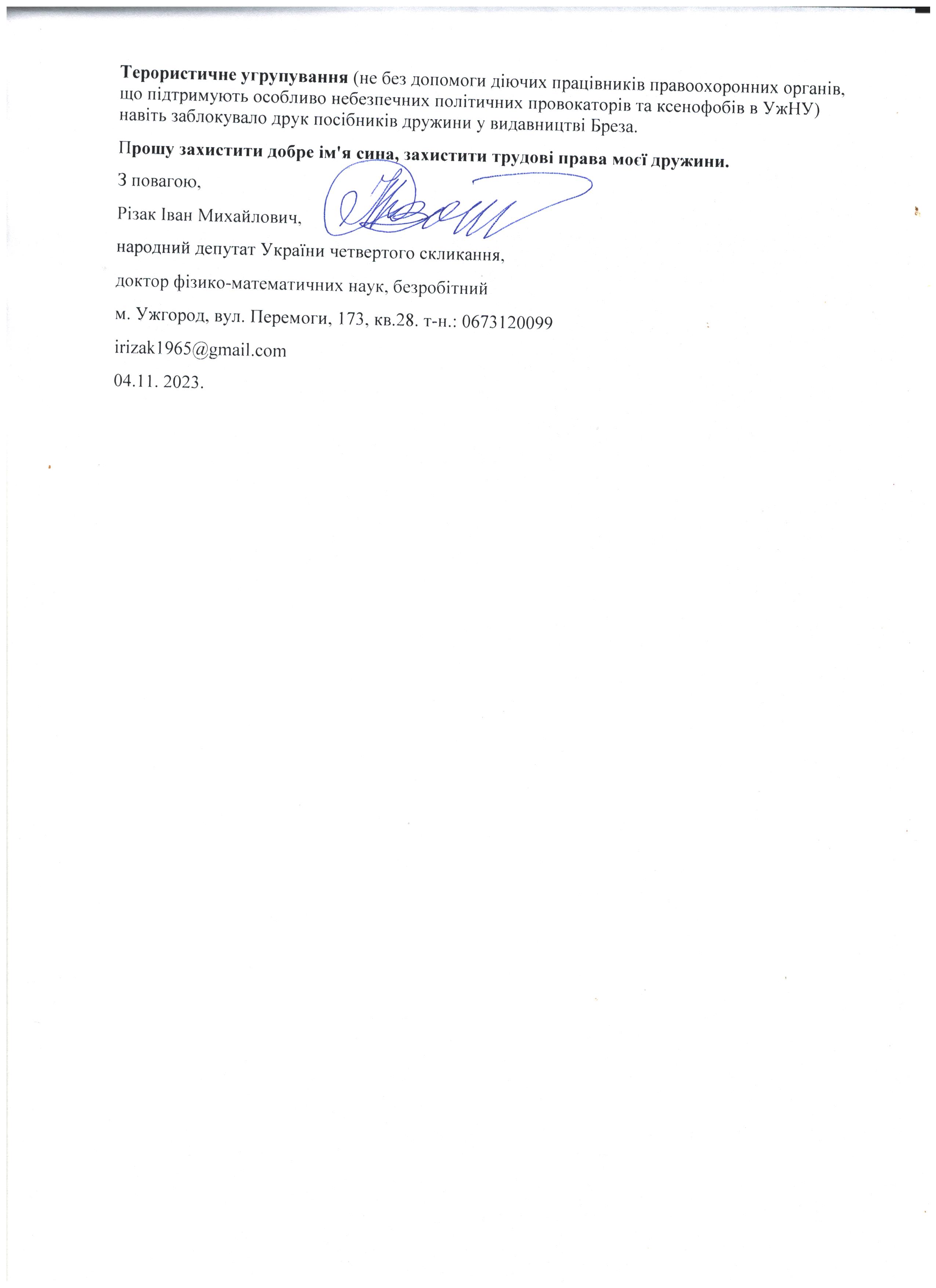 Терористичне угрупування послідовно втілює в життя свої погрози через своїх ставлеників УжНУ, про що я неодноразово вас інформував. Тільки останнім часом, злочинці в погонах на основі прослуховування провели публічне знущальне над дружиною засідання кафедри, заблокували друк її навчальних посібників, як і відомі терористичні угрупування практикує засідання "Політбюро" з неперервними погрозами на адресу дружини.