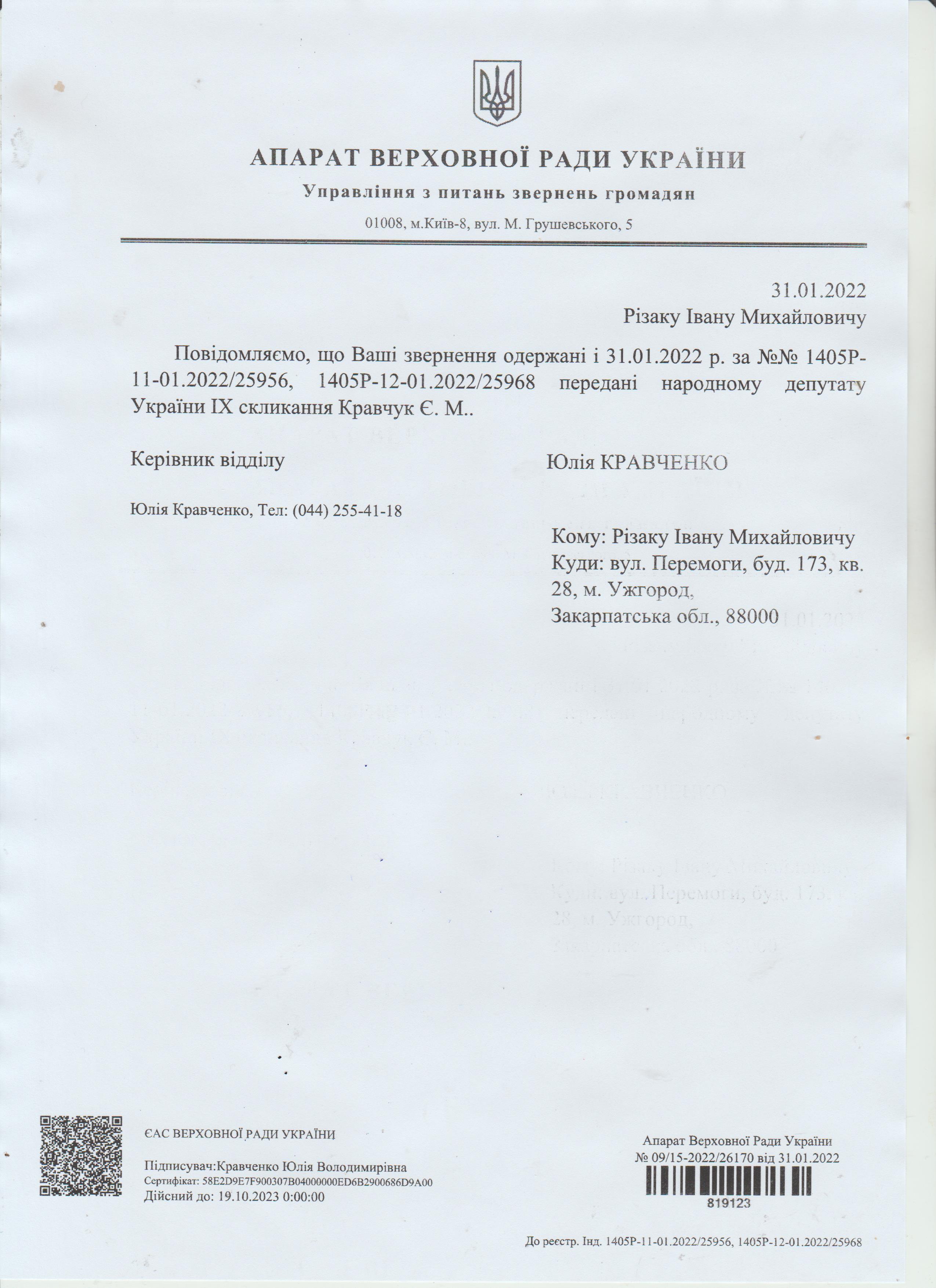 03.02.2022. Звернення Івана Різака щодо розслідування вбивства сина Олексія та захисту прав дружини Галини Різак передані народній депутатці України Євгенії Кравчук