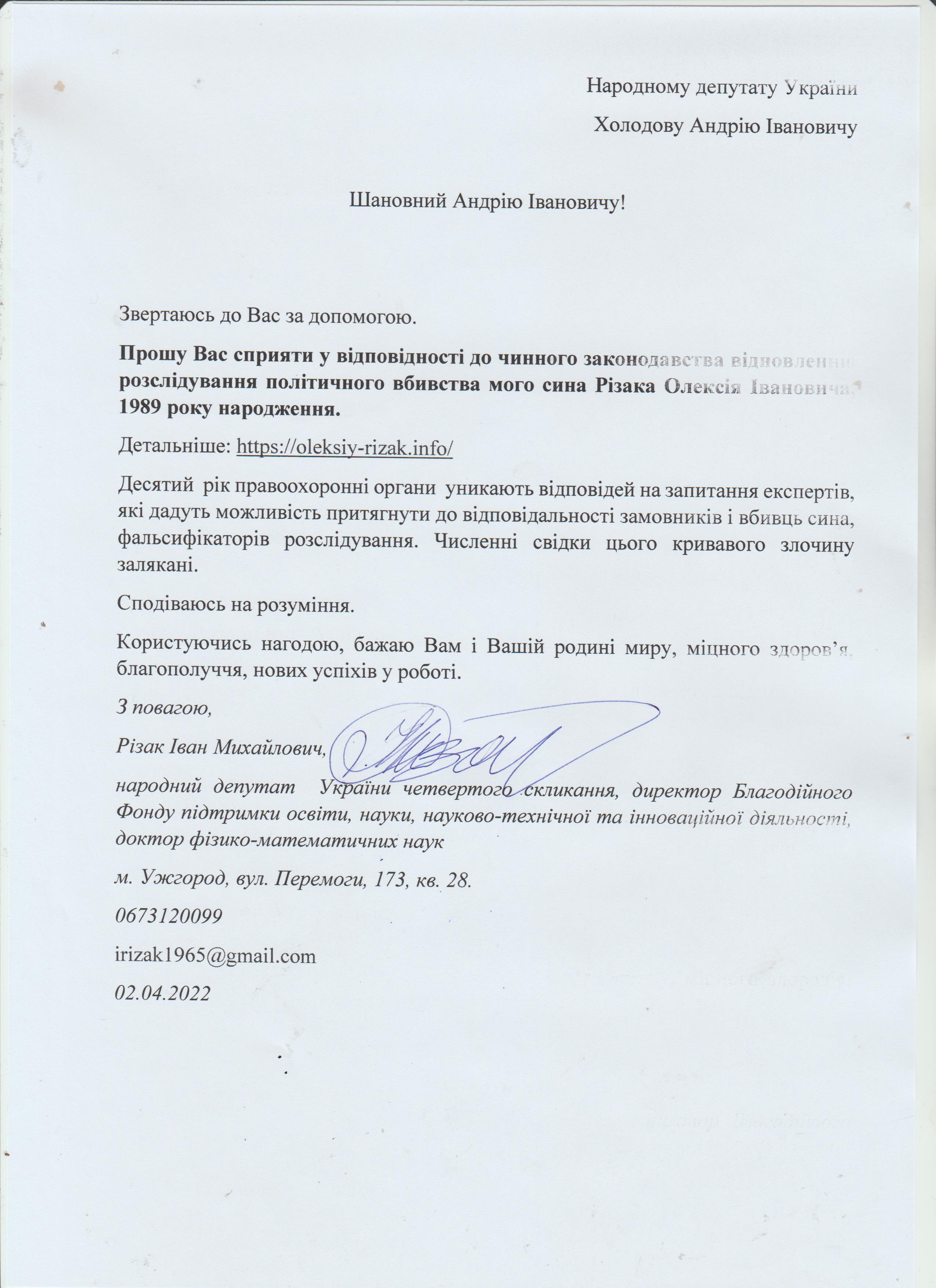 02.04.2022. Звернення Івана Різака до Андрія Холодова