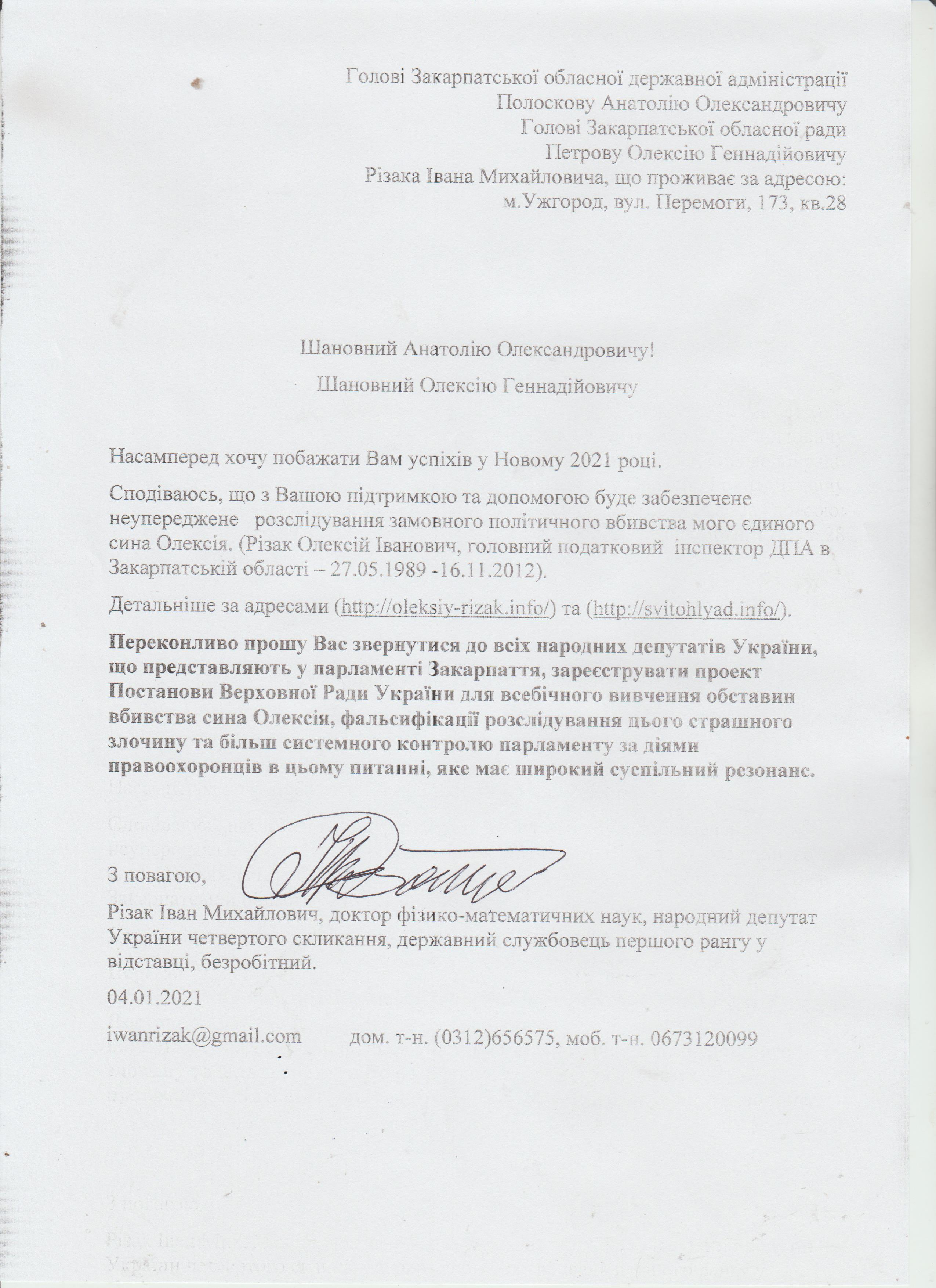 Шановні Анатолію Леонідовичу, Василю Дмитровичу, Василю Миколайовичу! Звертаюся до Вас як батько, як колишній керівник області, як простий житель цього краю, який хоче, щоб на цій землі ніколи не проливалася кров наших рідних, знайомих і близьких. Переконаний, що у політичного керівництва держави є достатньо волі для того, щоб поставити на місце «безпредельщиков», які пробують дестабілізувати ситуацію у державі. Переконаний, що події на кшталт помаранчевого терору у 2005 роців області більше не повторяться. З глибокою повагою, Різак Іван Михайлович, що проживає за адресою м. Ужгород, вул. Капушанська, б.173 кв. 28, голова Закарпатської обласної державної адміністрації (вересень 2002р. – січень 2005р.), народний депутат IV скликання, державний службовець І рангу, багаторічний голова і член координаційного комітету по боротьбі з організованою злочинністю при ОДА, кандидат фізико-математичних наук, тимчасово непрацюючий.