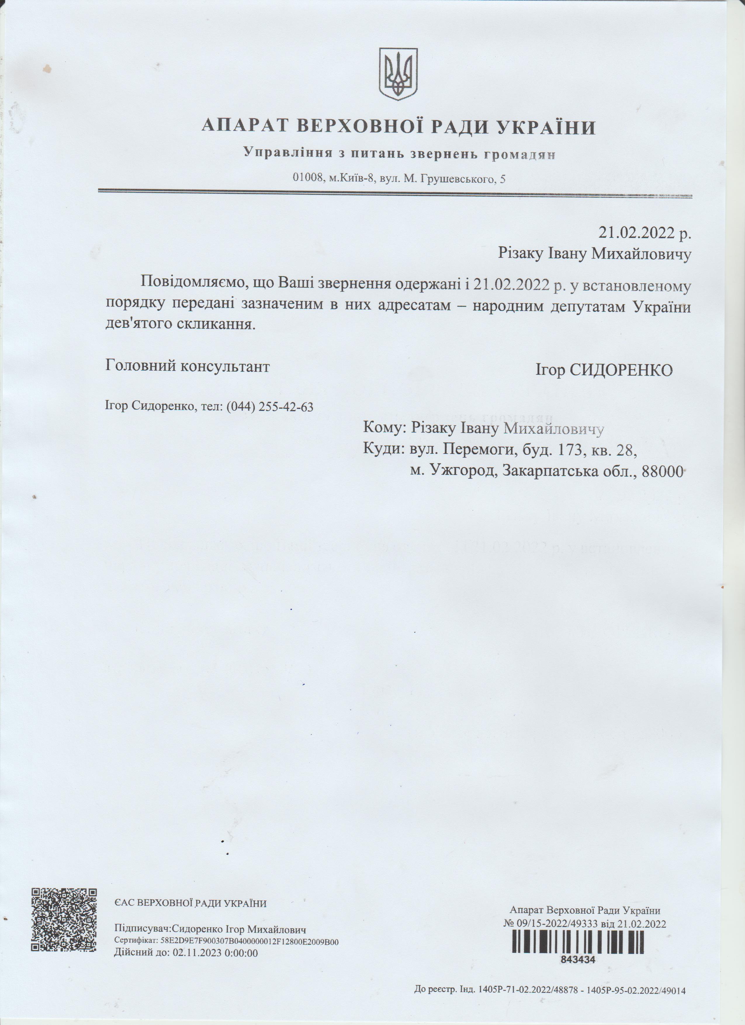 Шановні Анатолію Леонідовичу, Василю Дмитровичу, Василю Миколайовичу! Звертаюся до Вас як батько, як колишній керівник області, як простий житель цього краю, який хоче, щоб на цій землі ніколи не проливалася кров наших рідних, знайомих і близьких. Переконаний, що у політичного керівництва держави є достатньо волі для того, щоб поставити на місце «безпредельщиков», які пробують дестабілізувати ситуацію у державі. Переконаний, що події на кшталт помаранчевого терору у 2005 роців області більше не повторяться. З глибокою повагою, Різак Іван Михайлович, що проживає за адресою м. Ужгород, вул. Капушанська, б.173 кв. 28, голова Закарпатської обласної державної адміністрації (вересень 2002р. – січень 2005р.), народний депутат IV скликання, державний службовець І рангу, багаторічний голова і член координаційного комітету по боротьбі з організованою злочинністю при ОДА, кандидат фізико-математичних наук, тимчасово непрацюючий.