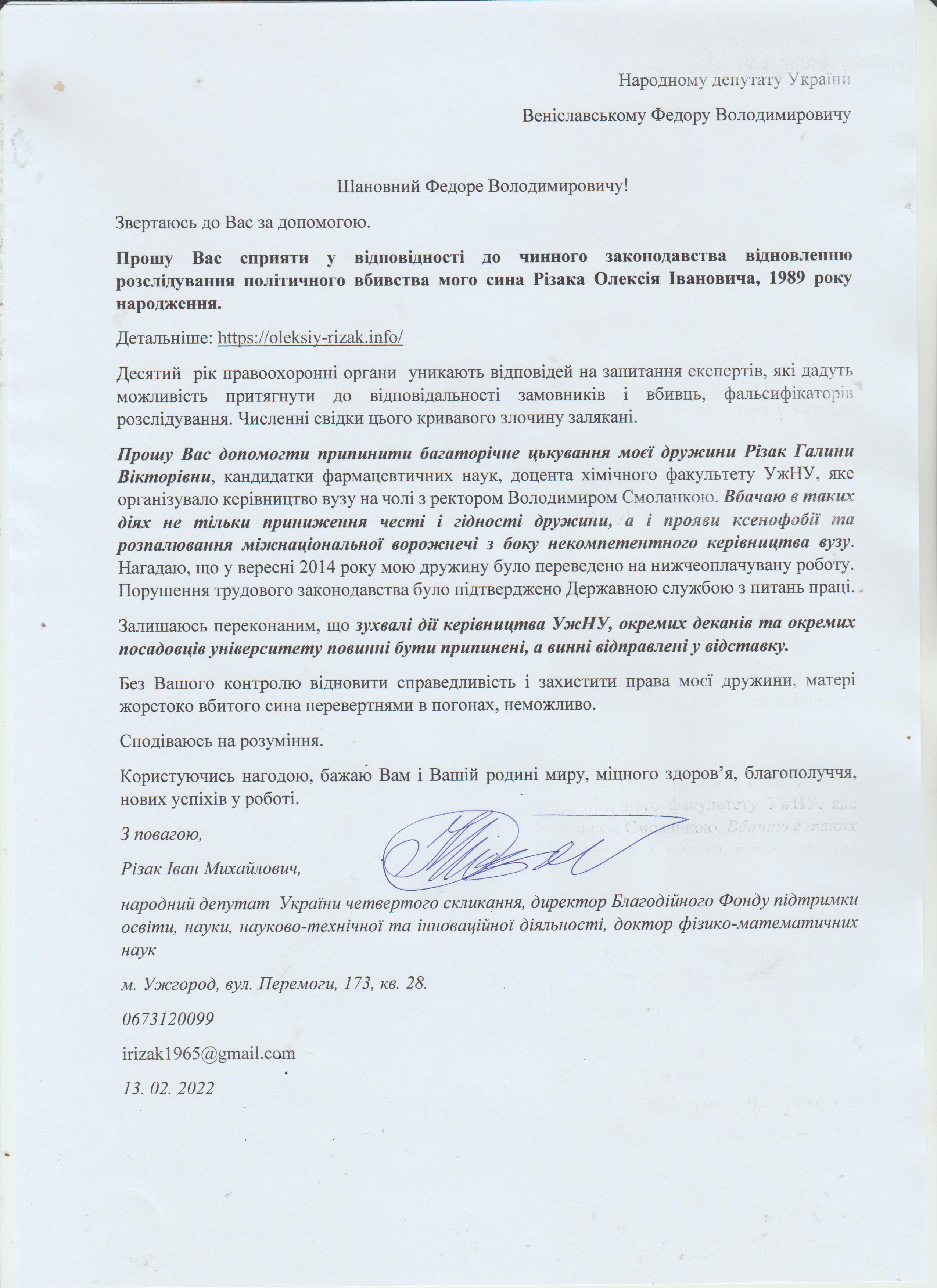 Шановні Анатолію Леонідовичу, Василю Дмитровичу, Василю Миколайовичу! Звертаюся до Вас як батько, як колишній керівник області, як простий житель цього краю, який хоче, щоб на цій землі ніколи не проливалася кров наших рідних, знайомих і близьких. Переконаний, що у політичного керівництва держави є достатньо волі для того, щоб поставити на місце «безпредельщиков», які пробують дестабілізувати ситуацію у державі. Переконаний, що події на кшталт помаранчевого терору у 2005 роців області більше не повторяться. З глибокою повагою, Різак Іван Михайлович, що проживає за адресою м. Ужгород, вул. Капушанська, б.173 кв. 28, голова Закарпатської обласної державної адміністрації (вересень 2002р. – січень 2005р.), народний депутат IV скликання, державний службовець І рангу, багаторічний голова і член координаційного комітету по боротьбі з організованою злочинністю при ОДА, кандидат фізико-математичних наук, тимчасово непрацюючий.