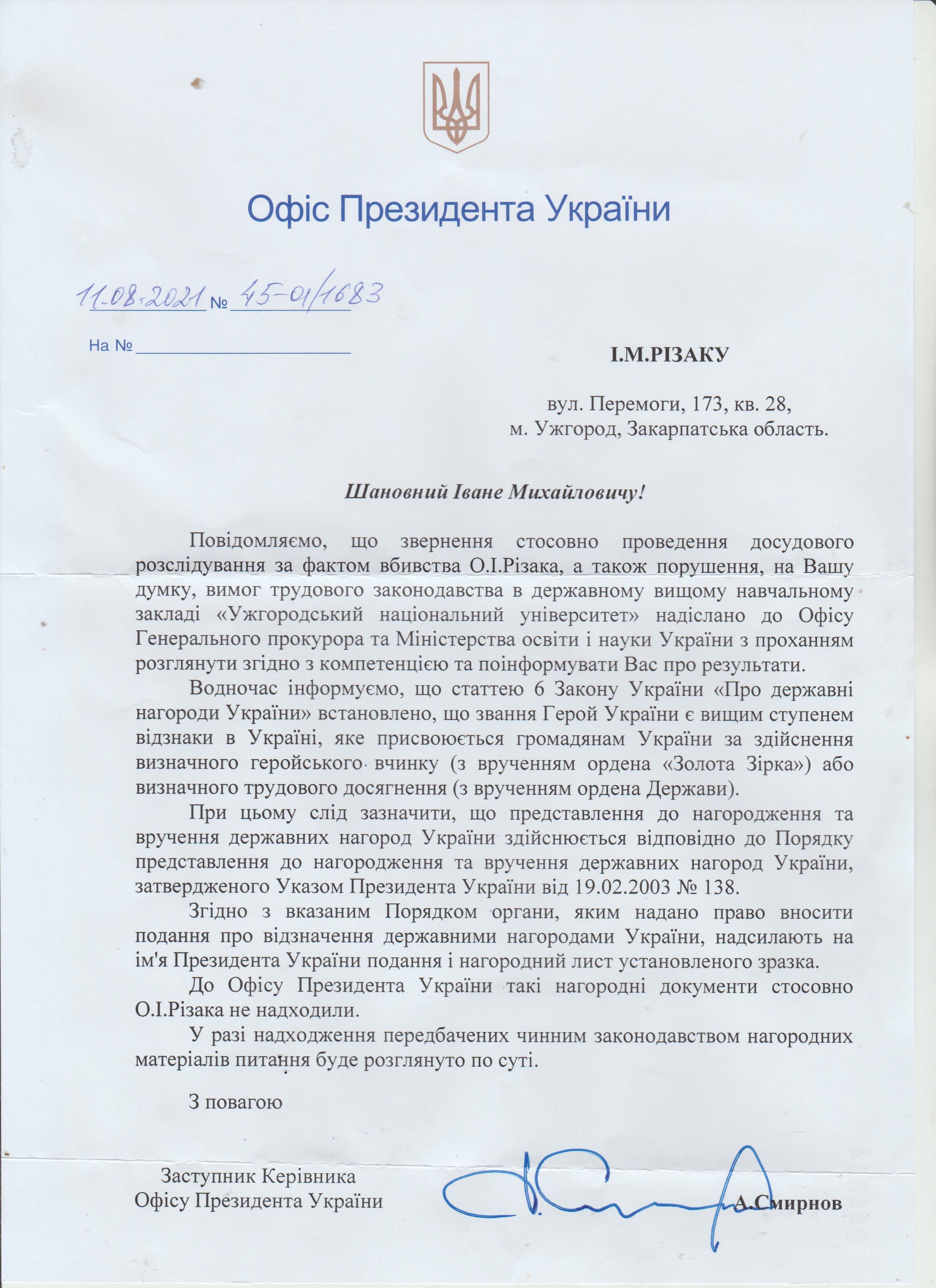 Це дає мені підстави говорити про те, що вбивство мого сина – чітко спланована спецоперація з відповідним інформаційним забезпеченням по своїм масштабам схожа на гебельсівську пропаганду. На час поширення цієї версії загибелі сина не було жодної, підкреслюю жодної, підстави говорити про самогубство, оскільки на той час слідчі не знайшли і сліду падіння з багатоповерхівки Олексія Різака, а також не провели жодної слідчої дії з громадянкою із-за «нещасливої» любові до якої мій син закінчив життя самогубством. Щиро прошу Вас, в найближчі години перекваліфікувати цю трагедію за статею КПК «вбивство» і всебічно, об’єктивно та системно провести відповідні слідчі дії для знаходження впливових замовників і звірів-вбивць мого рідного сина. Коротко Вас проінформую, що Різак Олексій Іванович, 1989 р.н., магістр фінансів (закінчив економічний факультет Харківського національного університету імені В.Н. Каразіна з відзнакою), магістр – юрист (закінчив магістратуру національного університету «Юридична академія України імені Ярослава Мудрого»), має військове звання – молодший лейтенант запасу, працював головним державним податковим інспектором першого рангу ДПС у Закарпатській області. Активно займався спортом. У свій час виступав за юнацьку збірну України з футболу, професійний клуб ФК «Закарпаття». На сьогоднішній день виступав за збірну ДПС у Закарпатській області, щоденно займався фізкультурою (для прикладу скажу, щоранку віджимався до 500 разів, а кількість ранкових стрибків на скакалці сягала 2000 разів, разом зі мною освоював східні єдиноборства), мав щирі відносини із дівчиною, колегами по роботі, був серйозним і відповідальним фахівцем. Додам також, що за півтори години до знаходження його тіла я спілкувався з ним особисто по телефону і обговорював подробиці матчу чемпіонату Італії з футболу Мілан – Фіорентина, під час цієї розмови ми обговорили майбутню поїздку у Київ, а також похід у гості до знайомих. Переконаний, нічого не могло статися за ці півтори години після нашої доброї розмови з почуттям гумору і присутності його дівчини, якій я передав вітання.