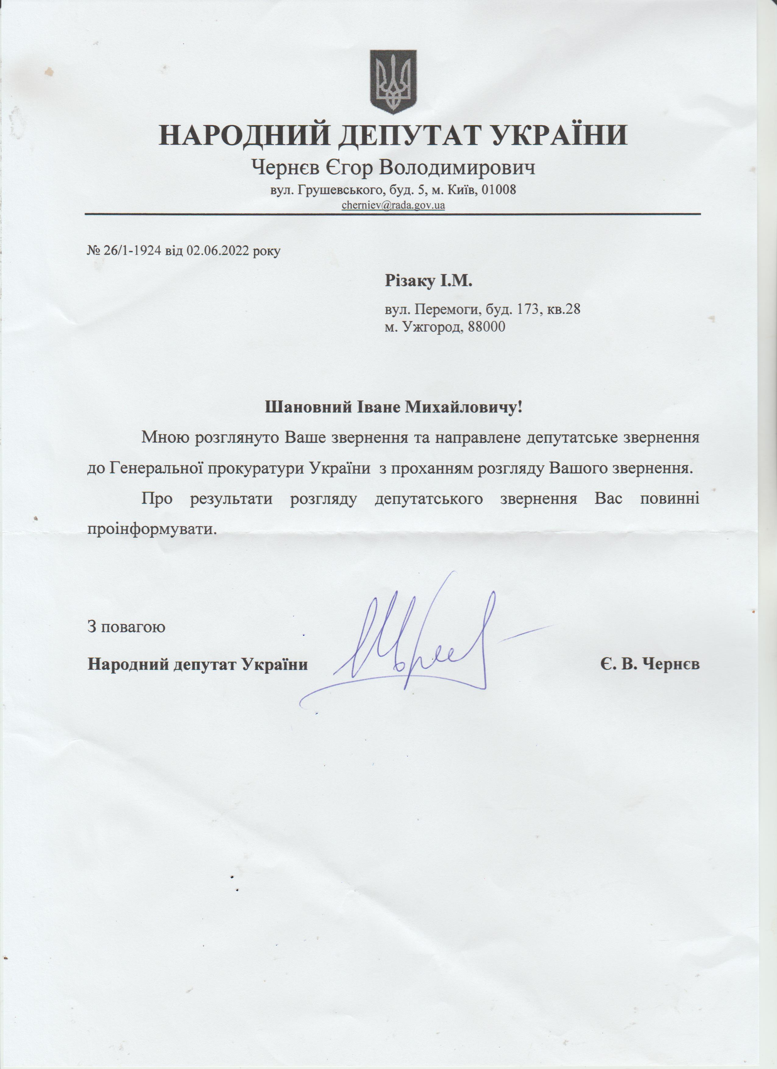 Шановні Анатолію Леонідовичу, Василю Дмитровичу, Василю Миколайовичу! Звертаюся до Вас як батько, як колишній керівник області, як простий житель цього краю, який хоче, щоб на цій землі ніколи не проливалася кров наших рідних, знайомих і близьких. Переконаний, що у політичного керівництва держави є достатньо волі для того, щоб поставити на місце «безпредельщиков», які пробують дестабілізувати ситуацію у державі. Переконаний, що події на кшталт помаранчевого терору у 2005 роців області більше не повторяться. З глибокою повагою, Різак Іван Михайлович, що проживає за адресою м. Ужгород, вул. Капушанська, б.173 кв. 28, голова Закарпатської обласної державної адміністрації (вересень 2002р. – січень 2005р.), народний депутат IV скликання, державний службовець І рангу, багаторічний голова і член координаційного комітету по боротьбі з організованою злочинністю при ОДА, кандидат фізико-математичних наук, тимчасово непрацюючий.