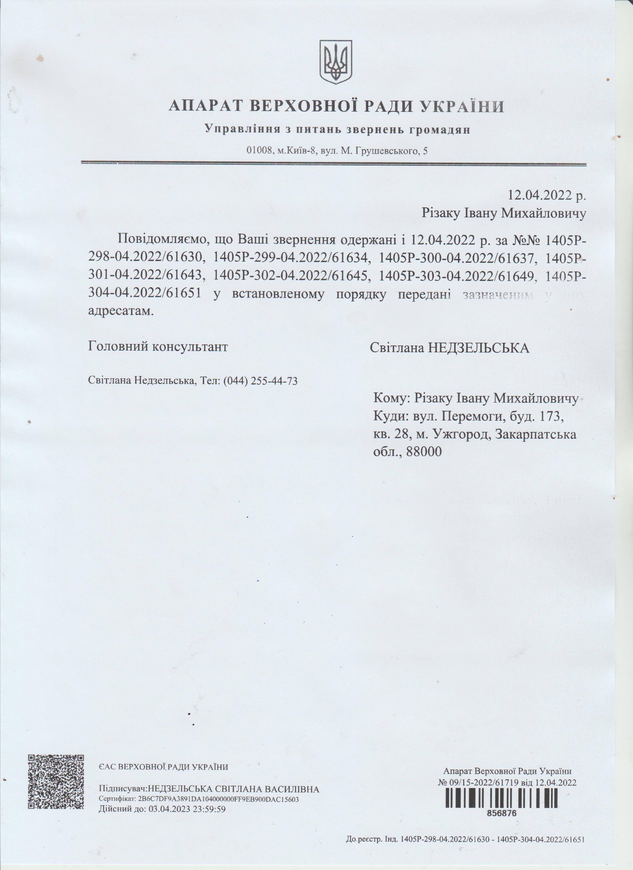 Шановні Анатолію Леонідовичу, Василю Дмитровичу, Василю Миколайовичу! Звертаюся до Вас як батько, як колишній керівник області, як простий житель цього краю, який хоче, щоб на цій землі ніколи не проливалася кров наших рідних, знайомих і близьких. Переконаний, що у політичного керівництва держави є достатньо волі для того, щоб поставити на місце «безпредельщиков», які пробують дестабілізувати ситуацію у державі. Переконаний, що події на кшталт помаранчевого терору у 2005 роців області більше не повторяться. З глибокою повагою, Різак Іван Михайлович, що проживає за адресою м. Ужгород, вул. Капушанська, б.173 кв. 28, голова Закарпатської обласної державної адміністрації (вересень 2002р. – січень 2005р.), народний депутат IV скликання, державний службовець І рангу, багаторічний голова і член координаційного комітету по боротьбі з організованою злочинністю при ОДА, кандидат фізико-математичних наук, тимчасово непрацюючий.