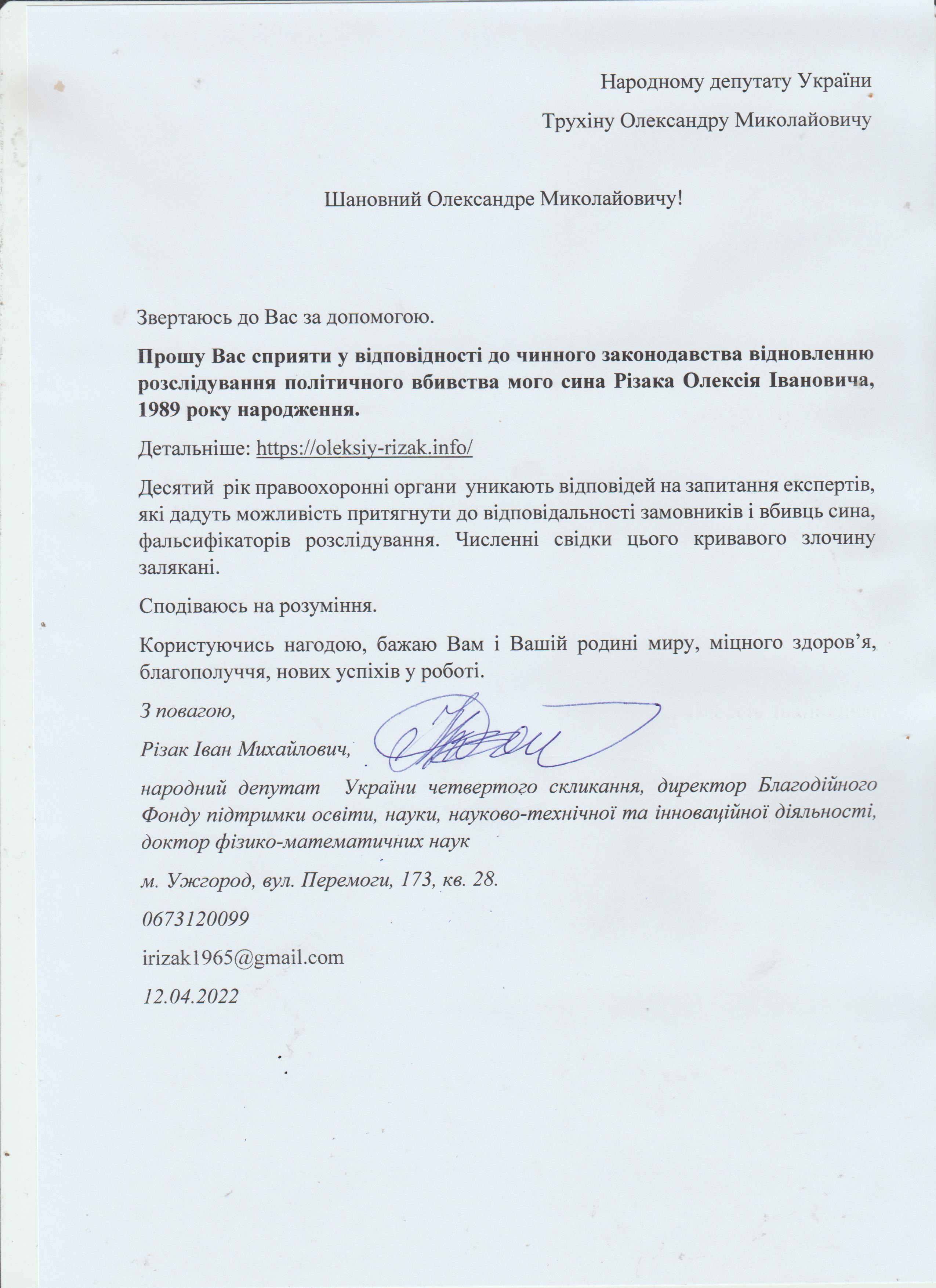 З метою сприяння слідству, а також всебічно об’єктивного розслідування справи прошу Вас доручити своїм підлеглим перевірити наступні питання: 1) чи міг володіти працівник ДПС в Закарпатській області Олексій Різак якоюсь інформацією про тіньовий та кримінальний бізнес в області, знання якої загрожувало б його життю? 2) перевірити у відповідних державних органах наявність у Різака Олексія Івановича та його близьких родичів майна, фінансів, земельних ділянок, підприємств, бізнесу, акцій, облігацій та інших цінних паперів, володіння якими могло б потенційно загрожувати його життю з боку конкурентів та інших співвласників? 3) чи були у нього відносини з громадянкою чи її родичами такими, що могли серйозно впливати на його майновий, матеріальний та ін. стан. 4) чи залучались до спеціальної перевірки, яку потрібно проходити при зарахуванні на державну службу, підрозділи зовнішнього спостереження якоїсь із правоохоронних структур області (я стверджую, що з часу переїзду мене в Закарпаття за нами було встановлене тотальне зовнішнє спостереження)? 5) хотілося б дізнатися (думаю, що це не є слідчою таємницею) в який час і з допомогою якого транспорту 16 листопада 2012 року виїхав син від своєї дівчини, чи проводжала вона його сама або з близькими родичами, чи бачила щось підозріле і яким таксі він виїжджав додому? 6) хотілося б також дізнатися хто першим побачив тіло вбитого юнака і повідомив швидку допомогу і міліцію? 7) з метою перевірки версії спроби отруєння сина Олексія, прошу дати на перевірку у спеціальну токсикологічну лабораторію результати трьох аналізів в «Астра-дія» і одного аналізу, проведеного в кардіодиспансері кілька тижнів тому.