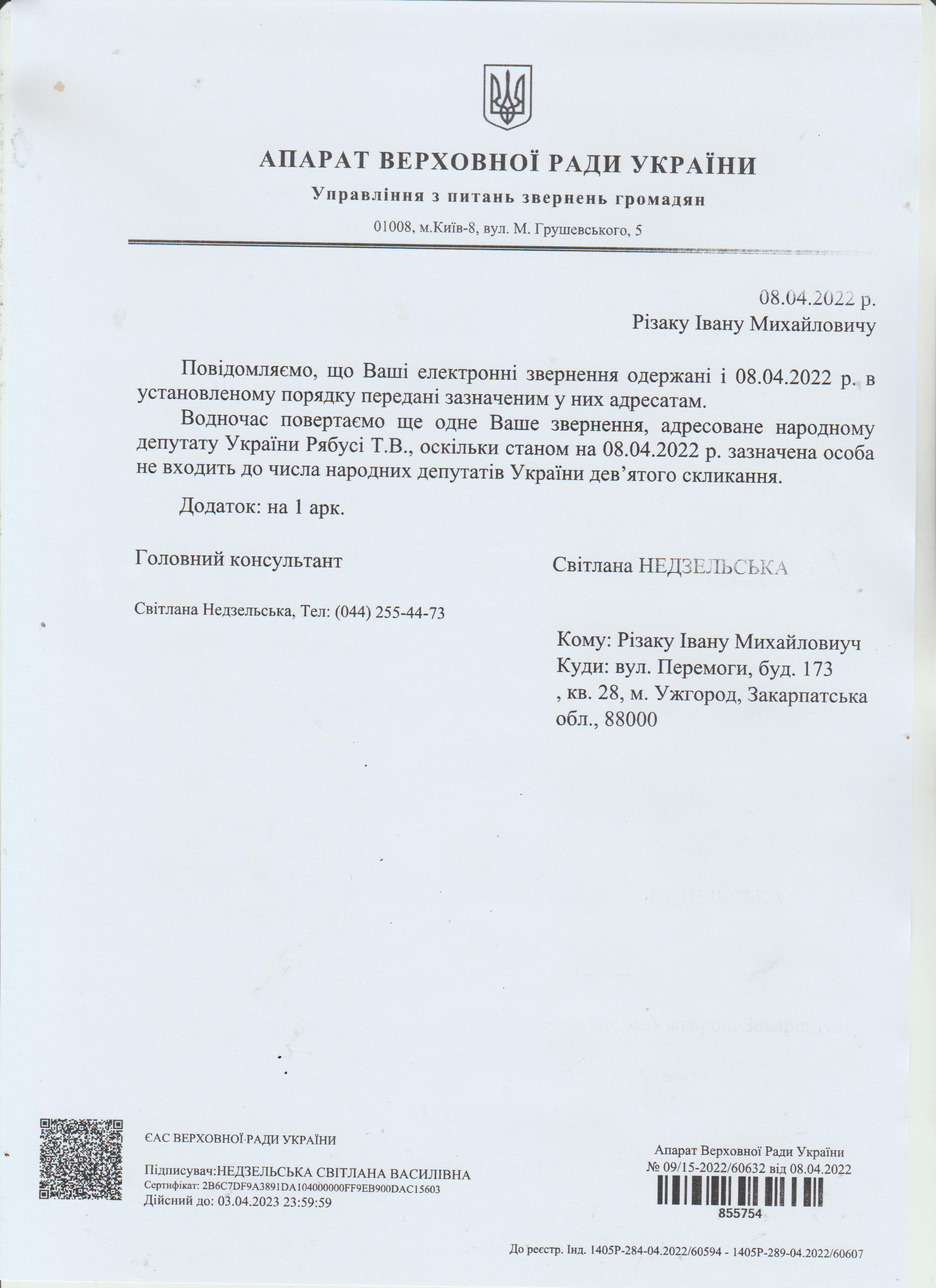 Шановні Анатолію Леонідовичу, Василю Дмитровичу, Василю Миколайовичу! Звертаюся до Вас як батько, як колишній керівник області, як простий житель цього краю, який хоче, щоб на цій землі ніколи не проливалася кров наших рідних, знайомих і близьких. Переконаний, що у політичного керівництва держави є достатньо волі для того, щоб поставити на місце «безпредельщиков», які пробують дестабілізувати ситуацію у державі. Переконаний, що події на кшталт помаранчевого терору у 2005 роців області більше не повторяться. З глибокою повагою, Різак Іван Михайлович, що проживає за адресою м. Ужгород, вул. Капушанська, б.173 кв. 28, голова Закарпатської обласної державної адміністрації (вересень 2002р. – січень 2005р.), народний депутат IV скликання, державний службовець І рангу, багаторічний голова і член координаційного комітету по боротьбі з організованою злочинністю при ОДА, кандидат фізико-математичних наук, тимчасово непрацюючий.