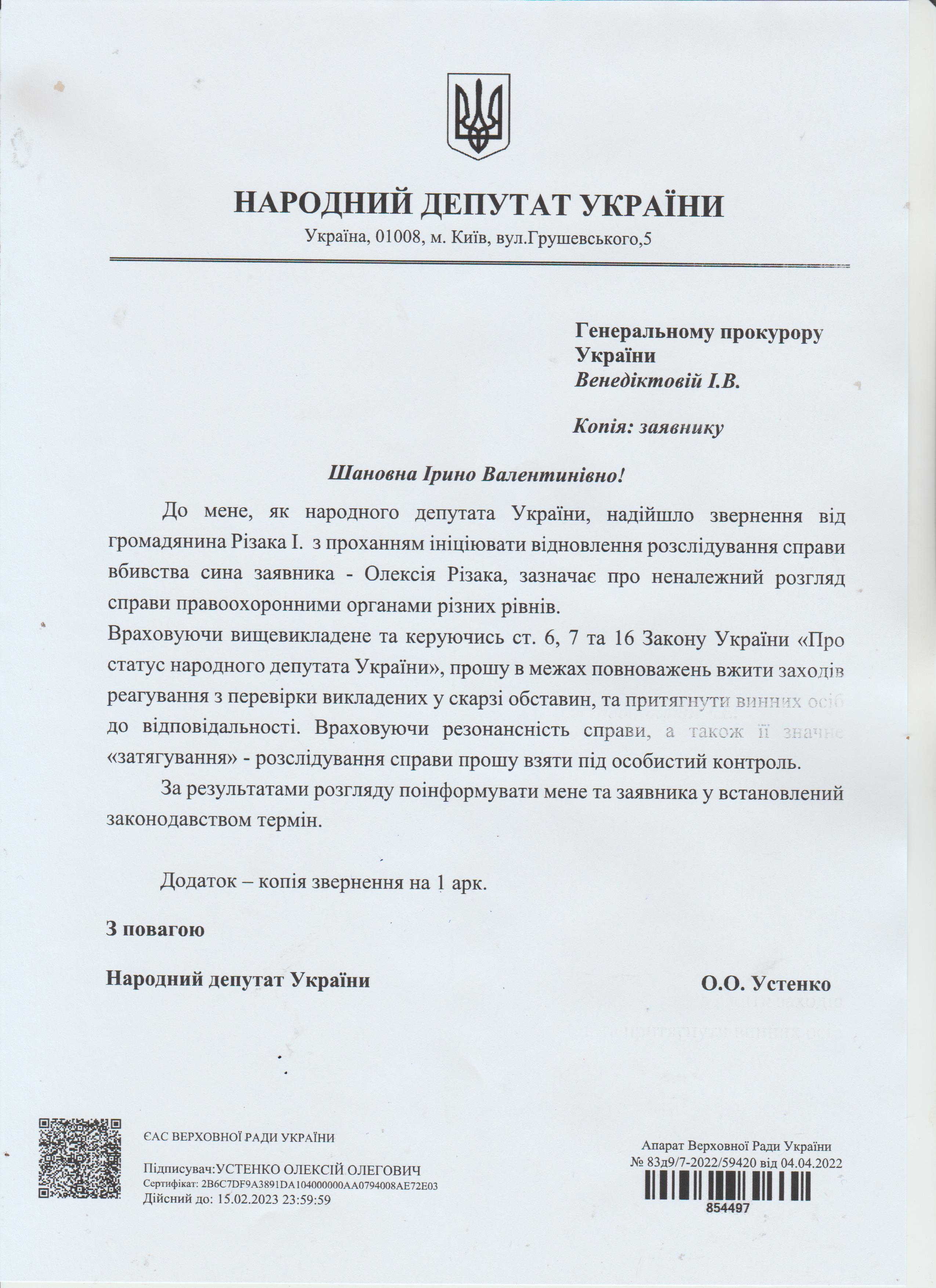 З метою сприяння слідству, а також всебічно об’єктивного розслідування справи прошу Вас доручити своїм підлеглим перевірити наступні питання: 1) чи міг володіти працівник ДПС в Закарпатській області Олексій Різак якоюсь інформацією про тіньовий та кримінальний бізнес в області, знання якої загрожувало б його життю? 2) перевірити у відповідних державних органах наявність у Різака Олексія Івановича та його близьких родичів майна, фінансів, земельних ділянок, підприємств, бізнесу, акцій, облігацій та інших цінних паперів, володіння якими могло б потенційно загрожувати його життю з боку конкурентів та інших співвласників? 3) чи були у нього відносини з громадянкою чи її родичами такими, що могли серйозно впливати на його майновий, матеріальний та ін. стан. 4) чи залучались до спеціальної перевірки, яку потрібно проходити при зарахуванні на державну службу, підрозділи зовнішнього спостереження якоїсь із правоохоронних структур області (я стверджую, що з часу переїзду мене в Закарпаття за нами було встановлене тотальне зовнішнє спостереження)? 5) хотілося б дізнатися (думаю, що це не є слідчою таємницею) в який час і з допомогою якого транспорту 16 листопада 2012 року виїхав син від своєї дівчини, чи проводжала вона його сама або з близькими родичами, чи бачила щось підозріле і яким таксі він виїжджав додому? 6) хотілося б також дізнатися хто першим побачив тіло вбитого юнака і повідомив швидку допомогу і міліцію? 7) з метою перевірки версії спроби отруєння сина Олексія, прошу дати на перевірку у спеціальну токсикологічну лабораторію результати трьох аналізів в «Астра-дія» і одного аналізу, проведеного в кардіодиспансері кілька тижнів тому.