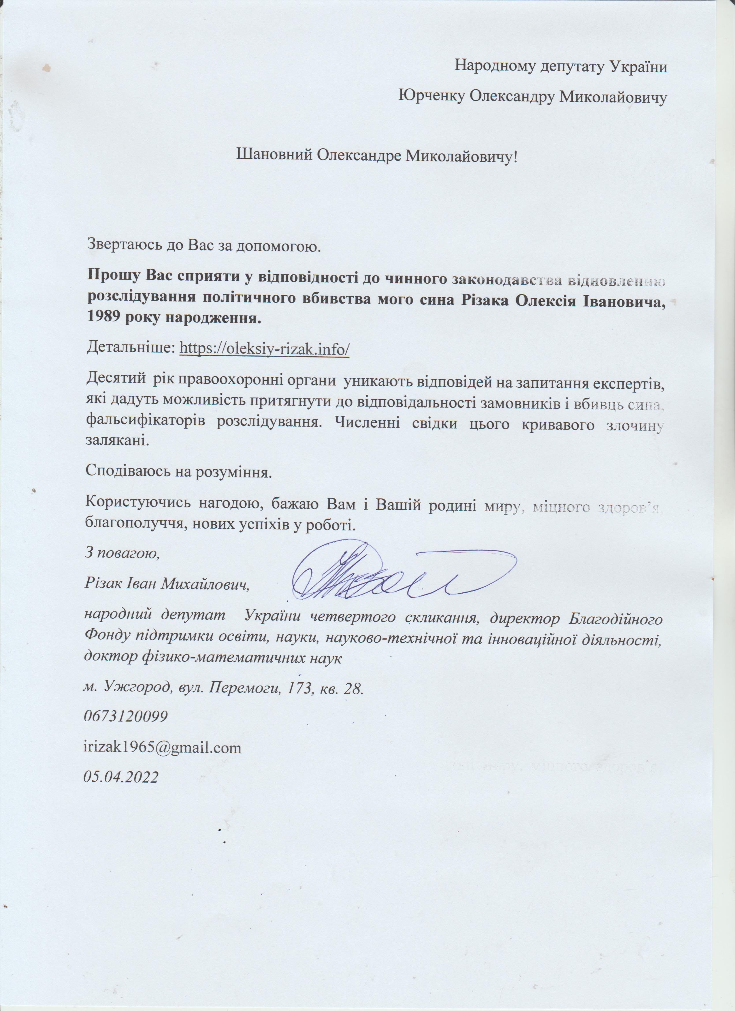 Це дає мені підстави говорити про те, що вбивство мого сина – чітко спланована спецоперація з відповідним інформаційним забезпеченням по своїм масштабам схожа на гебельсівську пропаганду. На час поширення цієї версії загибелі сина не було жодної, підкреслюю жодної, підстави говорити про самогубство, оскільки на той час слідчі не знайшли і сліду падіння з багатоповерхівки Олексія Різака, а також не провели жодної слідчої дії з громадянкою із-за «нещасливої» любові до якої мій син закінчив життя самогубством. Щиро прошу Вас, в найближчі години перекваліфікувати цю трагедію за статею КПК «вбивство» і всебічно, об’єктивно та системно провести відповідні слідчі дії для знаходження впливових замовників і звірів-вбивць мого рідного сина. Коротко Вас проінформую, що Різак Олексій Іванович, 1989 р.н., магістр фінансів (закінчив економічний факультет Харківського національного університету імені В.Н. Каразіна з відзнакою), магістр – юрист (закінчив магістратуру національного університету «Юридична академія України імені Ярослава Мудрого»), має військове звання – молодший лейтенант запасу, працював головним державним податковим інспектором першого рангу ДПС у Закарпатській області. Активно займався спортом. У свій час виступав за юнацьку збірну України з футболу, професійний клуб ФК «Закарпаття». На сьогоднішній день виступав за збірну ДПС у Закарпатській області, щоденно займався фізкультурою (для прикладу скажу, щоранку віджимався до 500 разів, а кількість ранкових стрибків на скакалці сягала 2000 разів, разом зі мною освоював східні єдиноборства), мав щирі відносини із дівчиною, колегами по роботі, був серйозним і відповідальним фахівцем. Додам також, що за півтори години до знаходження його тіла я спілкувався з ним особисто по телефону і обговорював подробиці матчу чемпіонату Італії з футболу Мілан – Фіорентина, під час цієї розмови ми обговорили майбутню поїздку у Київ, а також похід у гості до знайомих. Переконаний, нічого не могло статися за ці півтори години після нашої доброї розмови з почуттям гумору і присутності його дівчини, якій я передав вітання.