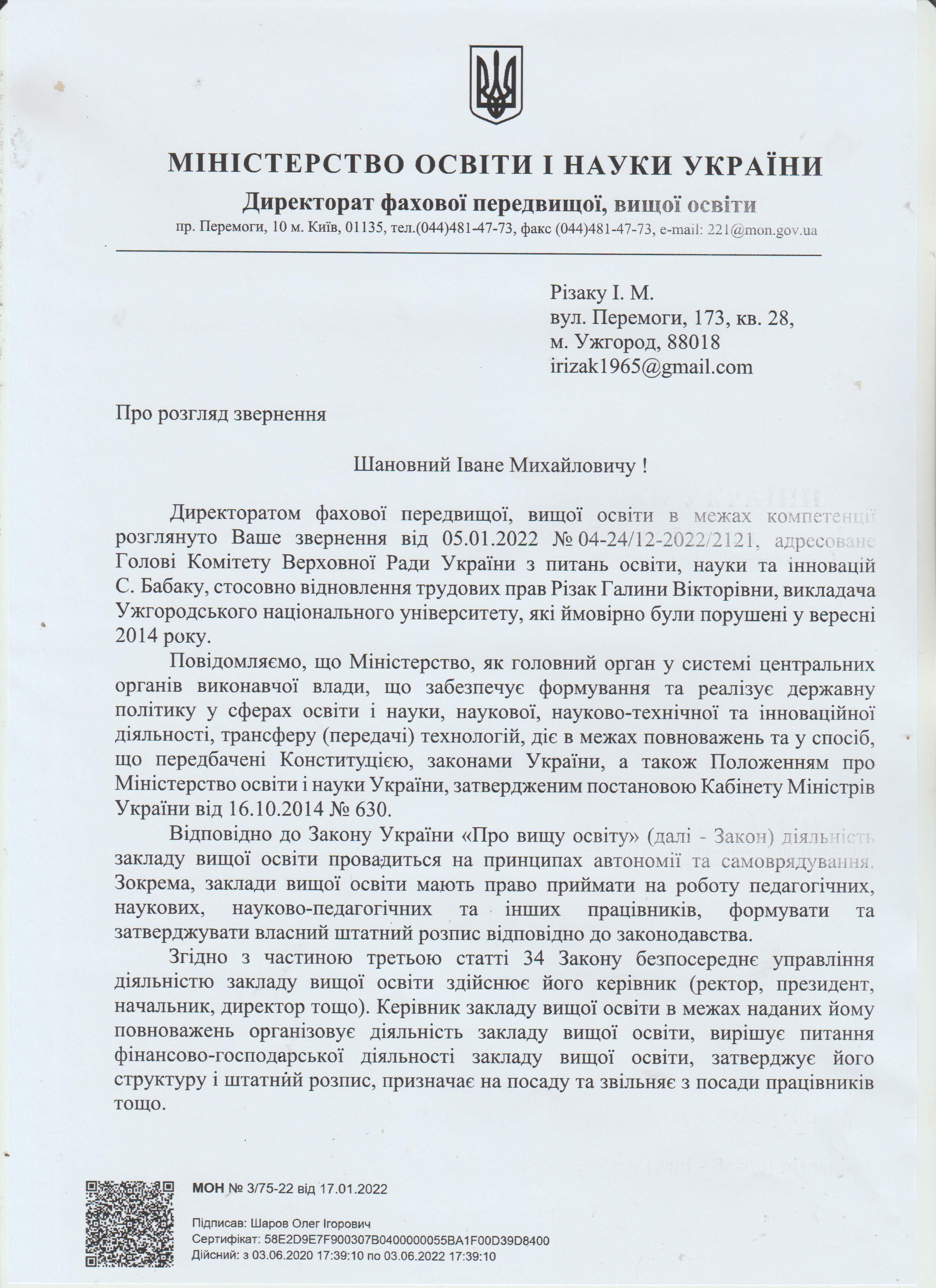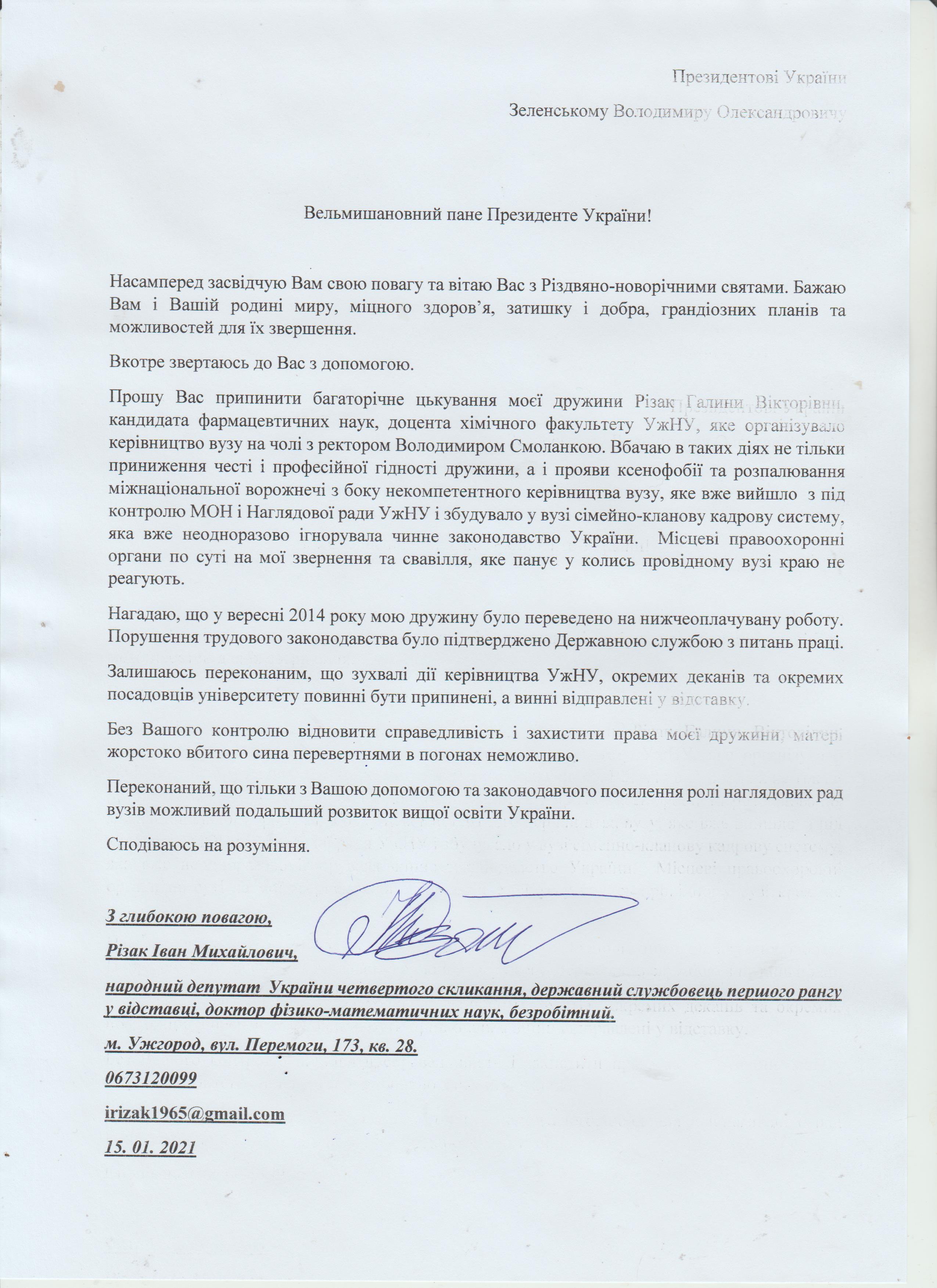 Шановні Анатолію Леонідовичу, Василю Дмитровичу, Василю Миколайовичу! Звертаюся до Вас як батько, як колишній керівник області, як простий житель цього краю, який хоче, щоб на цій землі ніколи не проливалася кров наших рідних, знайомих і близьких. Переконаний, що у політичного керівництва держави є достатньо волі для того, щоб поставити на місце «безпредельщиков», які пробують дестабілізувати ситуацію у державі. Переконаний, що події на кшталт помаранчевого терору у 2005 роців області більше не повторяться. З глибокою повагою, Різак Іван Михайлович, що проживає за адресою м. Ужгород, вул. Капушанська, б.173 кв. 28, голова Закарпатської обласної державної адміністрації (вересень 2002р. – січень 2005р.), народний депутат IV скликання, державний службовець І рангу, багаторічний голова і член координаційного комітету по боротьбі з організованою злочинністю при ОДА, кандидат фізико-математичних наук, тимчасово непрацюючий.