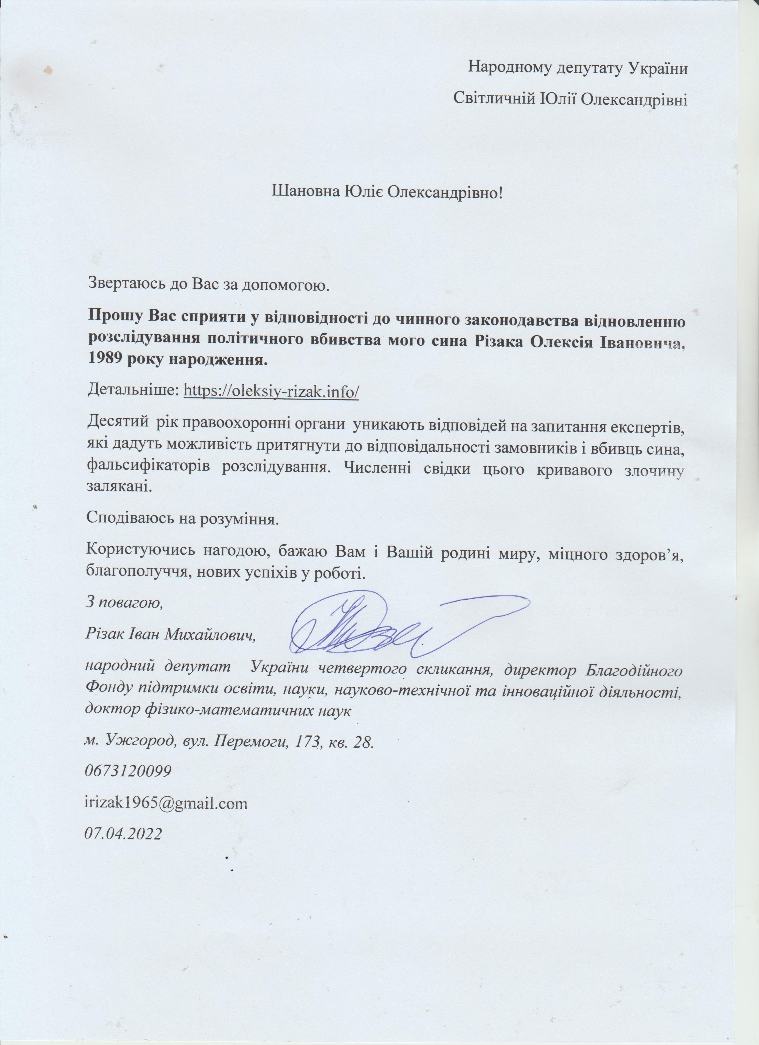 З метою сприяння слідству, а також всебічно об’єктивного розслідування справи прошу Вас доручити своїм підлеглим перевірити наступні питання: 1) чи міг володіти працівник ДПС в Закарпатській області Олексій Різак якоюсь інформацією про тіньовий та кримінальний бізнес в області, знання якої загрожувало б його життю? 2) перевірити у відповідних державних органах наявність у Різака Олексія Івановича та його близьких родичів майна, фінансів, земельних ділянок, підприємств, бізнесу, акцій, облігацій та інших цінних паперів, володіння якими могло б потенційно загрожувати його життю з боку конкурентів та інших співвласників? 3) чи були у нього відносини з громадянкою чи її родичами такими, що могли серйозно впливати на його майновий, матеріальний та ін. стан. 4) чи залучались до спеціальної перевірки, яку потрібно проходити при зарахуванні на державну службу, підрозділи зовнішнього спостереження якоїсь із правоохоронних структур області (я стверджую, що з часу переїзду мене в Закарпаття за нами було встановлене тотальне зовнішнє спостереження)? 5) хотілося б дізнатися (думаю, що це не є слідчою таємницею) в який час і з допомогою якого транспорту 16 листопада 2012 року виїхав син від своєї дівчини, чи проводжала вона його сама або з близькими родичами, чи бачила щось підозріле і яким таксі він виїжджав додому? 6) хотілося б також дізнатися хто першим побачив тіло вбитого юнака і повідомив швидку допомогу і міліцію? 7) з метою перевірки версії спроби отруєння сина Олексія, прошу дати на перевірку у спеціальну токсикологічну лабораторію результати трьох аналізів в «Астра-дія» і одного аналізу, проведеного в кардіодиспансері кілька тижнів тому.