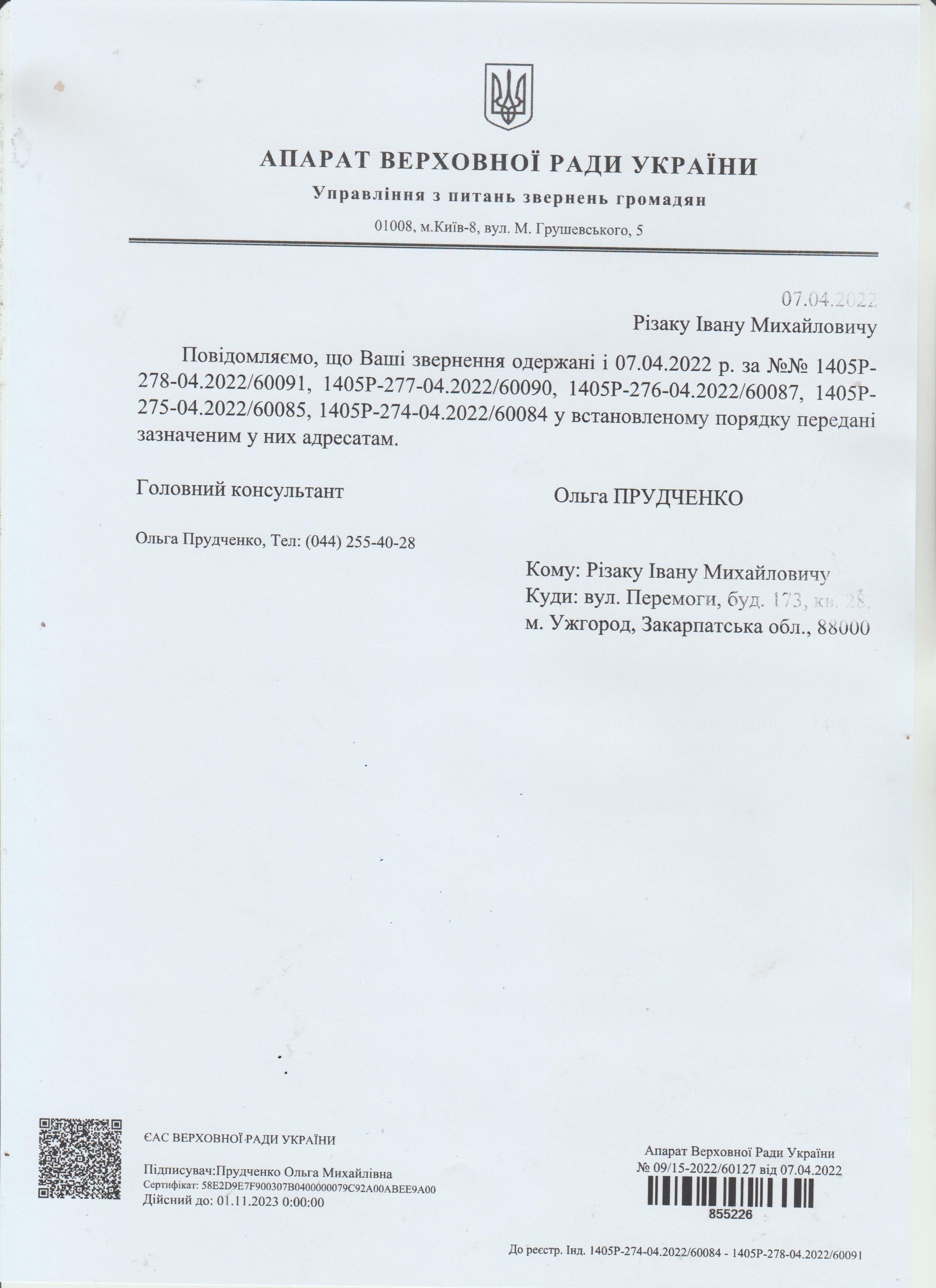 Шановні Анатолію Леонідовичу, Василю Дмитровичу, Василю Миколайовичу! Звертаюся до Вас як батько, як колишній керівник області, як простий житель цього краю, який хоче, щоб на цій землі ніколи не проливалася кров наших рідних, знайомих і близьких. Переконаний, що у політичного керівництва держави є достатньо волі для того, щоб поставити на місце «безпредельщиков», які пробують дестабілізувати ситуацію у державі. Переконаний, що події на кшталт помаранчевого терору у 2005 роців області більше не повторяться. З глибокою повагою, Різак Іван Михайлович, що проживає за адресою м. Ужгород, вул. Капушанська, б.173 кв. 28, голова Закарпатської обласної державної адміністрації (вересень 2002р. – січень 2005р.), народний депутат IV скликання, державний службовець І рангу, багаторічний голова і член координаційного комітету по боротьбі з організованою злочинністю при ОДА, кандидат фізико-математичних наук, тимчасово непрацюючий.