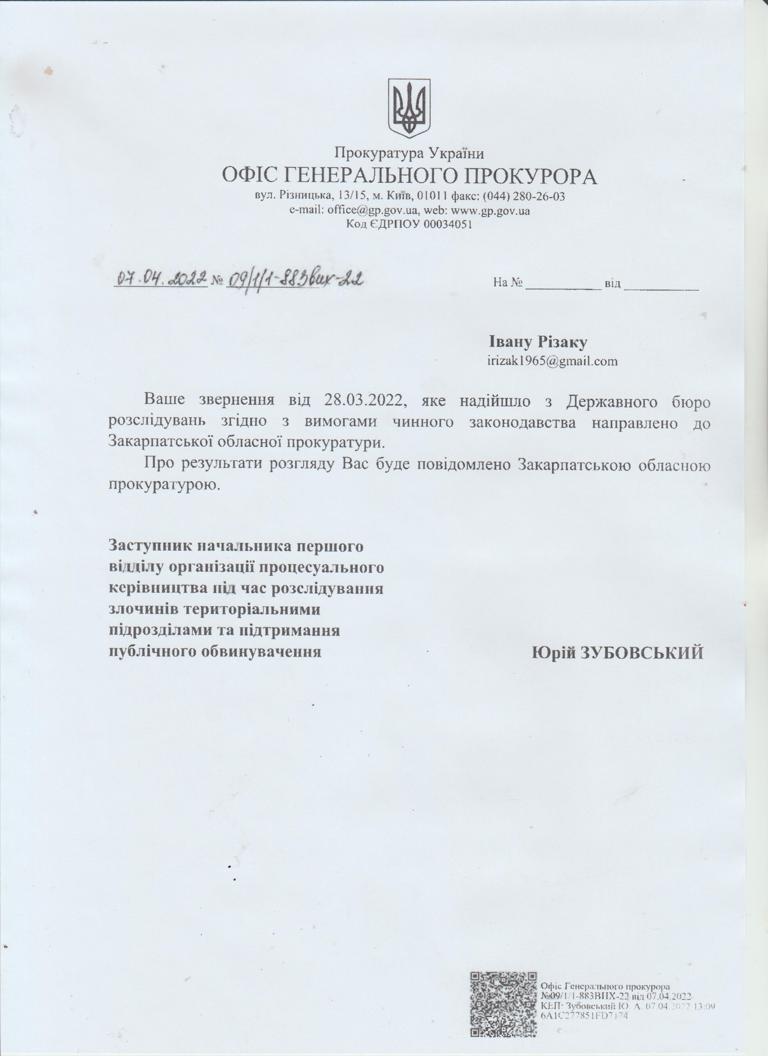 За паспортом це був Різак Олексій Іванович. Телефонограма у прокуратуру, за словами Лазура Ярослава Володимировича, прийшла приблизно о 20 год. 45 хв.