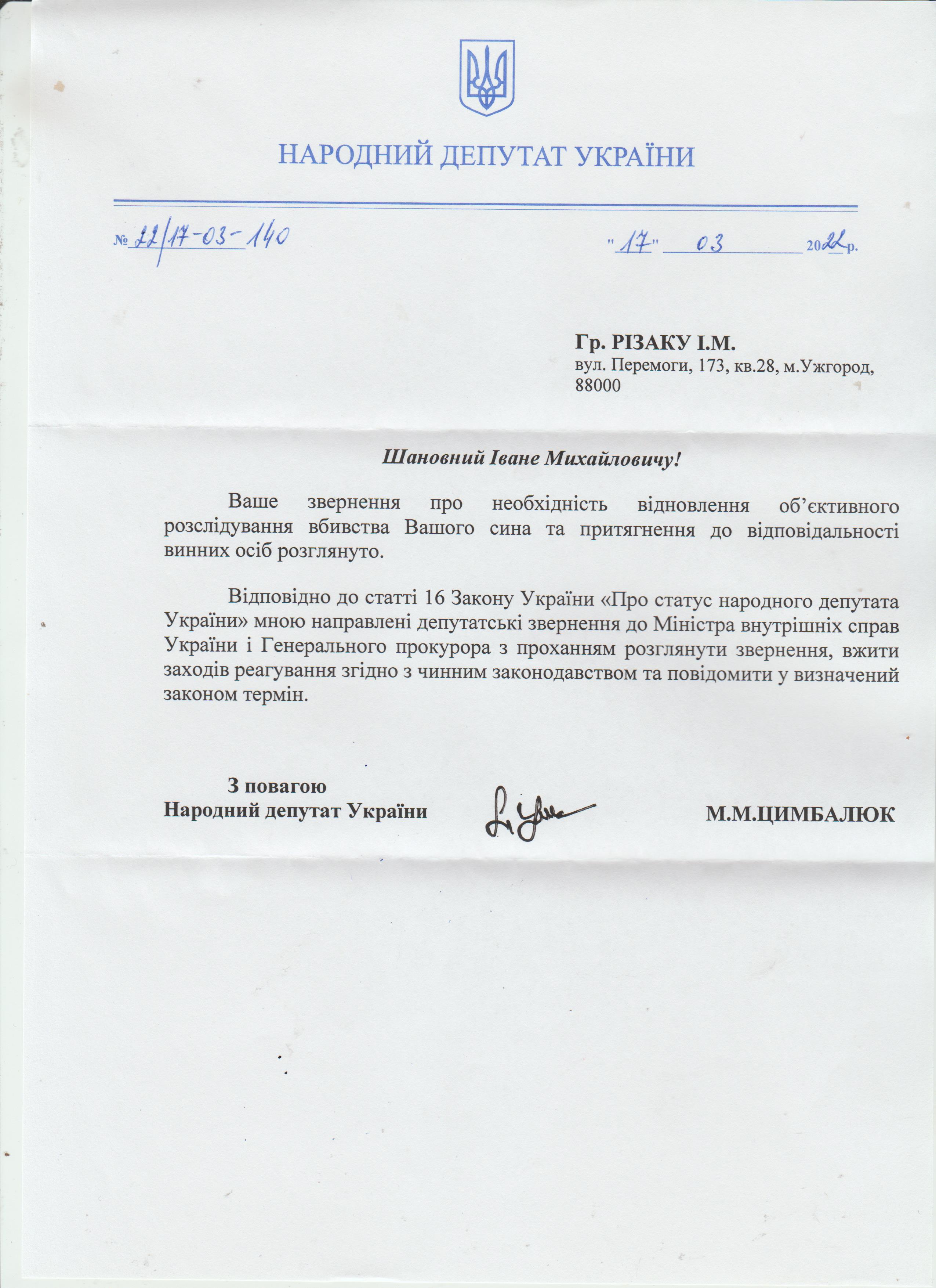 З тексту Постанови випливає, що факти, викладені у нижче наведеному листі Різака В.М. до начальника УМВС України в Закарпатській області генерала міліції Варцаби В.М. слідчим повністю проігноровані.