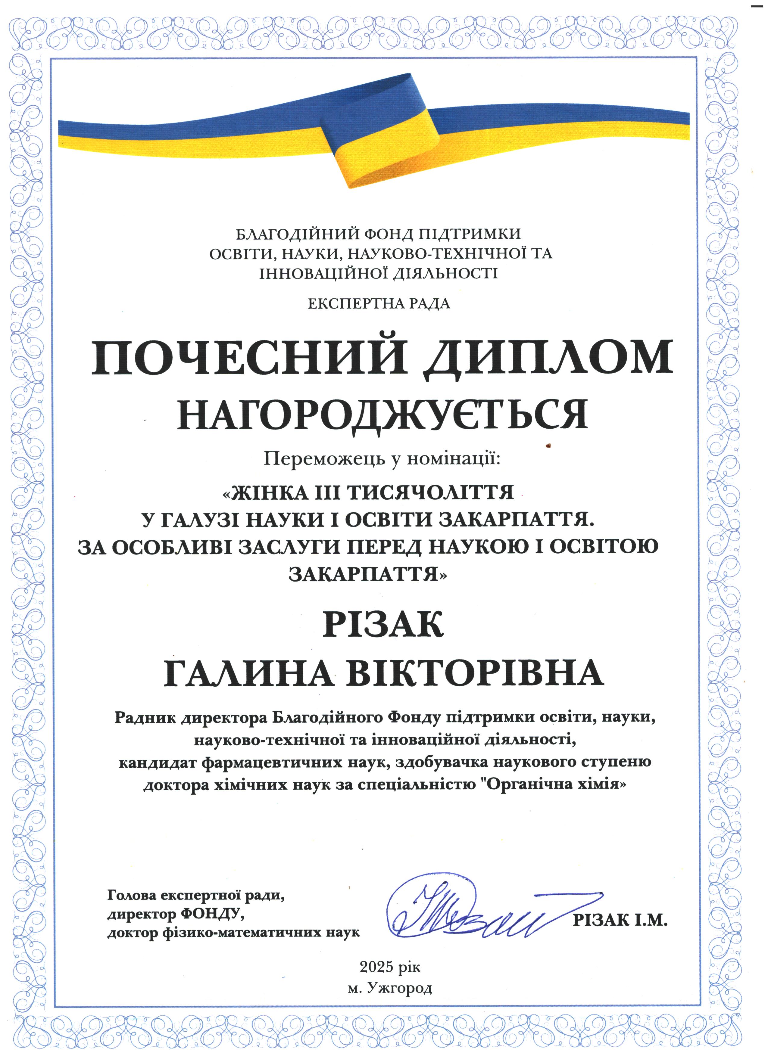 Різак Галина Вікторівна, відома вчена у галузі органічної хімії, Радник директора Благодійного Фонду підтримки освіти, науки, науково-технічної та інноваційної діяльності, кандидат фармацевтичних наук, здобувачка наукового ступеню доктора хімічних наук за спеціальністю "Органічна хімія"