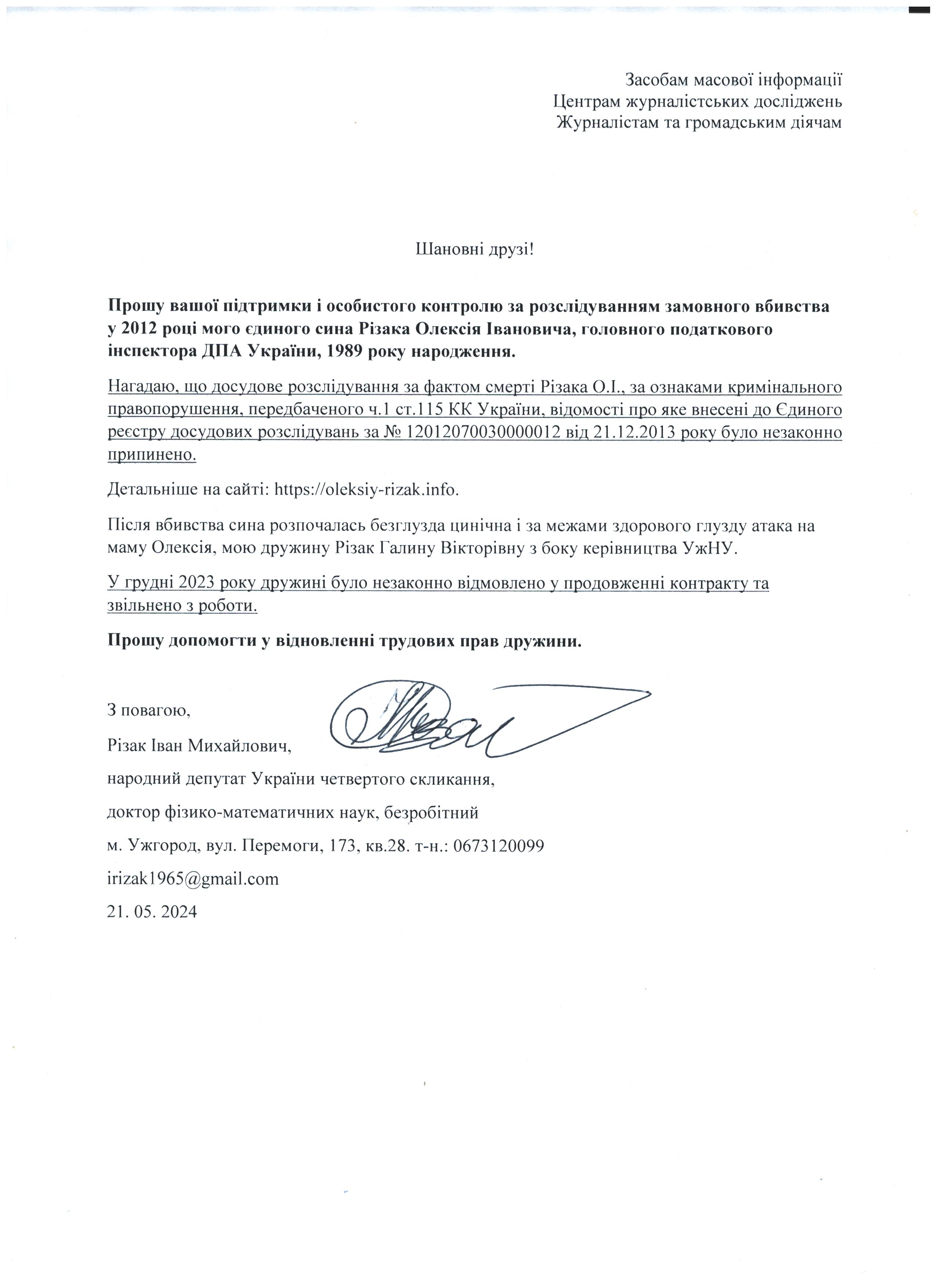 Це дає мені підстави говорити про те, що вбивство мого сина – чітко спланована спецоперація з відповідним інформаційним забезпеченням по своїм масштабам схожа на гебельсівську пропаганду. На час поширення цієї версії загибелі сина не було жодної, підкреслюю жодної, підстави говорити про самогубство, оскільки на той час слідчі не знайшли і сліду падіння з багатоповерхівки Олексія Різака, а також не провели жодної слідчої дії з громадянкою із-за «нещасливої» любові до якої мій син закінчив життя самогубством. Щиро прошу Вас, в найближчі години перекваліфікувати цю трагедію за статею КПК «вбивство» і всебічно, об’єктивно та системно провести відповідні слідчі дії для знаходження впливових замовників і звірів-вбивць мого рідного сина. Коротко Вас проінформую, що Різак Олексій Іванович, 1989 р.н., магістр фінансів (закінчив економічний факультет Харківського національного університету імені В.Н. Каразіна з відзнакою), магістр – юрист (закінчив магістратуру національного університету «Юридична академія України імені Ярослава Мудрого»), має військове звання – молодший лейтенант запасу, працював головним державним податковим інспектором першого рангу ДПС у Закарпатській області. Активно займався спортом. У свій час виступав за юнацьку збірну України з футболу, професійний клуб ФК «Закарпаття». На сьогоднішній день виступав за збірну ДПС у Закарпатській області, щоденно займався фізкультурою (для прикладу скажу, щоранку віджимався до 500 разів, а кількість ранкових стрибків на скакалці сягала 2000 разів, разом зі мною освоював східні єдиноборства), мав щирі відносини із дівчиною, колегами по роботі, був серйозним і відповідальним фахівцем. Додам також, що за півтори години до знаходження його тіла я спілкувався з ним особисто по телефону і обговорював подробиці матчу чемпіонату Італії з футболу Мілан – Фіорентина, під час цієї розмови ми обговорили майбутню поїздку у Київ, а також похід у гості до знайомих. Переконаний, нічого не могло статися за ці півтори години після нашої доброї розмови з почуттям гумору і присутності його дівчини, якій я передав вітання.