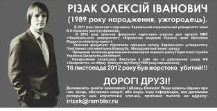 Звертаюся до Вас у зв’язку з тим,що близько двох тижнів тому при невідомих обставинах був убитий єдиний мій син – Олексій Іванович Різак, 1989 р.н. Перш за все, був дуже здивований повідомленням прес-центру УМВС в той же вечір, а також поширенням багатьма ЗМІ інформації про те, що основною причиною трагічної загибелі мого сина є самогубство.