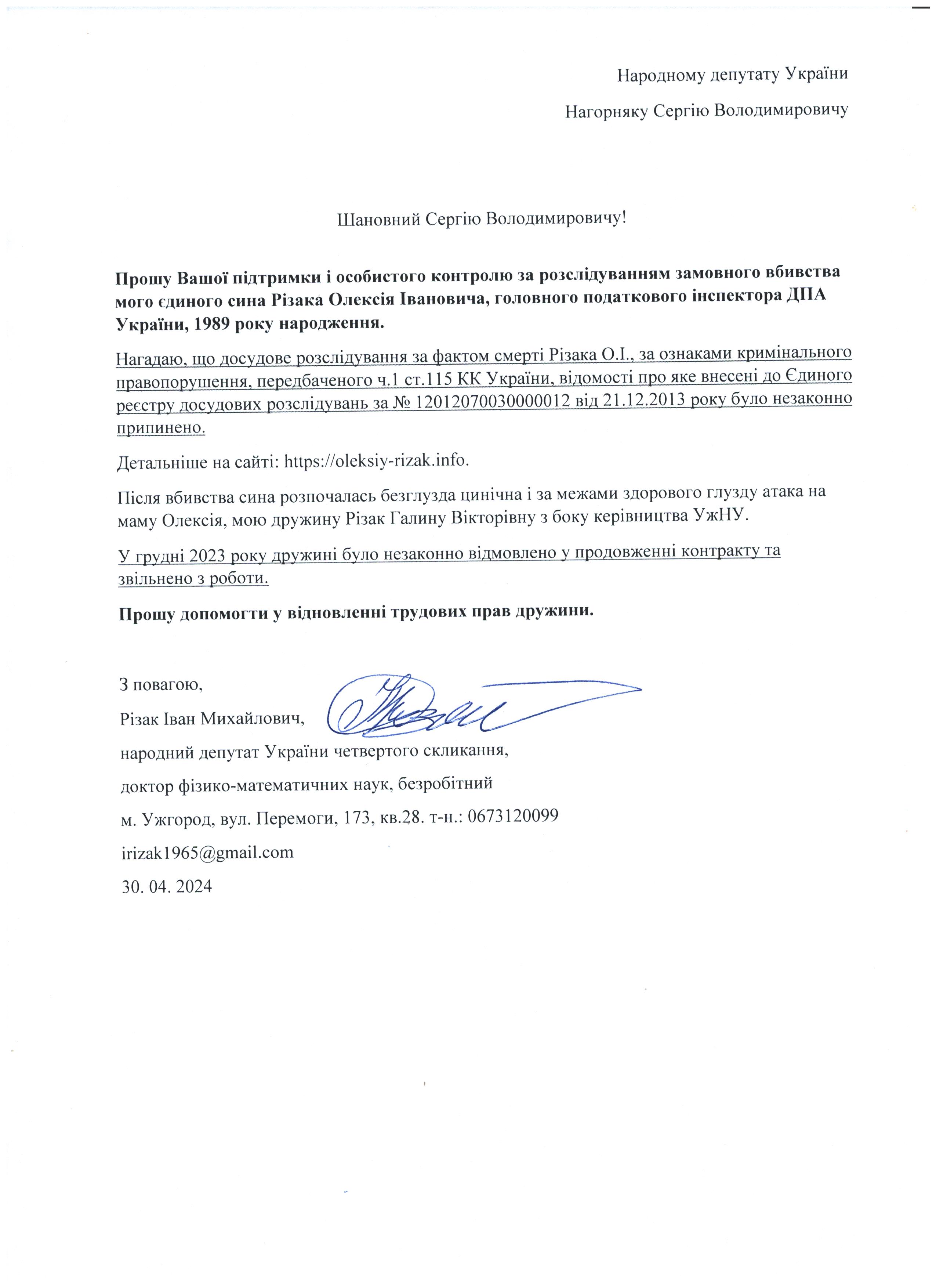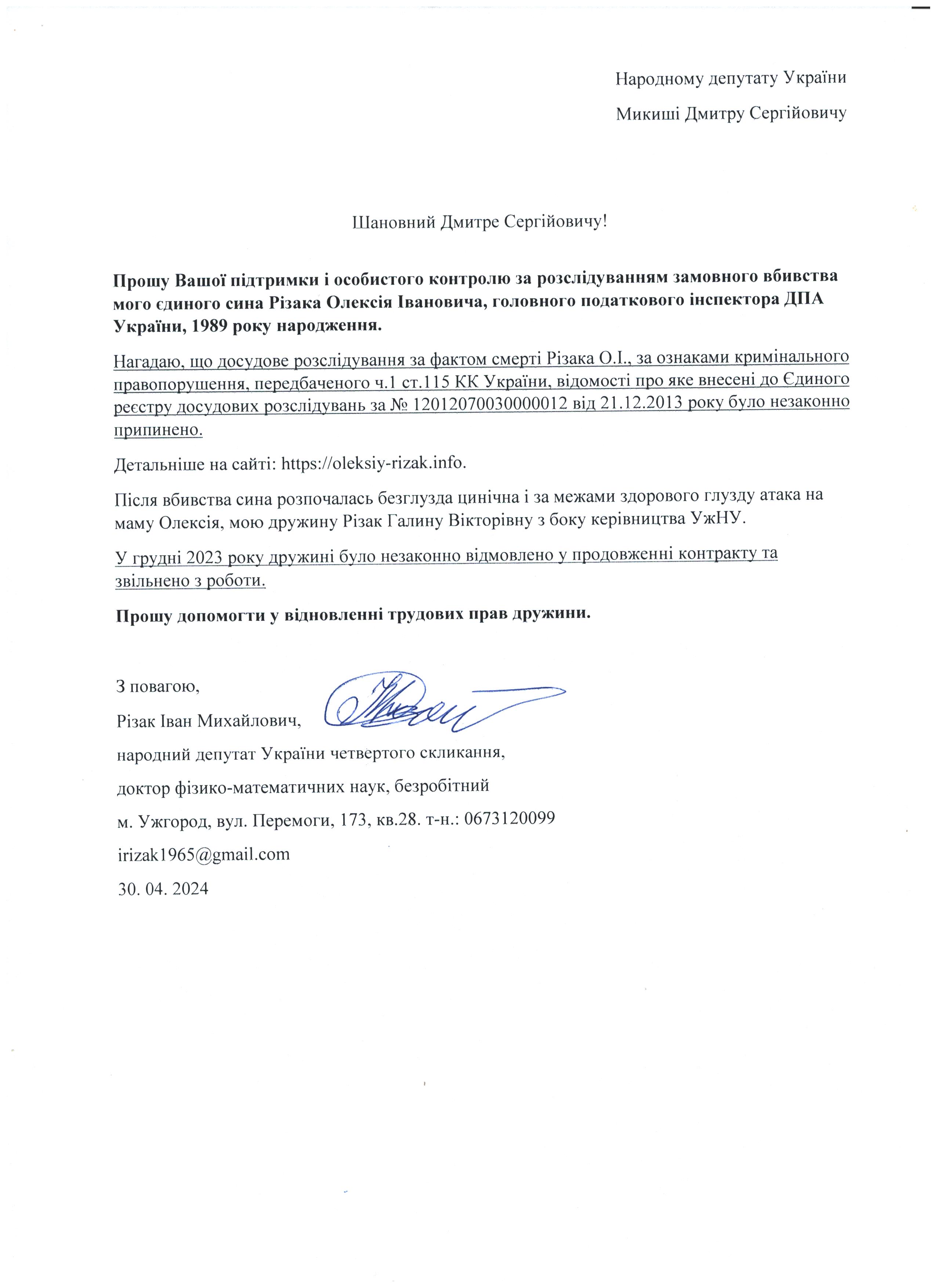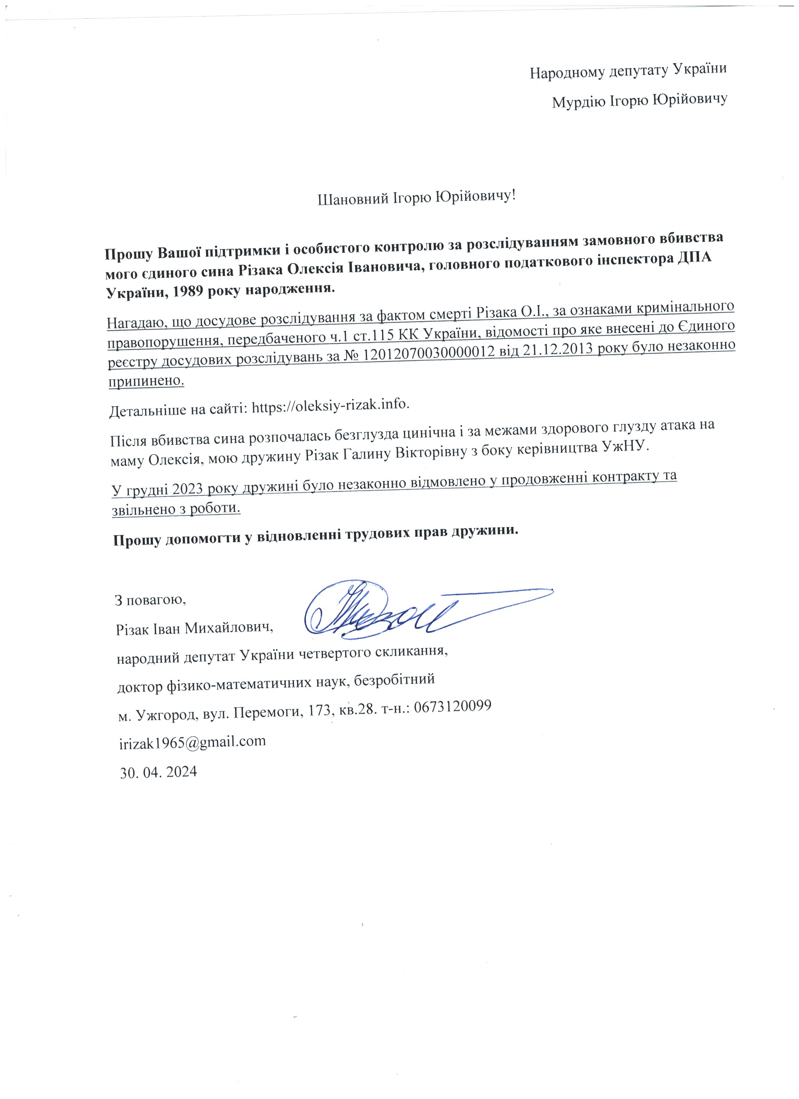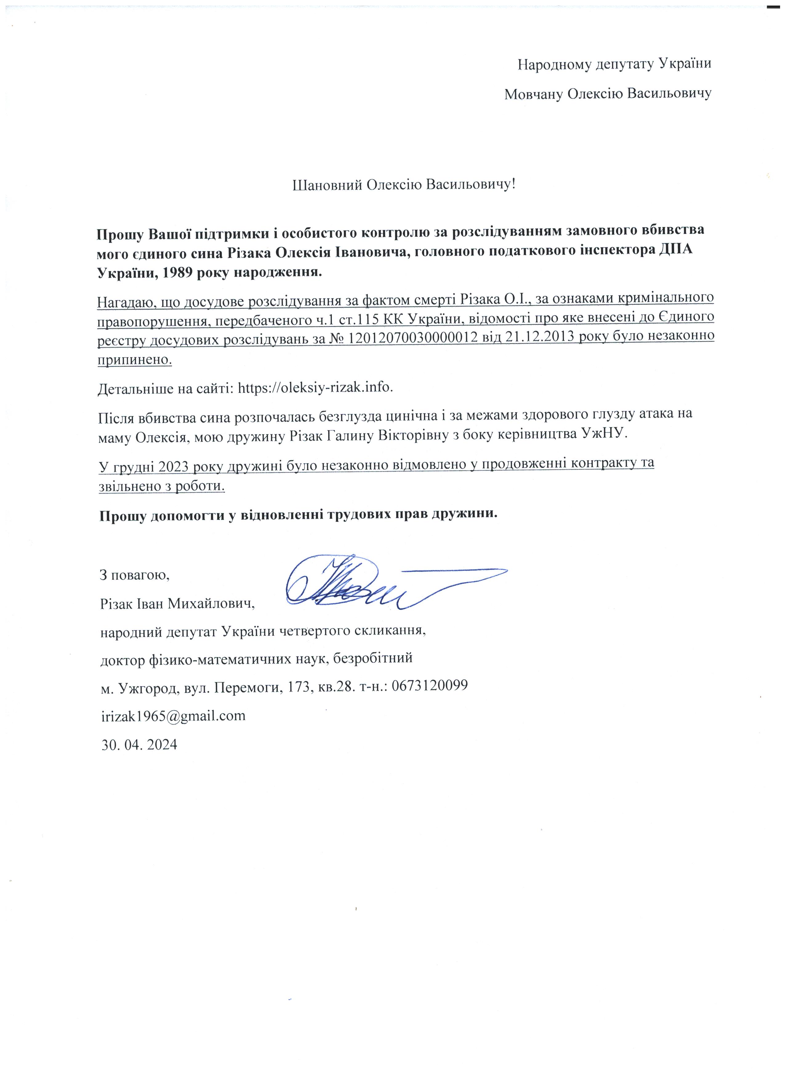 Це дає мені підстави говорити про те, що вбивство мого сина – чітко спланована спецоперація з відповідним інформаційним забезпеченням по своїм масштабам схожа на гебельсівську пропаганду. На час поширення цієї версії загибелі сина не було жодної, підкреслюю жодної, підстави говорити про самогубство, оскільки на той час слідчі не знайшли і сліду падіння з багатоповерхівки Олексія Різака, а також не провели жодної слідчої дії з громадянкою із-за «нещасливої» любові до якої мій син закінчив життя самогубством. Щиро прошу Вас, в найближчі години перекваліфікувати цю трагедію за статею КПК «вбивство» і всебічно, об’єктивно та системно провести відповідні слідчі дії для знаходження впливових замовників і звірів-вбивць мого рідного сина. Коротко Вас проінформую, що Різак Олексій Іванович, 1989 р.н., магістр фінансів (закінчив економічний факультет Харківського національного університету імені В.Н. Каразіна з відзнакою), магістр – юрист (закінчив магістратуру національного університету «Юридична академія України імені Ярослава Мудрого»), має військове звання – молодший лейтенант запасу, працював головним державним податковим інспектором першого рангу ДПС у Закарпатській області. Активно займався спортом. У свій час виступав за юнацьку збірну України з футболу, професійний клуб ФК «Закарпаття». На сьогоднішній день виступав за збірну ДПС у Закарпатській області, щоденно займався фізкультурою (для прикладу скажу, щоранку віджимався до 500 разів, а кількість ранкових стрибків на скакалці сягала 2000 разів, разом зі мною освоював східні єдиноборства), мав щирі відносини із дівчиною, колегами по роботі, був серйозним і відповідальним фахівцем. Додам також, що за півтори години до знаходження його тіла я спілкувався з ним особисто по телефону і обговорював подробиці матчу чемпіонату Італії з футболу Мілан – Фіорентина, під час цієї розмови ми обговорили майбутню поїздку у Київ, а також похід у гості до знайомих. Переконаний, нічого не могло статися за ці півтори години після нашої доброї розмови з почуттям гумору і присутності його дівчини, якій я передав вітання.