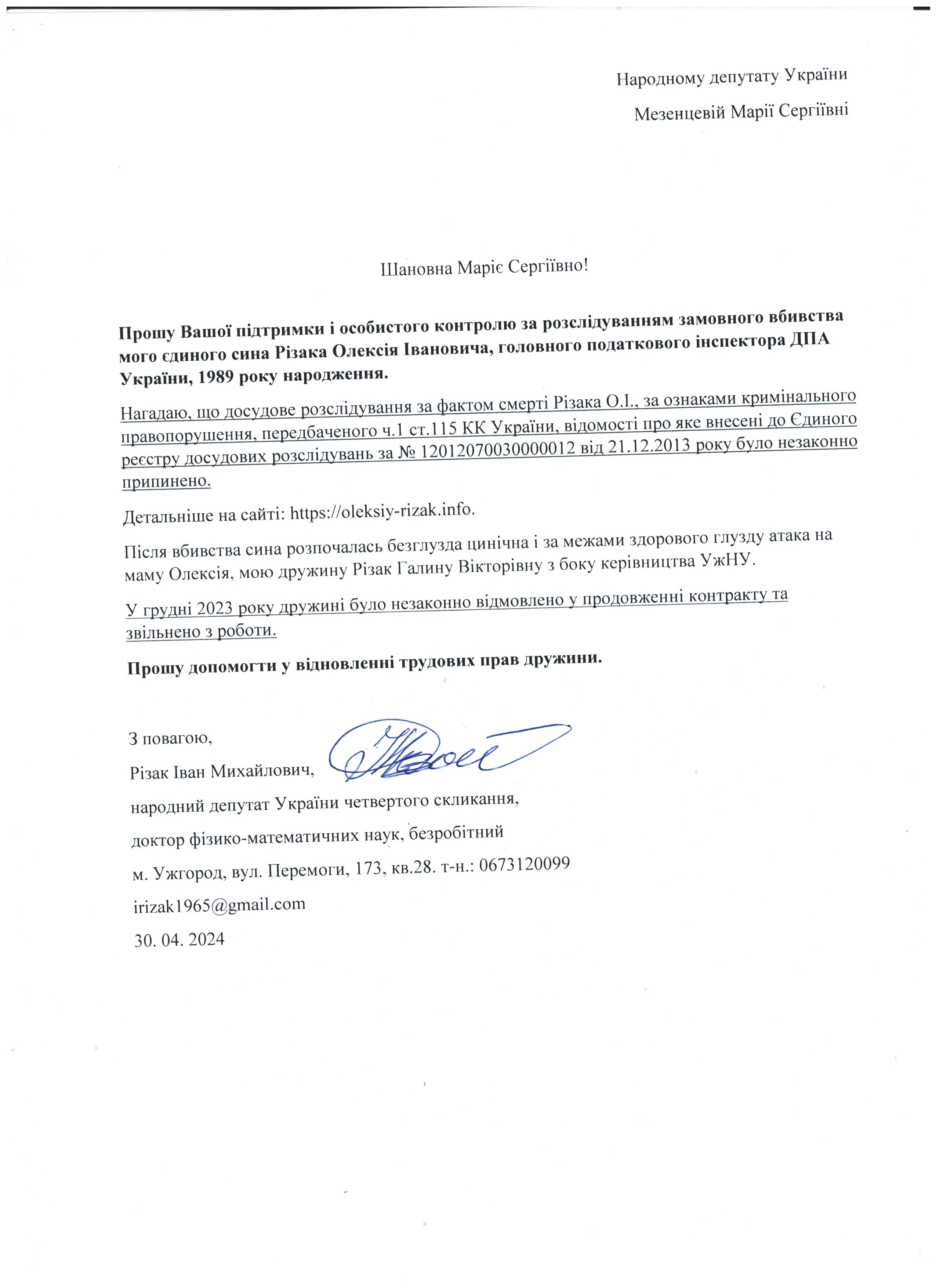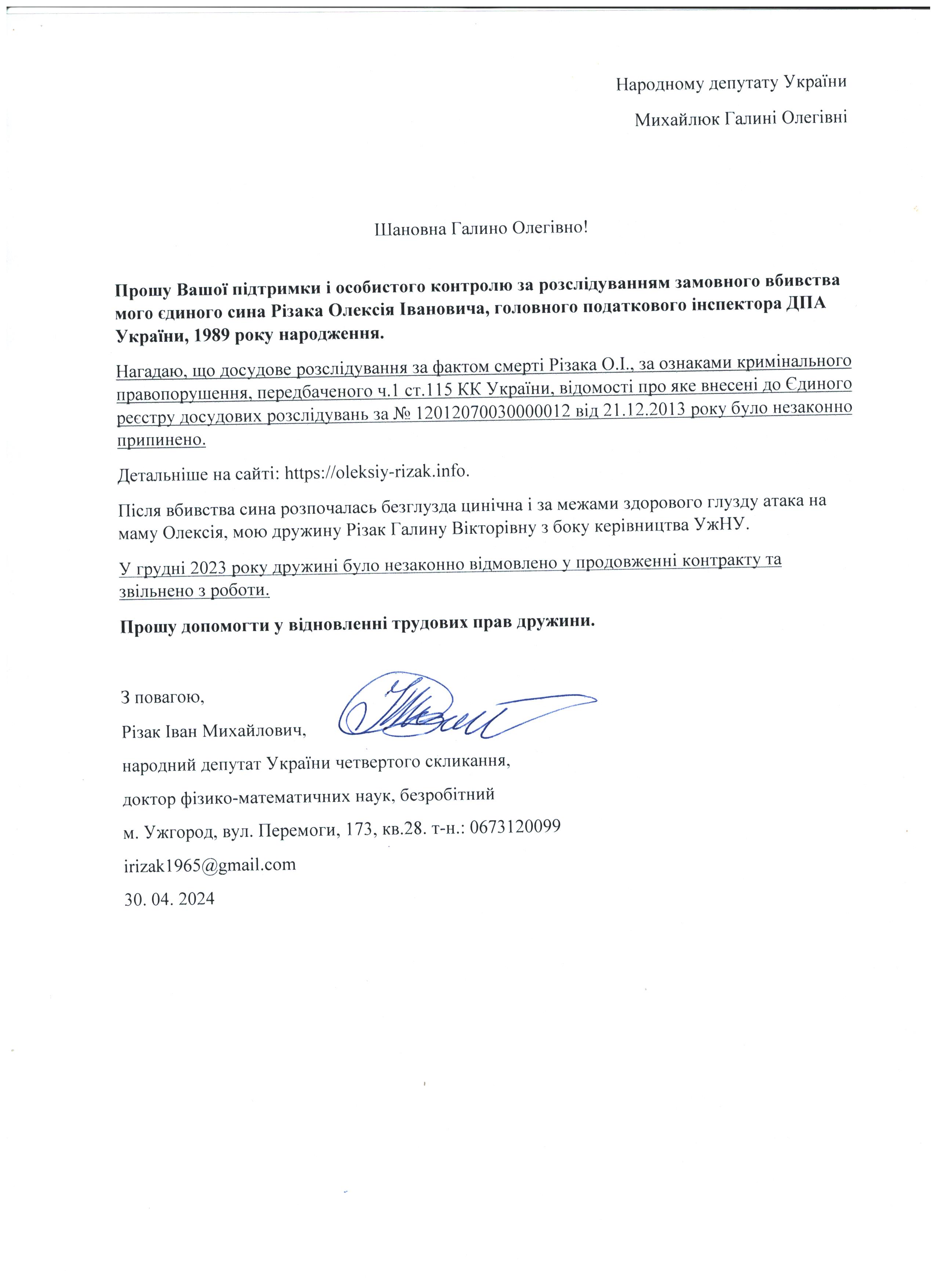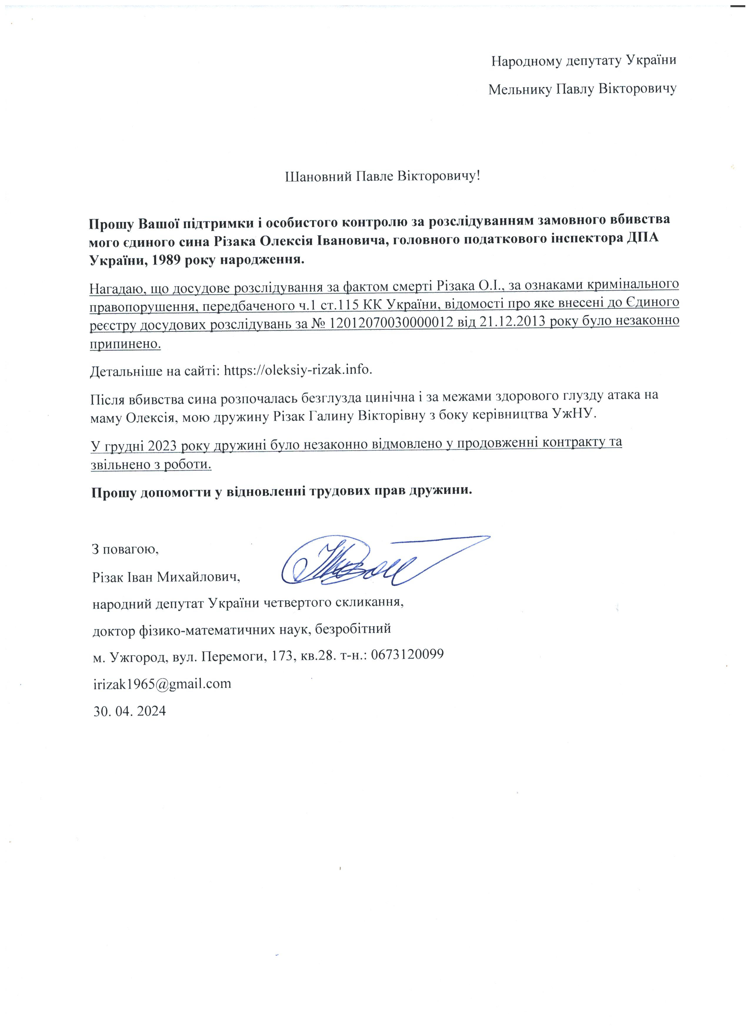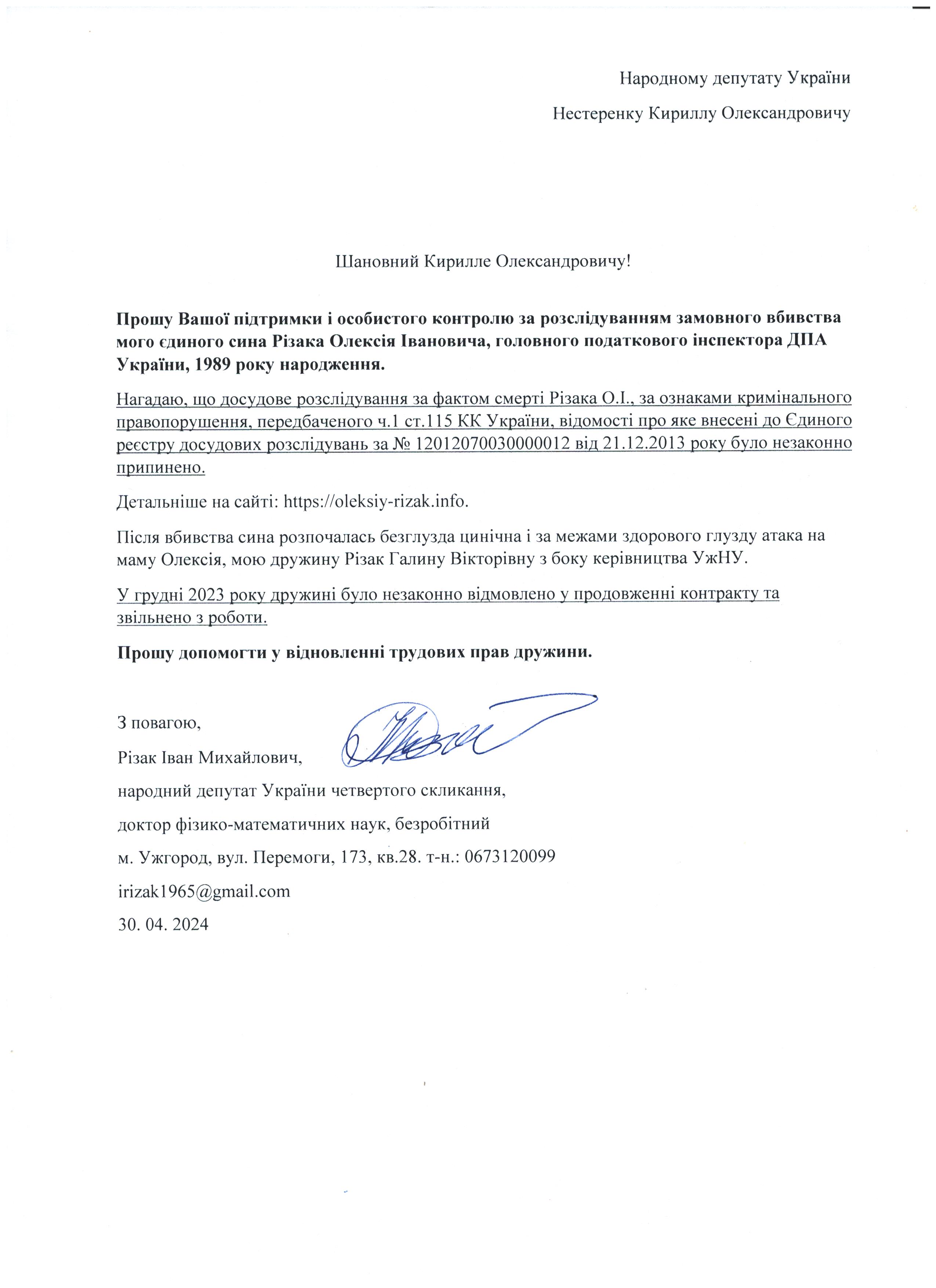 Це дає мені підстави говорити про те, що вбивство мого сина – чітко спланована спецоперація з відповідним інформаційним забезпеченням по своїм масштабам схожа на гебельсівську пропаганду. На час поширення цієї версії загибелі сина не було жодної, підкреслюю жодної, підстави говорити про самогубство, оскільки на той час слідчі не знайшли і сліду падіння з багатоповерхівки Олексія Різака, а також не провели жодної слідчої дії з громадянкою із-за «нещасливої» любові до якої мій син закінчив життя самогубством. Щиро прошу Вас, в найближчі години перекваліфікувати цю трагедію за статею КПК «вбивство» і всебічно, об’єктивно та системно провести відповідні слідчі дії для знаходження впливових замовників і звірів-вбивць мого рідного сина. Коротко Вас проінформую, що Різак Олексій Іванович, 1989 р.н., магістр фінансів (закінчив економічний факультет Харківського національного університету імені В.Н. Каразіна з відзнакою), магістр – юрист (закінчив магістратуру національного університету «Юридична академія України імені Ярослава Мудрого»), має військове звання – молодший лейтенант запасу, працював головним державним податковим інспектором першого рангу ДПС у Закарпатській області. Активно займався спортом. У свій час виступав за юнацьку збірну України з футболу, професійний клуб ФК «Закарпаття». На сьогоднішній день виступав за збірну ДПС у Закарпатській області, щоденно займався фізкультурою (для прикладу скажу, щоранку віджимався до 500 разів, а кількість ранкових стрибків на скакалці сягала 2000 разів, разом зі мною освоював східні єдиноборства), мав щирі відносини із дівчиною, колегами по роботі, був серйозним і відповідальним фахівцем. Додам також, що за півтори години до знаходження його тіла я спілкувався з ним особисто по телефону і обговорював подробиці матчу чемпіонату Італії з футболу Мілан – Фіорентина, під час цієї розмови ми обговорили майбутню поїздку у Київ, а також похід у гості до знайомих. Переконаний, нічого не могло статися за ці півтори години після нашої доброї розмови з почуттям гумору і присутності його дівчини, якій я передав вітання.