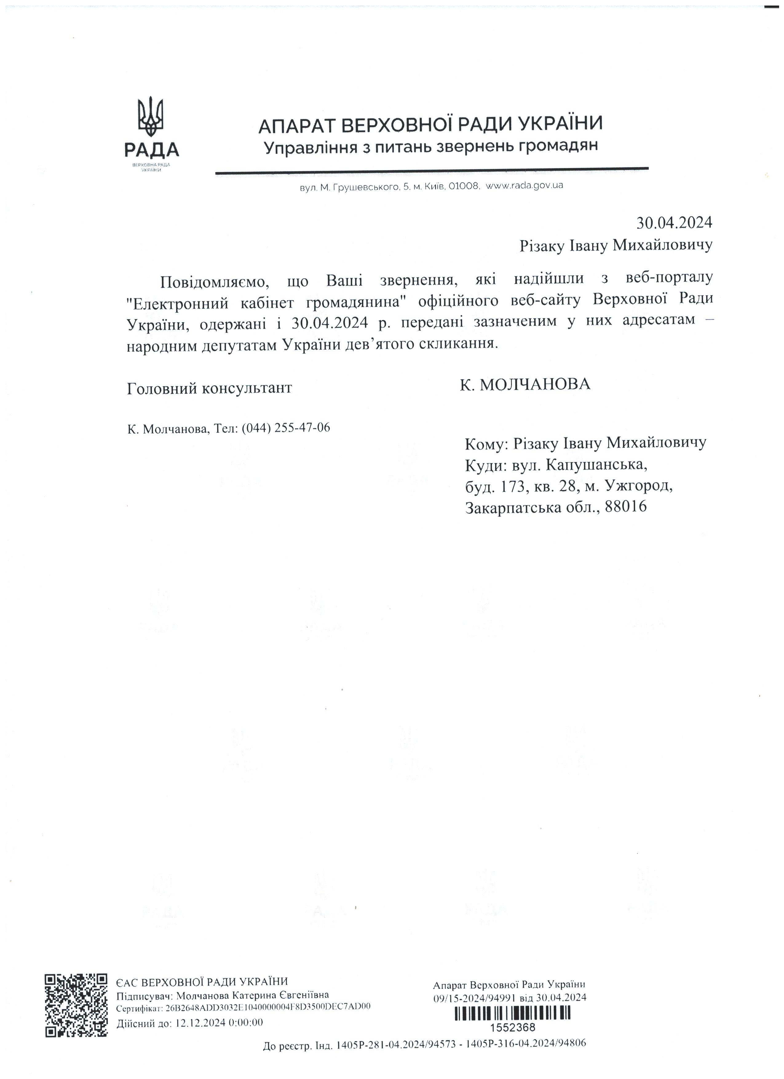 Шановні Анатолію Леонідовичу, Василю Дмитровичу, Василю Миколайовичу! Звертаюся до Вас як батько, як колишній керівник області, як простий житель цього краю, який хоче, щоб на цій землі ніколи не проливалася кров наших рідних, знайомих і близьких. Переконаний, що у політичного керівництва держави є достатньо волі для того, щоб поставити на місце «безпредельщиков», які пробують дестабілізувати ситуацію у державі. Переконаний, що події на кшталт помаранчевого терору у 2005 роців області більше не повторяться. З глибокою повагою, Різак Іван Михайлович, що проживає за адресою м. Ужгород, вул. Капушанська, б.173 кв. 28, голова Закарпатської обласної державної адміністрації (вересень 2002р. – січень 2005р.), народний депутат IV скликання, державний службовець І рангу, багаторічний голова і член координаційного комітету по боротьбі з організованою злочинністю при ОДА, кандидат фізико-математичних наук, тимчасово непрацюючий.