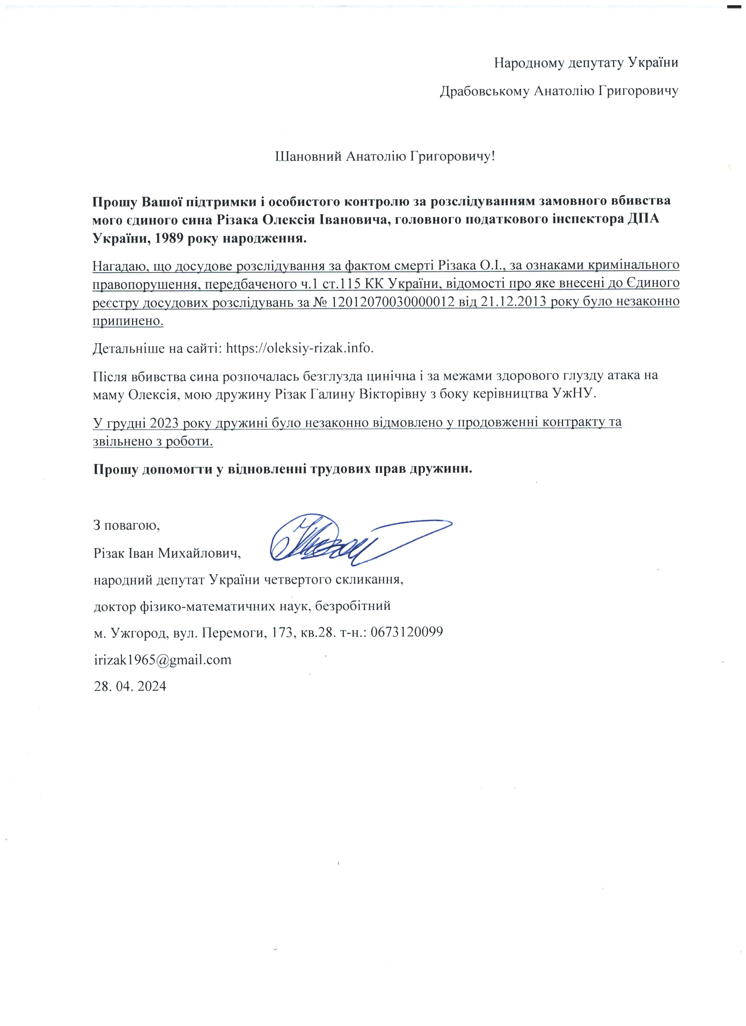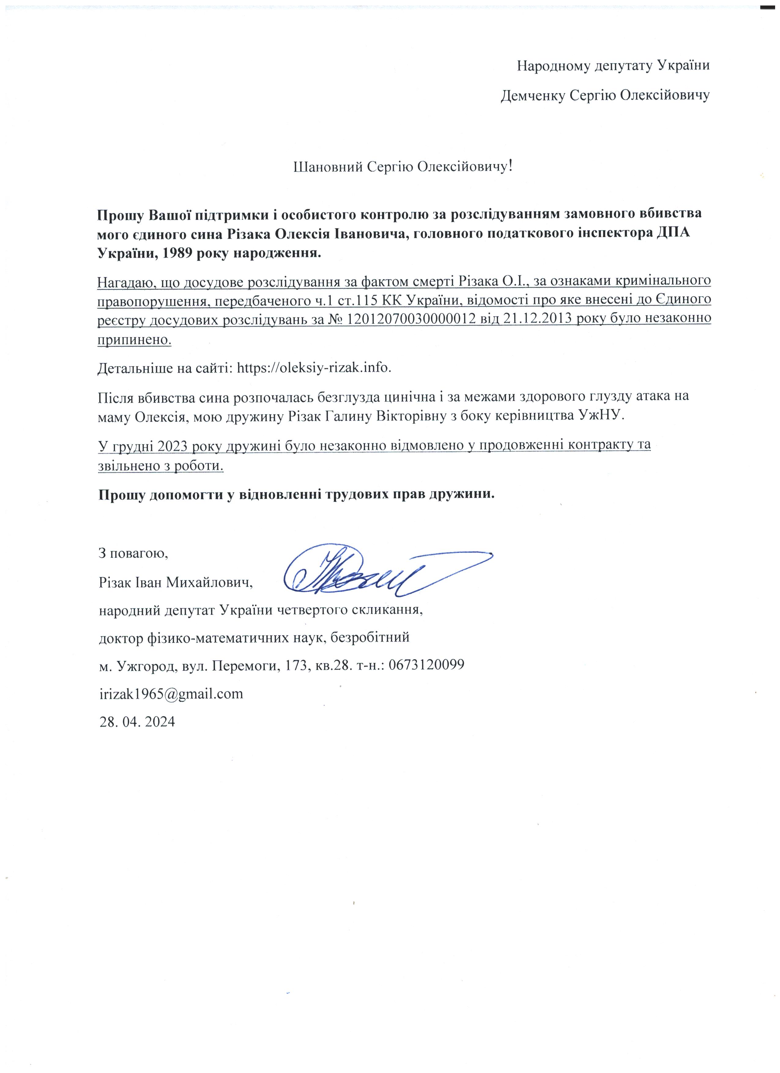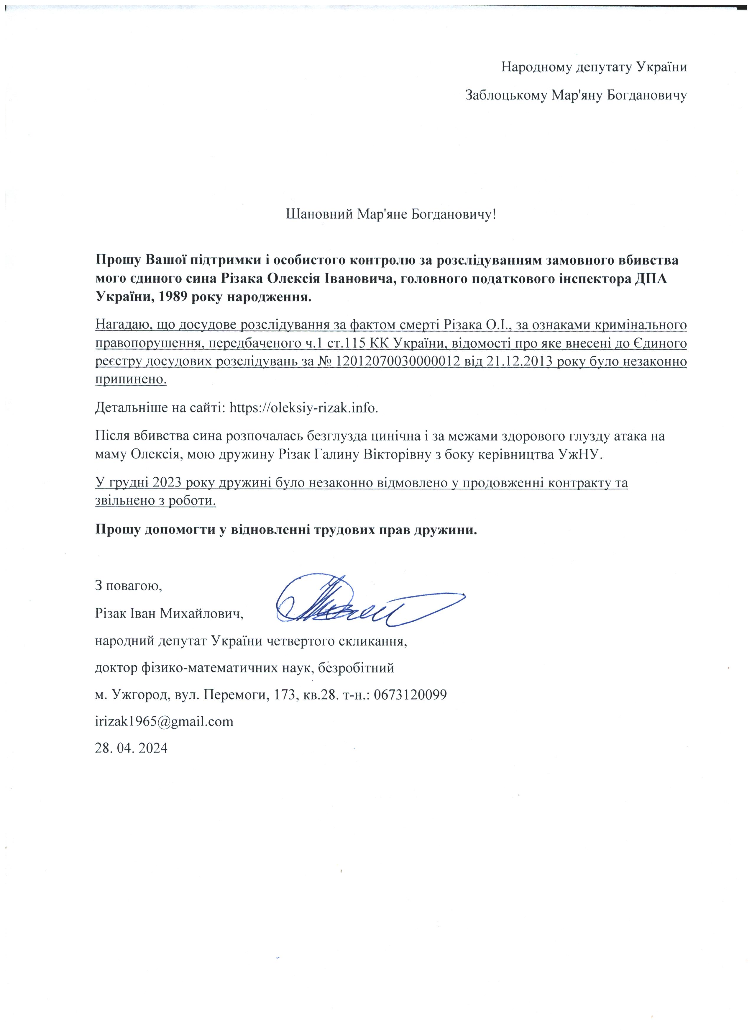 Це дає мені підстави говорити про те, що вбивство мого сина – чітко спланована спецоперація з відповідним інформаційним забезпеченням по своїм масштабам схожа на гебельсівську пропаганду. На час поширення цієї версії загибелі сина не було жодної, підкреслюю жодної, підстави говорити про самогубство, оскільки на той час слідчі не знайшли і сліду падіння з багатоповерхівки Олексія Різака, а також не провели жодної слідчої дії з громадянкою із-за «нещасливої» любові до якої мій син закінчив життя самогубством. Щиро прошу Вас, в найближчі години перекваліфікувати цю трагедію за статею КПК «вбивство» і всебічно, об’єктивно та системно провести відповідні слідчі дії для знаходження впливових замовників і звірів-вбивць мого рідного сина. Коротко Вас проінформую, що Різак Олексій Іванович, 1989 р.н., магістр фінансів (закінчив економічний факультет Харківського національного університету імені В.Н. Каразіна з відзнакою), магістр – юрист (закінчив магістратуру національного університету «Юридична академія України імені Ярослава Мудрого»), має військове звання – молодший лейтенант запасу, працював головним державним податковим інспектором першого рангу ДПС у Закарпатській області. Активно займався спортом. У свій час виступав за юнацьку збірну України з футболу, професійний клуб ФК «Закарпаття». На сьогоднішній день виступав за збірну ДПС у Закарпатській області, щоденно займався фізкультурою (для прикладу скажу, щоранку віджимався до 500 разів, а кількість ранкових стрибків на скакалці сягала 2000 разів, разом зі мною освоював східні єдиноборства), мав щирі відносини із дівчиною, колегами по роботі, був серйозним і відповідальним фахівцем. Додам також, що за півтори години до знаходження його тіла я спілкувався з ним особисто по телефону і обговорював подробиці матчу чемпіонату Італії з футболу Мілан – Фіорентина, під час цієї розмови ми обговорили майбутню поїздку у Київ, а також похід у гості до знайомих. Переконаний, нічого не могло статися за ці півтори години після нашої доброї розмови з почуттям гумору і присутності його дівчини, якій я передав вітання.