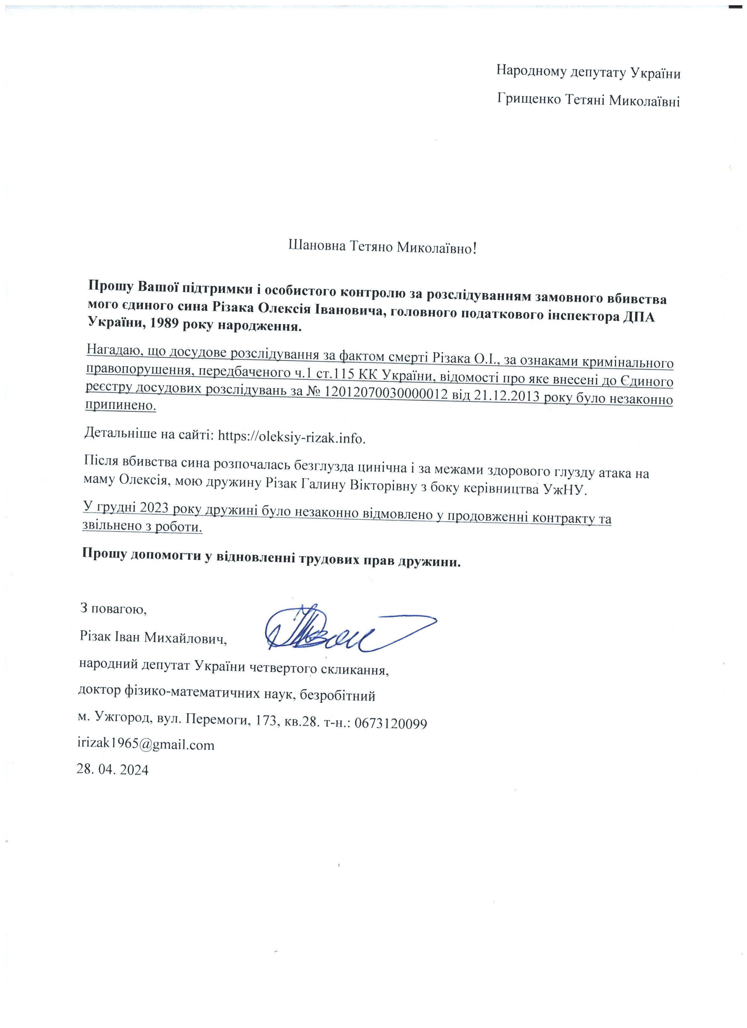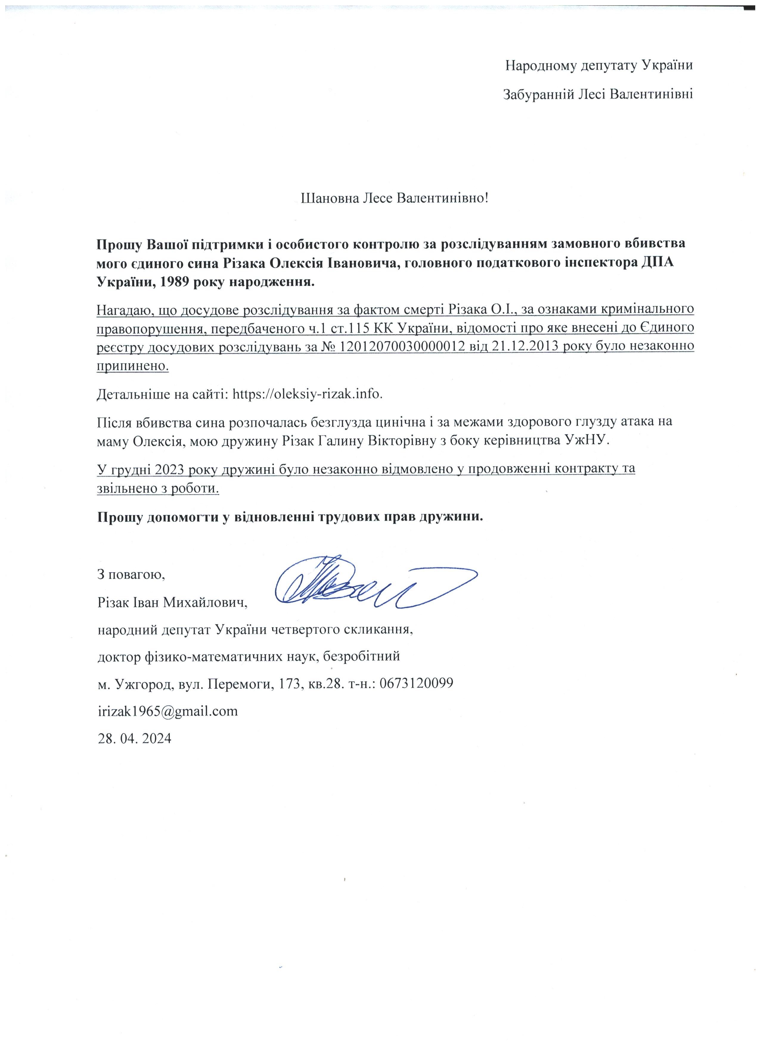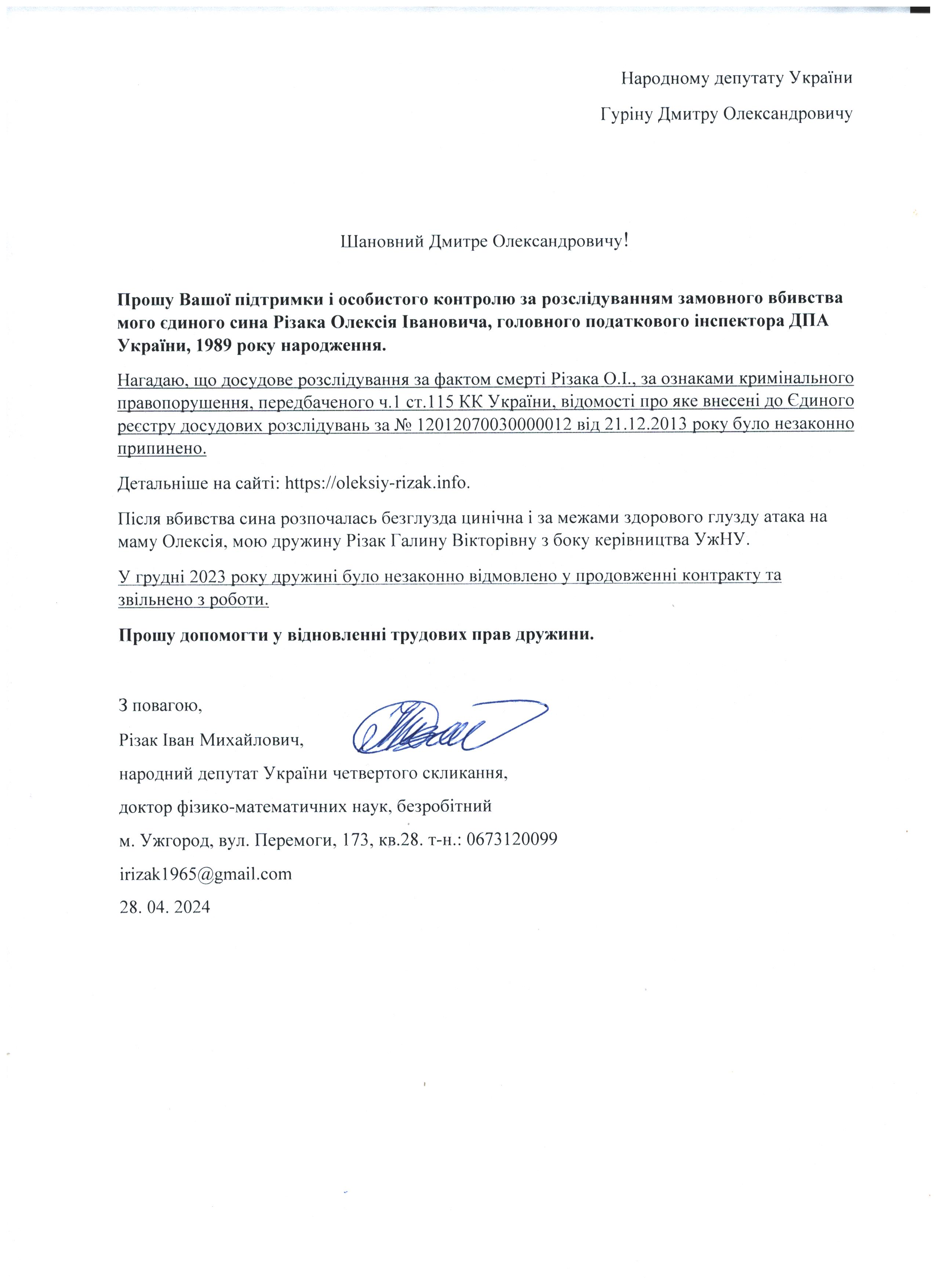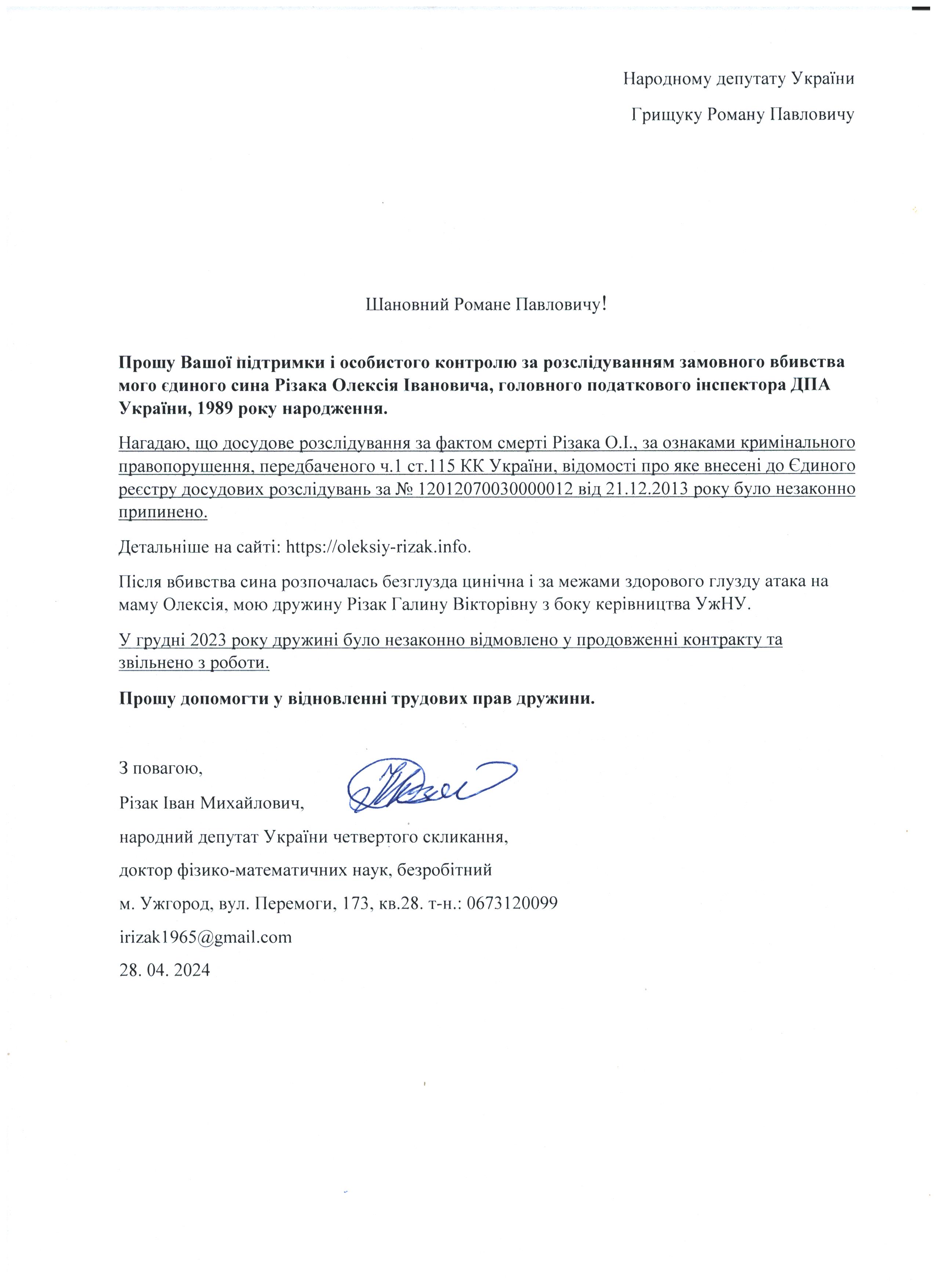 Це дає мені підстави говорити про те, що вбивство мого сина – чітко спланована спецоперація з відповідним інформаційним забезпеченням по своїм масштабам схожа на гебельсівську пропаганду. На час поширення цієї версії загибелі сина не було жодної, підкреслюю жодної, підстави говорити про самогубство, оскільки на той час слідчі не знайшли і сліду падіння з багатоповерхівки Олексія Різака, а також не провели жодної слідчої дії з громадянкою із-за «нещасливої» любові до якої мій син закінчив життя самогубством. Щиро прошу Вас, в найближчі години перекваліфікувати цю трагедію за статею КПК «вбивство» і всебічно, об’єктивно та системно провести відповідні слідчі дії для знаходження впливових замовників і звірів-вбивць мого рідного сина. Коротко Вас проінформую, що Різак Олексій Іванович, 1989 р.н., магістр фінансів (закінчив економічний факультет Харківського національного університету імені В.Н. Каразіна з відзнакою), магістр – юрист (закінчив магістратуру національного університету «Юридична академія України імені Ярослава Мудрого»), має військове звання – молодший лейтенант запасу, працював головним державним податковим інспектором першого рангу ДПС у Закарпатській області. Активно займався спортом. У свій час виступав за юнацьку збірну України з футболу, професійний клуб ФК «Закарпаття». На сьогоднішній день виступав за збірну ДПС у Закарпатській області, щоденно займався фізкультурою (для прикладу скажу, щоранку віджимався до 500 разів, а кількість ранкових стрибків на скакалці сягала 2000 разів, разом зі мною освоював східні єдиноборства), мав щирі відносини із дівчиною, колегами по роботі, був серйозним і відповідальним фахівцем. Додам також, що за півтори години до знаходження його тіла я спілкувався з ним особисто по телефону і обговорював подробиці матчу чемпіонату Італії з футболу Мілан – Фіорентина, під час цієї розмови ми обговорили майбутню поїздку у Київ, а також похід у гості до знайомих. Переконаний, нічого не могло статися за ці півтори години після нашої доброї розмови з почуттям гумору і присутності його дівчини, якій я передав вітання.