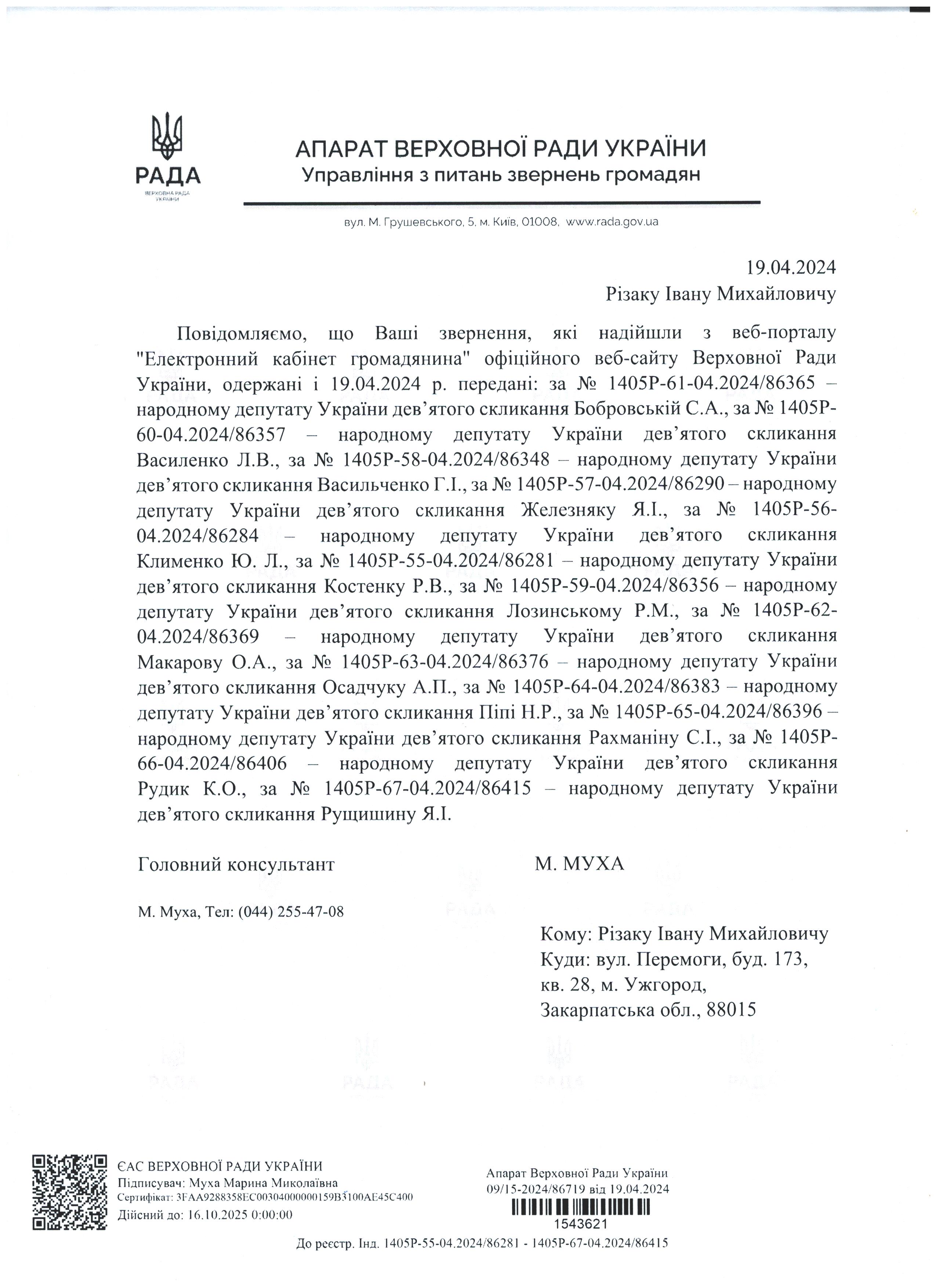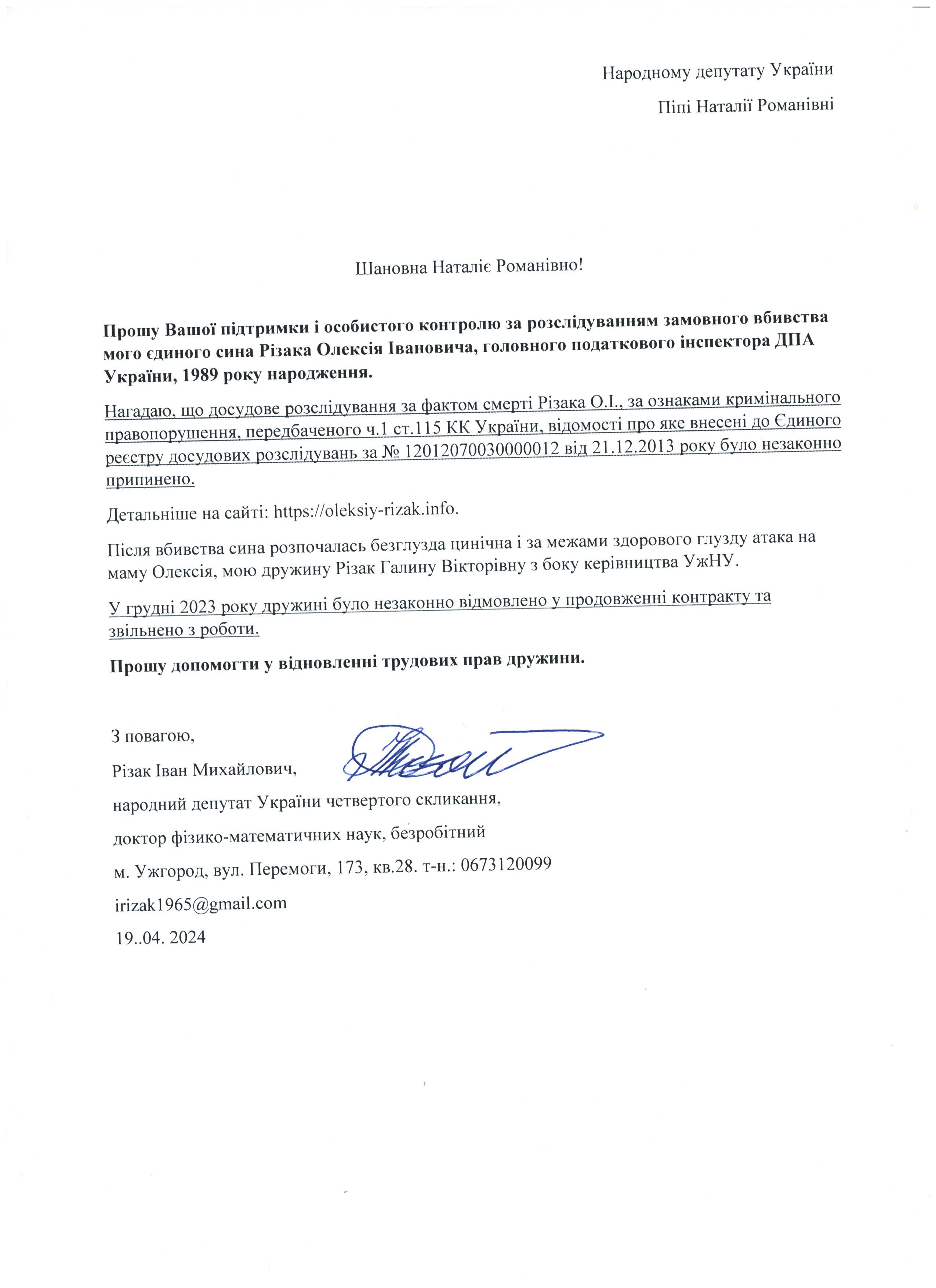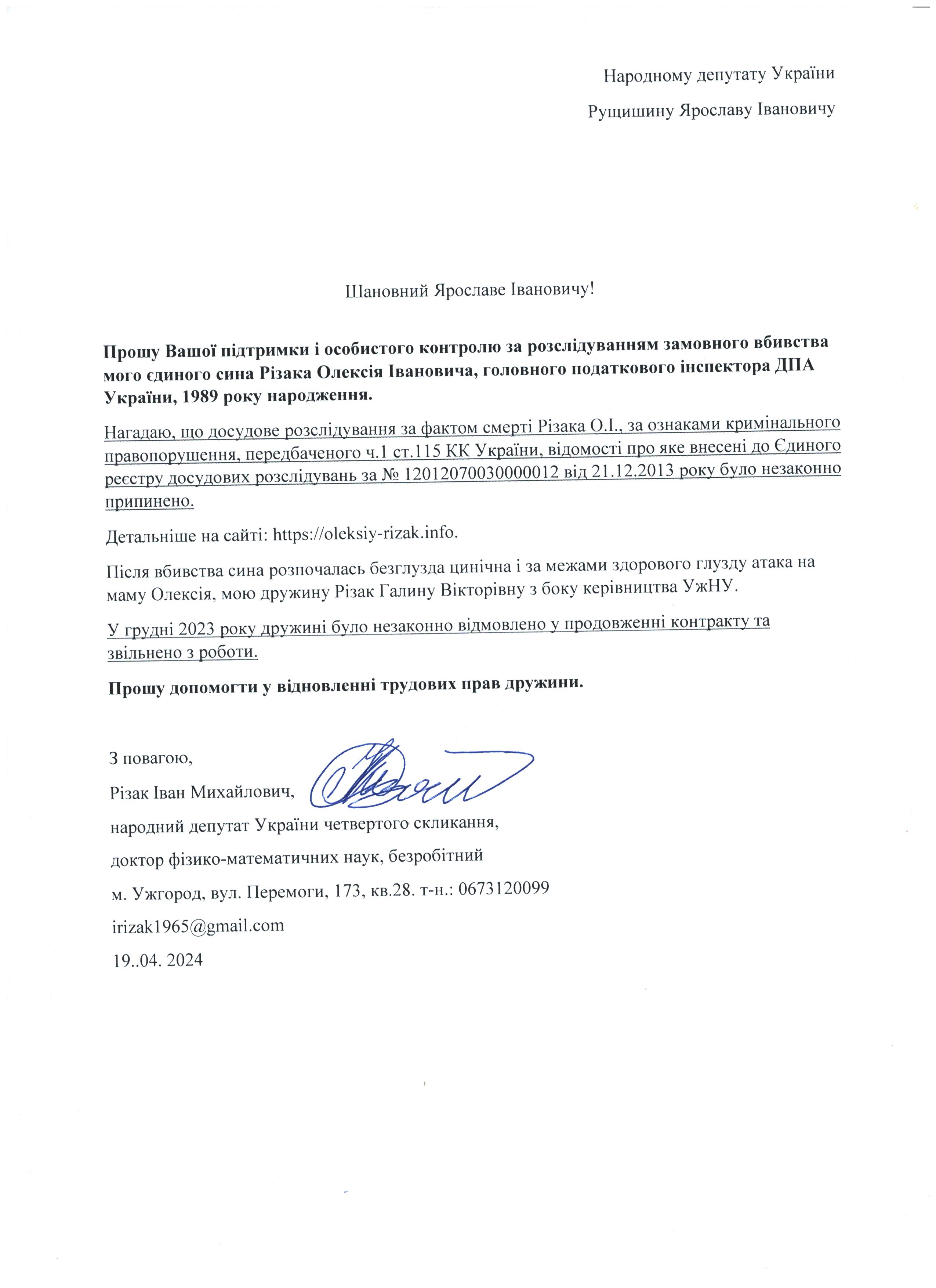 Шановні Анатолію Леонідовичу, Василю Дмитровичу, Василю Миколайовичу! Звертаюся до Вас як батько, як колишній керівник області, як простий житель цього краю, який хоче, щоб на цій землі ніколи не проливалася кров наших рідних, знайомих і близьких. Переконаний, що у політичного керівництва держави є достатньо волі для того, щоб поставити на місце «безпредельщиков», які пробують дестабілізувати ситуацію у державі. Переконаний, що події на кшталт помаранчевого терору у 2005 роців області більше не повторяться. З глибокою повагою, Різак Іван Михайлович, що проживає за адресою м. Ужгород, вул. Капушанська, б.173 кв. 28, голова Закарпатської обласної державної адміністрації (вересень 2002р. – січень 2005р.), народний депутат IV скликання, державний службовець І рангу, багаторічний голова і член координаційного комітету по боротьбі з організованою злочинністю при ОДА, кандидат фізико-математичних наук, тимчасово непрацюючий.