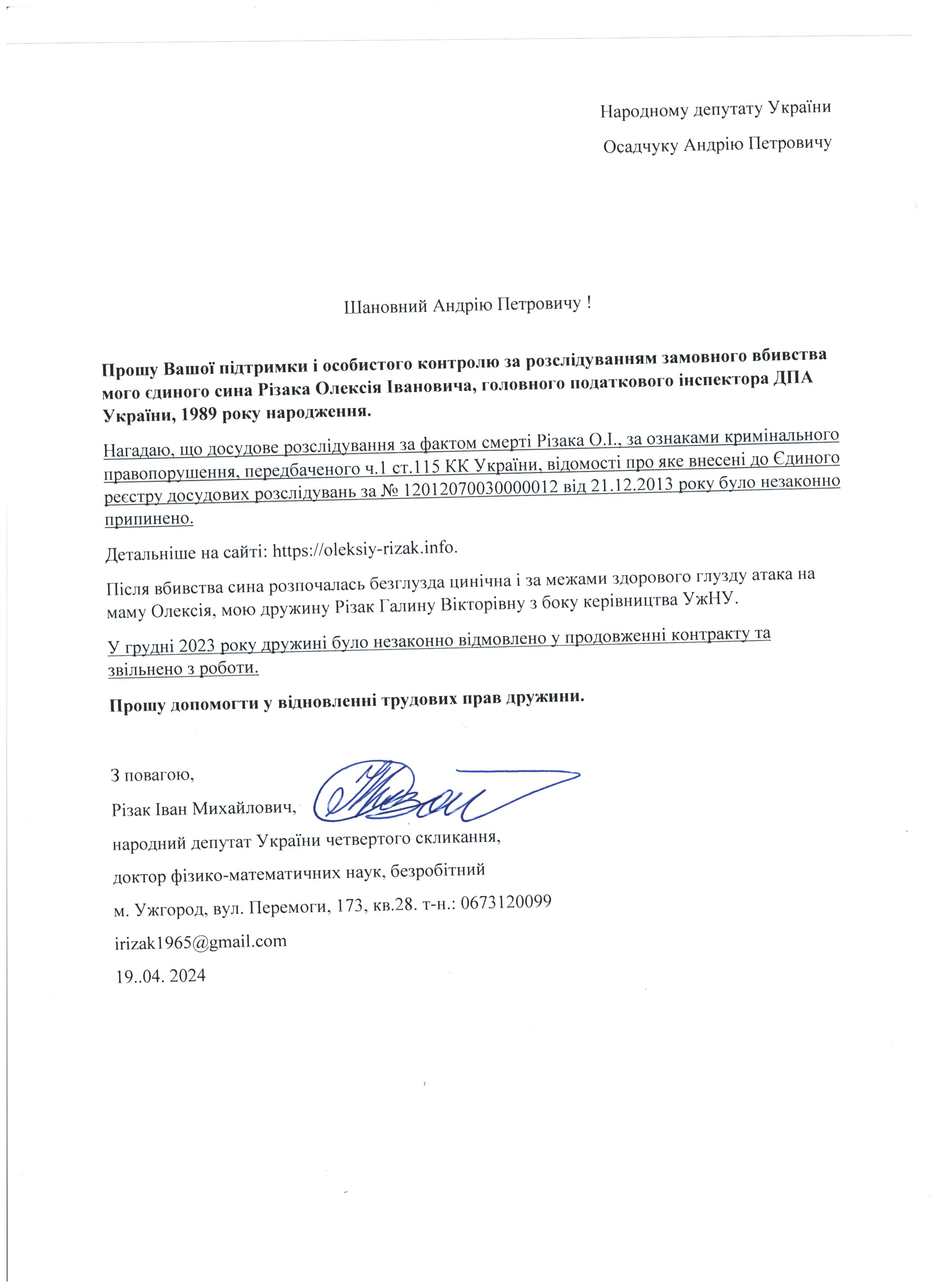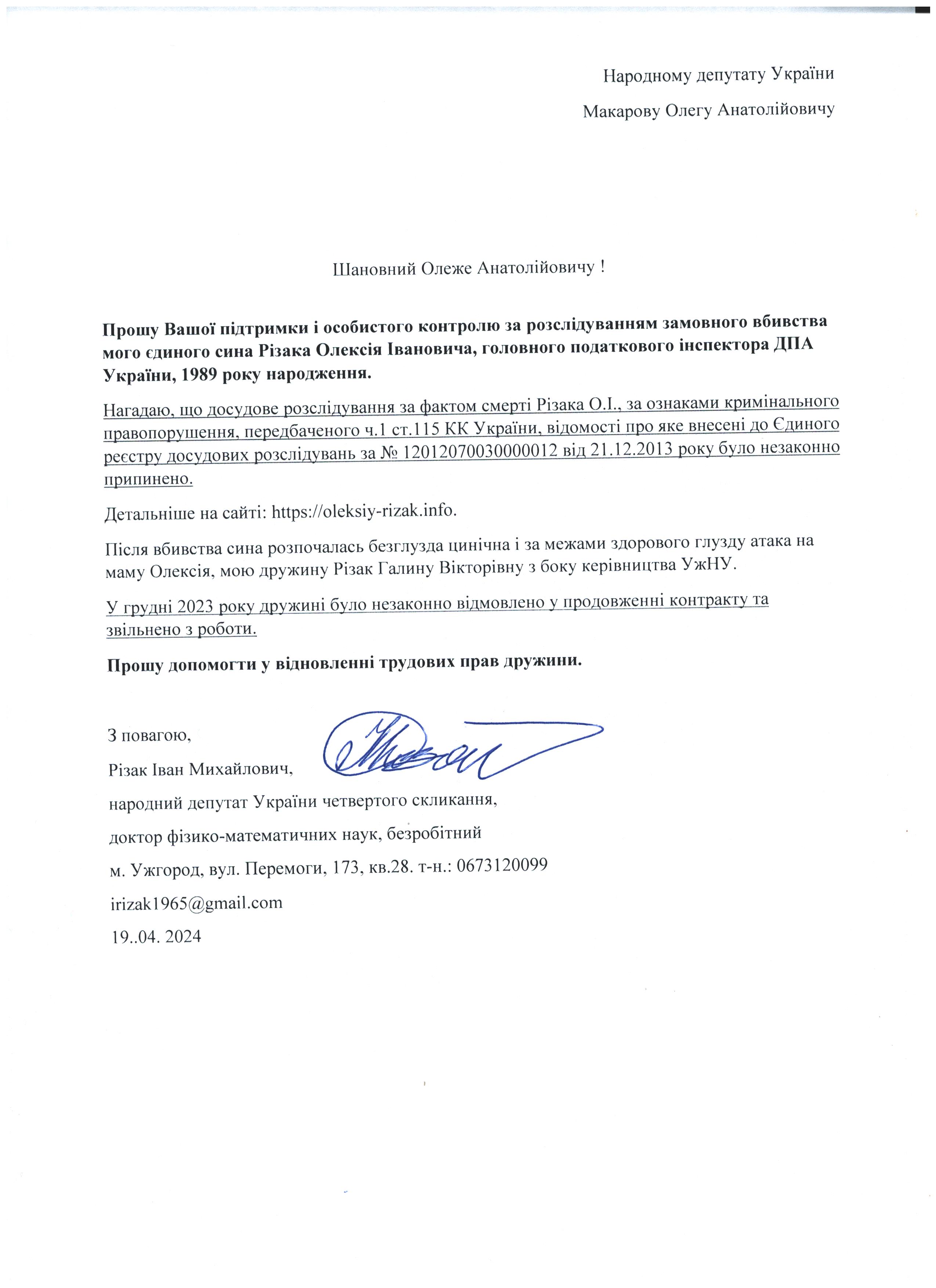 Це дає мені підстави говорити про те, що вбивство мого сина – чітко спланована спецоперація з відповідним інформаційним забезпеченням по своїм масштабам схожа на гебельсівську пропаганду. На час поширення цієї версії загибелі сина не було жодної, підкреслюю жодної, підстави говорити про самогубство, оскільки на той час слідчі не знайшли і сліду падіння з багатоповерхівки Олексія Різака, а також не провели жодної слідчої дії з громадянкою із-за «нещасливої» любові до якої мій син закінчив життя самогубством. Щиро прошу Вас, в найближчі години перекваліфікувати цю трагедію за статею КПК «вбивство» і всебічно, об’єктивно та системно провести відповідні слідчі дії для знаходження впливових замовників і звірів-вбивць мого рідного сина. Коротко Вас проінформую, що Різак Олексій Іванович, 1989 р.н., магістр фінансів (закінчив економічний факультет Харківського національного університету імені В.Н. Каразіна з відзнакою), магістр – юрист (закінчив магістратуру національного університету «Юридична академія України імені Ярослава Мудрого»), має військове звання – молодший лейтенант запасу, працював головним державним податковим інспектором першого рангу ДПС у Закарпатській області. Активно займався спортом. У свій час виступав за юнацьку збірну України з футболу, професійний клуб ФК «Закарпаття». На сьогоднішній день виступав за збірну ДПС у Закарпатській області, щоденно займався фізкультурою (для прикладу скажу, щоранку віджимався до 500 разів, а кількість ранкових стрибків на скакалці сягала 2000 разів, разом зі мною освоював східні єдиноборства), мав щирі відносини із дівчиною, колегами по роботі, був серйозним і відповідальним фахівцем. Додам також, що за півтори години до знаходження його тіла я спілкувався з ним особисто по телефону і обговорював подробиці матчу чемпіонату Італії з футболу Мілан – Фіорентина, під час цієї розмови ми обговорили майбутню поїздку у Київ, а також похід у гості до знайомих. Переконаний, нічого не могло статися за ці півтори години після нашої доброї розмови з почуттям гумору і присутності його дівчини, якій я передав вітання.