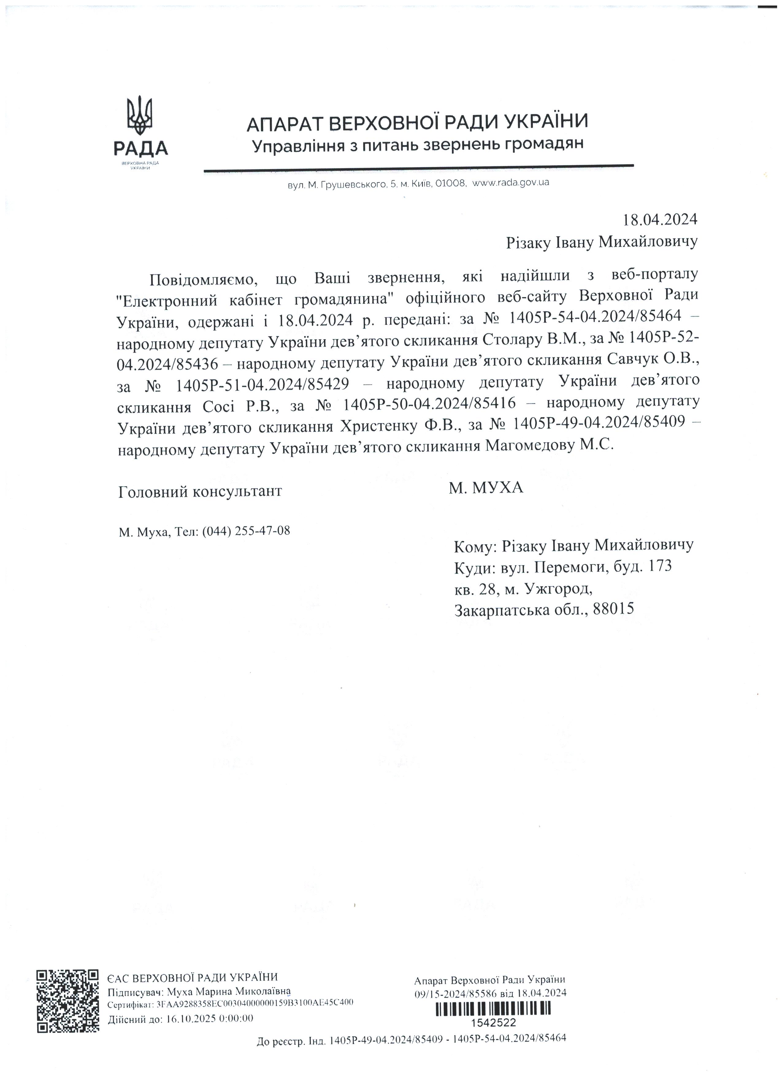Шановні Анатолію Леонідовичу, Василю Дмитровичу, Василю Миколайовичу! Звертаюся до Вас як батько, як колишній керівник області, як простий житель цього краю, який хоче, щоб на цій землі ніколи не проливалася кров наших рідних, знайомих і близьких. Переконаний, що у політичного керівництва держави є достатньо волі для того, щоб поставити на місце «безпредельщиков», які пробують дестабілізувати ситуацію у державі. Переконаний, що події на кшталт помаранчевого терору у 2005 роців області більше не повторяться. З глибокою повагою, Різак Іван Михайлович, що проживає за адресою м. Ужгород, вул. Капушанська, б.173 кв. 28, голова Закарпатської обласної державної адміністрації (вересень 2002р. – січень 2005р.), народний депутат IV скликання, державний службовець І рангу, багаторічний голова і член координаційного комітету по боротьбі з організованою злочинністю при ОДА, кандидат фізико-математичних наук, тимчасово непрацюючий.
