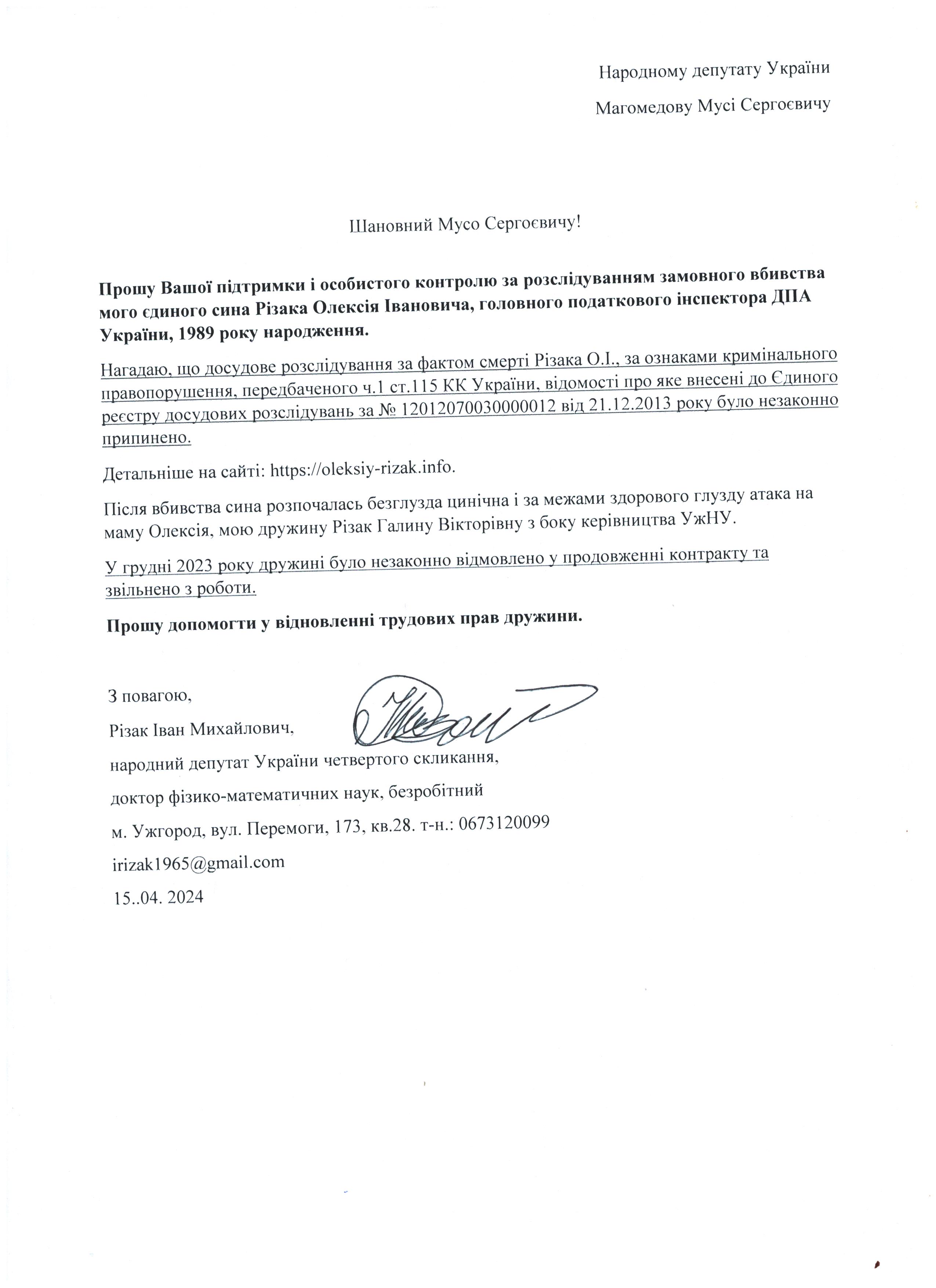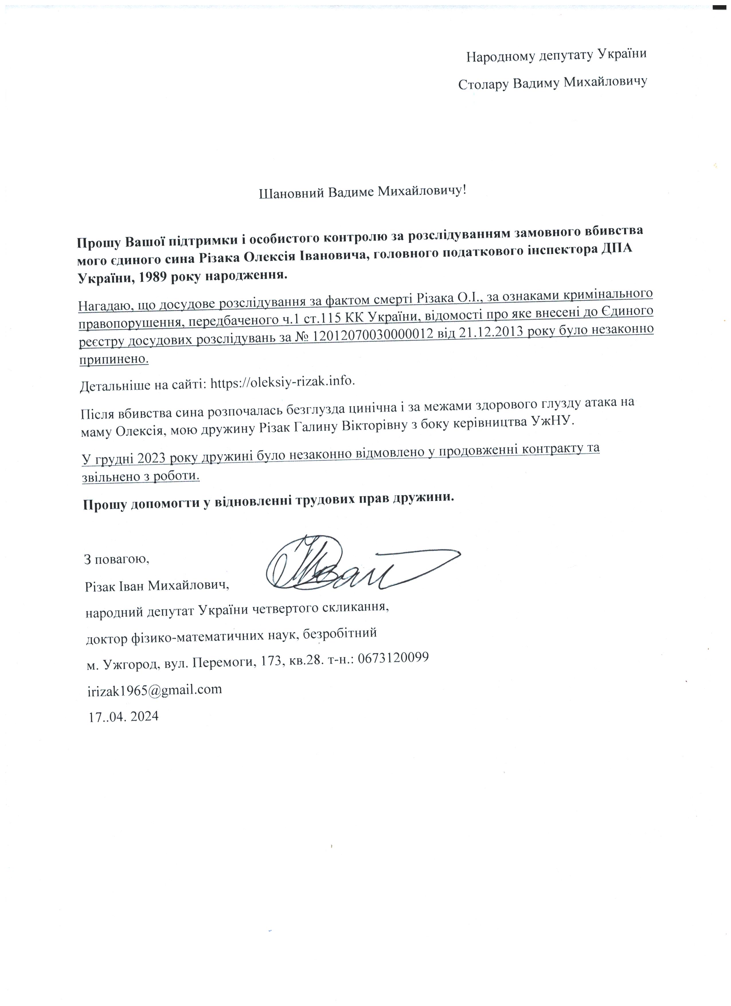 Шановні Анатолію Леонідовичу, Василю Дмитровичу, Василю Миколайовичу! Звертаюся до Вас як батько, як колишній керівник області, як простий житель цього краю, який хоче, щоб на цій землі ніколи не проливалася кров наших рідних, знайомих і близьких. Переконаний, що у політичного керівництва держави є достатньо волі для того, щоб поставити на місце «безпредельщиков», які пробують дестабілізувати ситуацію у державі. Переконаний, що події на кшталт помаранчевого терору у 2005 роців області більше не повторяться. З глибокою повагою, Різак Іван Михайлович, що проживає за адресою м. Ужгород, вул. Капушанська, б.173 кв. 28, голова Закарпатської обласної державної адміністрації (вересень 2002р. – січень 2005р.), народний депутат IV скликання, державний службовець І рангу, багаторічний голова і член координаційного комітету по боротьбі з організованою злочинністю при ОДА, кандидат фізико-математичних наук, тимчасово непрацюючий.