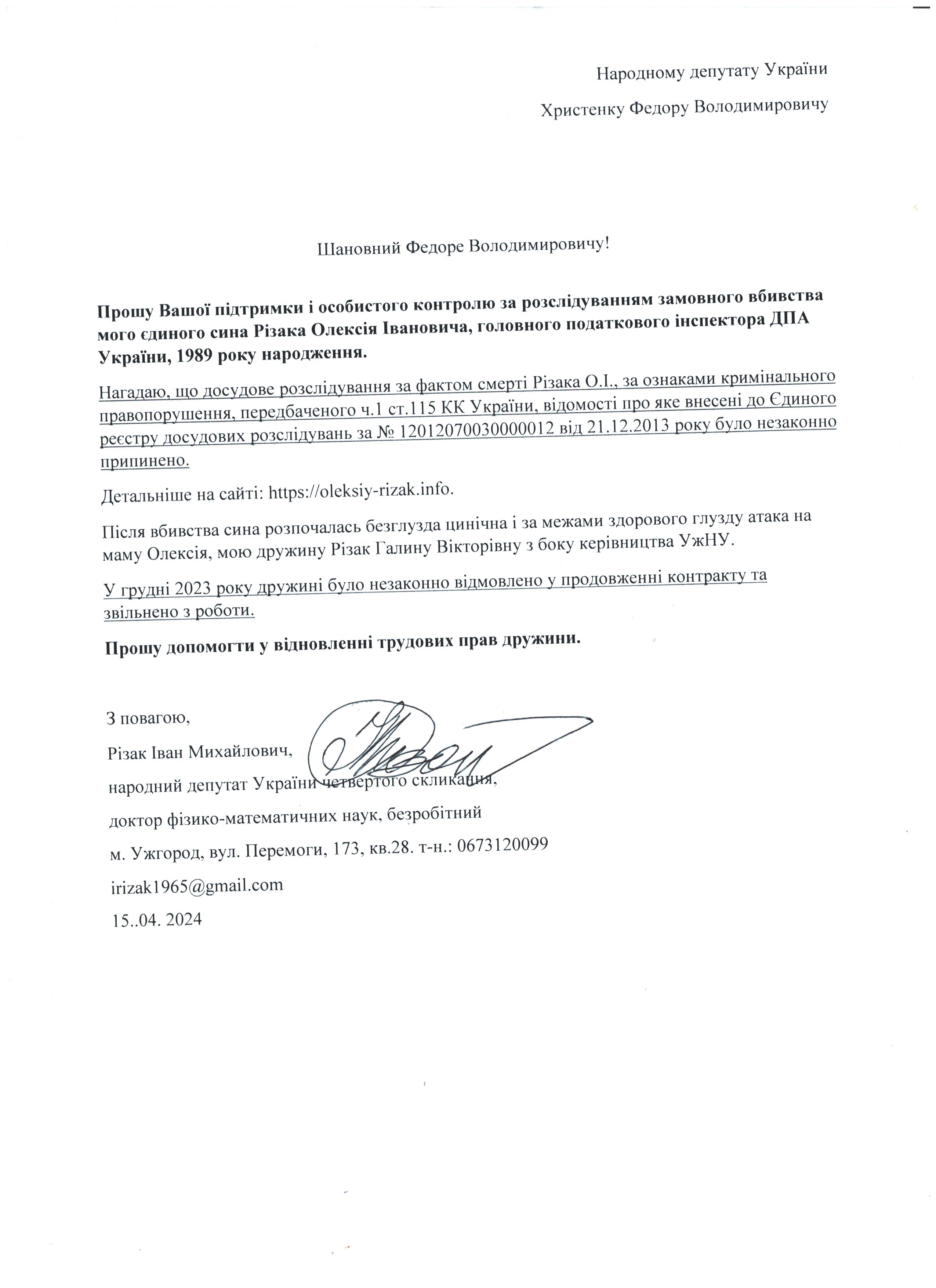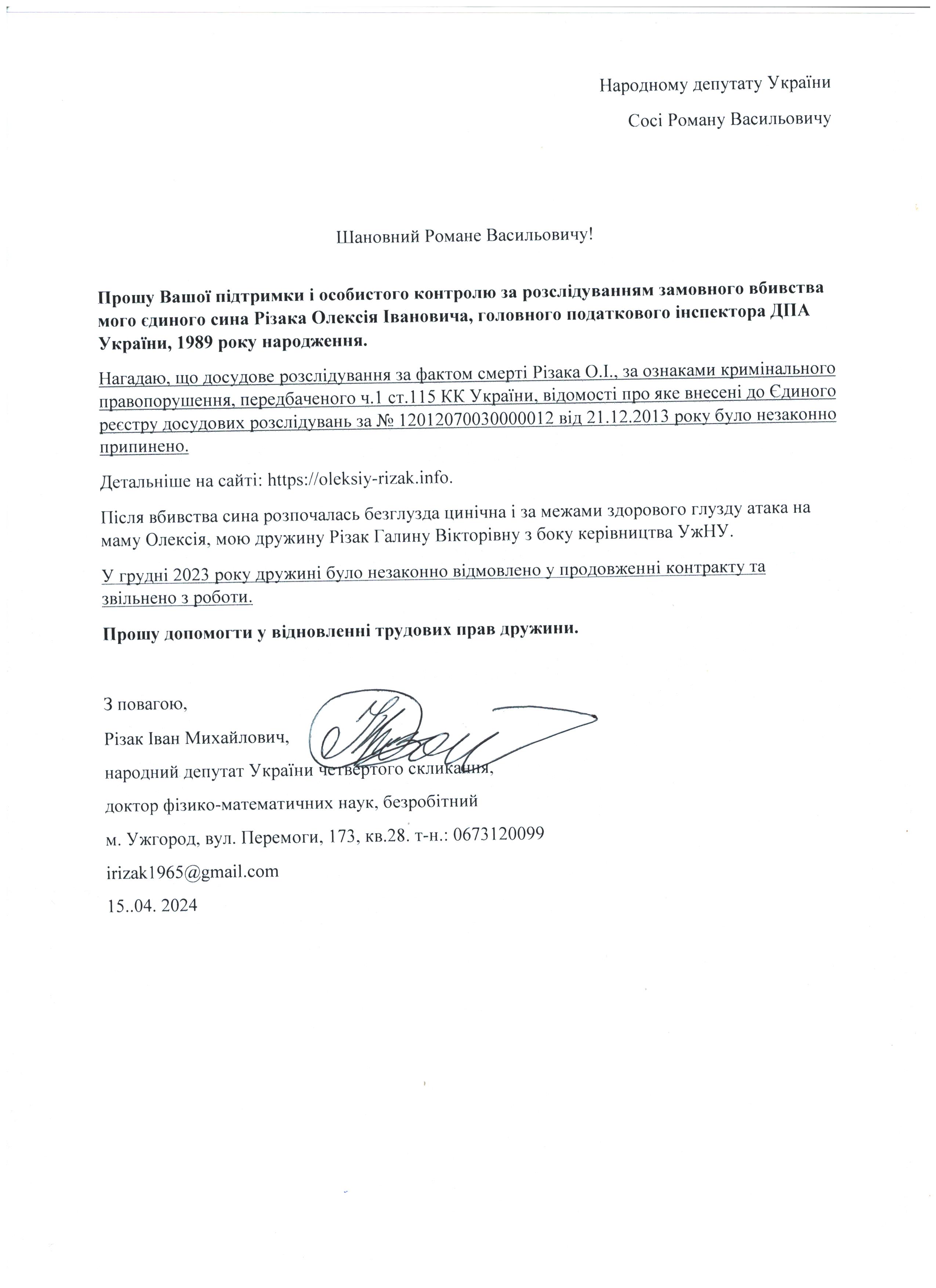 Це дає мені підстави говорити про те, що вбивство мого сина – чітко спланована спецоперація з відповідним інформаційним забезпеченням по своїм масштабам схожа на гебельсівську пропаганду. На час поширення цієї версії загибелі сина не було жодної, підкреслюю жодної, підстави говорити про самогубство, оскільки на той час слідчі не знайшли і сліду падіння з багатоповерхівки Олексія Різака, а також не провели жодної слідчої дії з громадянкою із-за «нещасливої» любові до якої мій син закінчив життя самогубством. Щиро прошу Вас, в найближчі години перекваліфікувати цю трагедію за статею КПК «вбивство» і всебічно, об’єктивно та системно провести відповідні слідчі дії для знаходження впливових замовників і звірів-вбивць мого рідного сина. Коротко Вас проінформую, що Різак Олексій Іванович, 1989 р.н., магістр фінансів (закінчив економічний факультет Харківського національного університету імені В.Н. Каразіна з відзнакою), магістр – юрист (закінчив магістратуру національного університету «Юридична академія України імені Ярослава Мудрого»), має військове звання – молодший лейтенант запасу, працював головним державним податковим інспектором першого рангу ДПС у Закарпатській області. Активно займався спортом. У свій час виступав за юнацьку збірну України з футболу, професійний клуб ФК «Закарпаття». На сьогоднішній день виступав за збірну ДПС у Закарпатській області, щоденно займався фізкультурою (для прикладу скажу, щоранку віджимався до 500 разів, а кількість ранкових стрибків на скакалці сягала 2000 разів, разом зі мною освоював східні єдиноборства), мав щирі відносини із дівчиною, колегами по роботі, був серйозним і відповідальним фахівцем. Додам також, що за півтори години до знаходження його тіла я спілкувався з ним особисто по телефону і обговорював подробиці матчу чемпіонату Італії з футболу Мілан – Фіорентина, під час цієї розмови ми обговорили майбутню поїздку у Київ, а також похід у гості до знайомих. Переконаний, нічого не могло статися за ці півтори години після нашої доброї розмови з почуттям гумору і присутності його дівчини, якій я передав вітання.