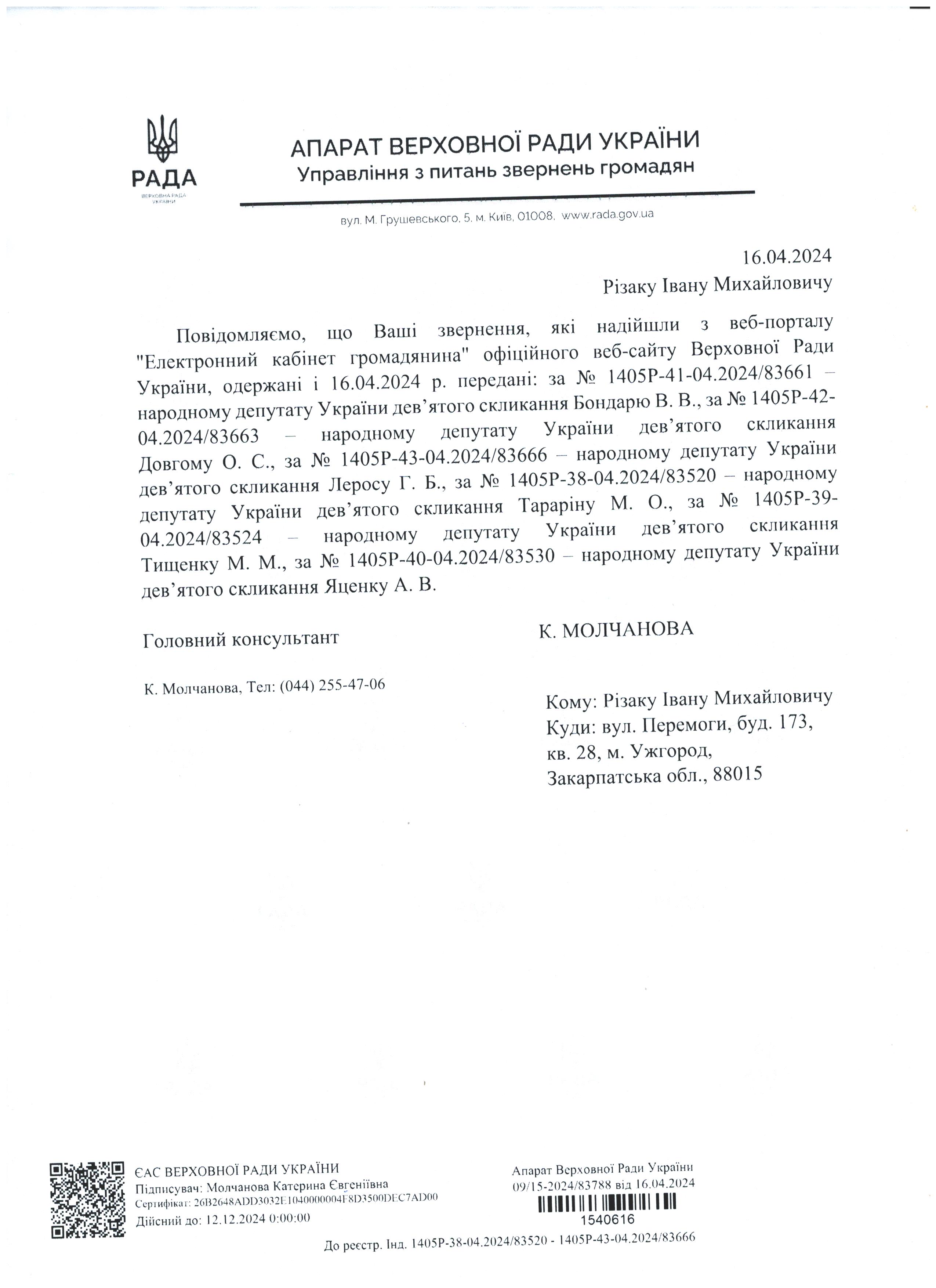Шановні Анатолію Леонідовичу, Василю Дмитровичу, Василю Миколайовичу! Звертаюся до Вас як батько, як колишній керівник області, як простий житель цього краю, який хоче, щоб на цій землі ніколи не проливалася кров наших рідних, знайомих і близьких. Переконаний, що у політичного керівництва держави є достатньо волі для того, щоб поставити на місце «безпредельщиков», які пробують дестабілізувати ситуацію у державі. Переконаний, що події на кшталт помаранчевого терору у 2005 роців області більше не повторяться. З глибокою повагою, Різак Іван Михайлович, що проживає за адресою м. Ужгород, вул. Капушанська, б.173 кв. 28, голова Закарпатської обласної державної адміністрації (вересень 2002р. – січень 2005р.), народний депутат IV скликання, державний службовець І рангу, багаторічний голова і член координаційного комітету по боротьбі з організованою злочинністю при ОДА, кандидат фізико-математичних наук, тимчасово непрацюючий.