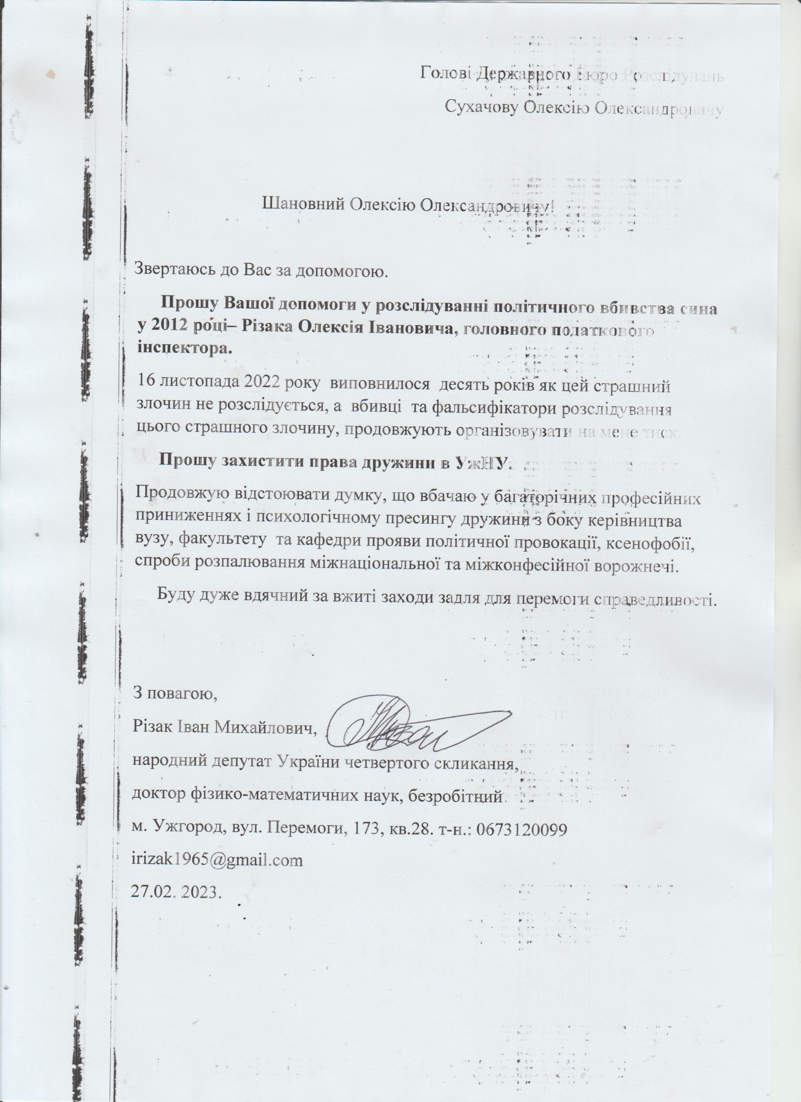 З метою сприяння слідству, а також всебічно об’єктивного розслідування справи прошу Вас доручити своїм підлеглим перевірити наступні питання: 1) чи міг володіти працівник ДПС в Закарпатській області Олексій Різак якоюсь інформацією про тіньовий та кримінальний бізнес в області, знання якої загрожувало б його життю? 2) перевірити у відповідних державних органах наявність у Різака Олексія Івановича та його близьких родичів майна, фінансів, земельних ділянок, підприємств, бізнесу, акцій, облігацій та інших цінних паперів, володіння якими могло б потенційно загрожувати його життю з боку конкурентів та інших співвласників? 3) чи були у нього відносини з громадянкою чи її родичами такими, що могли серйозно впливати на його майновий, матеріальний та ін. стан. 4) чи залучались до спеціальної перевірки, яку потрібно проходити при зарахуванні на державну службу, підрозділи зовнішнього спостереження якоїсь із правоохоронних структур області (я стверджую, що з часу переїзду мене в Закарпаття за нами було встановлене тотальне зовнішнє спостереження)? 5) хотілося б дізнатися (думаю, що це не є слідчою таємницею) в який час і з допомогою якого транспорту 16 листопада 2012 року виїхав син від своєї дівчини, чи проводжала вона його сама або з близькими родичами, чи бачила щось підозріле і яким таксі він виїжджав додому? 6) хотілося б також дізнатися хто першим побачив тіло вбитого юнака і повідомив швидку допомогу і міліцію? 7) з метою перевірки версії спроби отруєння сина Олексія, прошу дати на перевірку у спеціальну токсикологічну лабораторію результати трьох аналізів в «Астра-дія» і одного аналізу, проведеного в кардіодиспансері кілька тижнів тому.