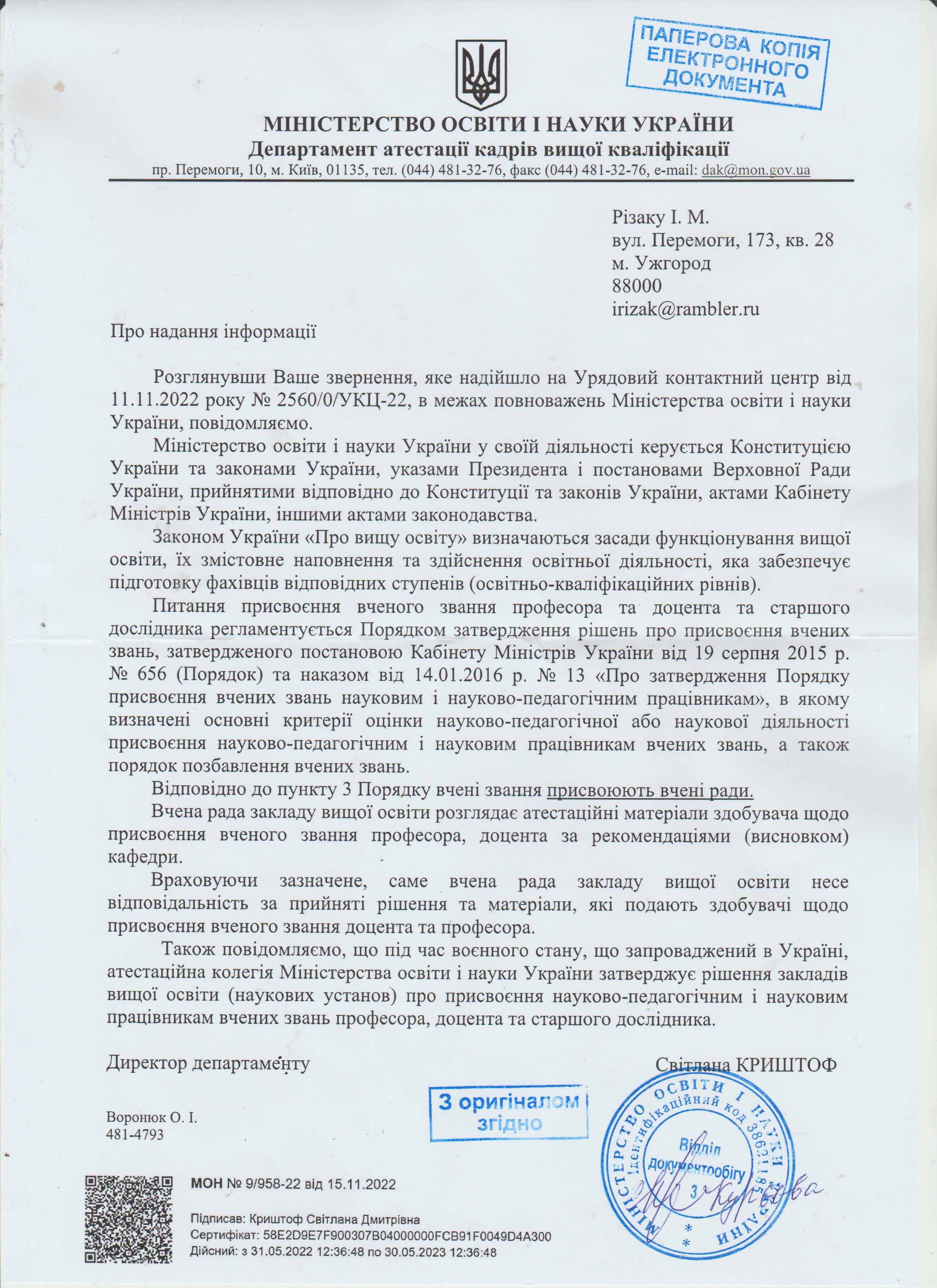 Прошу Вас дати доручення МОЗ перевірити на правдивість висновки відповідних установ в Ужгороді, Житомирі, Києві, які давали такі заключення. Прошу також перевірити на наявність корупційних зв’язків начальника управління охорони здоров’я Закарпатської ОДА Шніцера Р.І. ( в цій справі є процесуальною особою) і колишнього начальника управління Житомирської ОДА, а нині заступника міністра МОЗ України пана Толстанова. На час перевірки і службового розслідування прошу посадових осіб Шніцера і Толстанова усунути від посад. Дякую за розуміння і підтримку. З повагою, Іван Різак, колишній губернатор Закарпаття, державний службовець першого рангу." 12.01.2014
