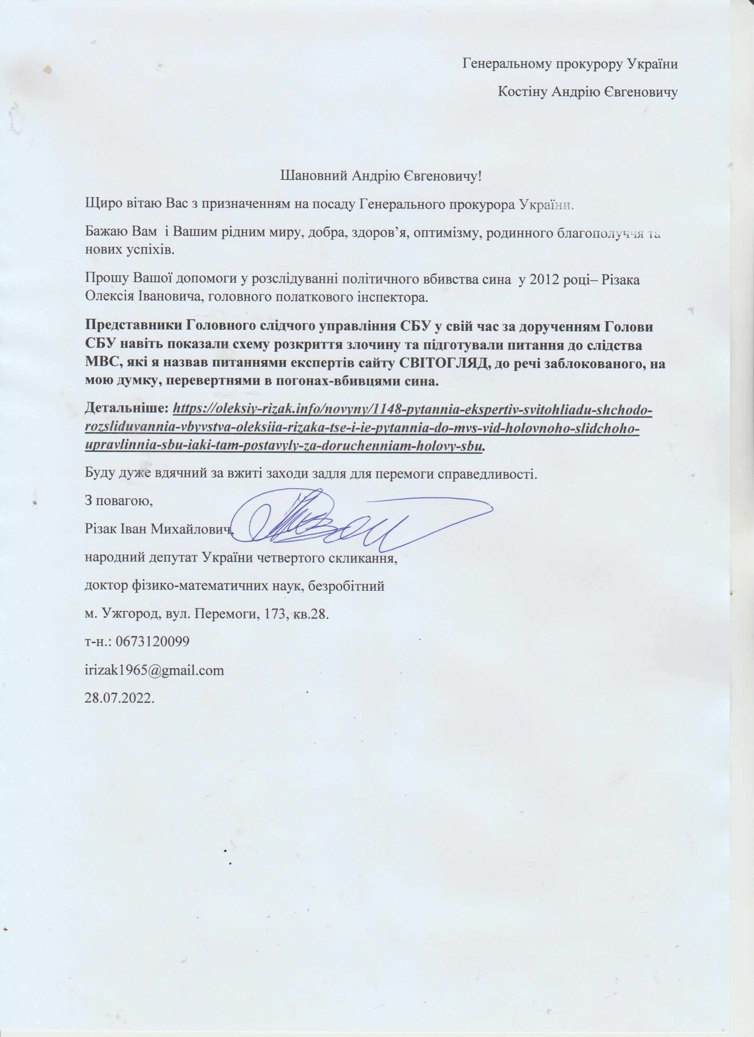 З метою сприяння слідству, а також всебічно об’єктивного розслідування справи прошу Вас доручити своїм підлеглим перевірити наступні питання: 1) чи міг володіти працівник ДПС в Закарпатській області Олексій Різак якоюсь інформацією про тіньовий та кримінальний бізнес в області, знання якої загрожувало б його життю? 2) перевірити у відповідних державних органах наявність у Різака Олексія Івановича та його близьких родичів майна, фінансів, земельних ділянок, підприємств, бізнесу, акцій, облігацій та інших цінних паперів, володіння якими могло б потенційно загрожувати його життю з боку конкурентів та інших співвласників? 3) чи були у нього відносини з громадянкою чи її родичами такими, що могли серйозно впливати на його майновий, матеріальний та ін. стан. 4) чи залучались до спеціальної перевірки, яку потрібно проходити при зарахуванні на державну службу, підрозділи зовнішнього спостереження якоїсь із правоохоронних структур області (я стверджую, що з часу переїзду мене в Закарпаття за нами було встановлене тотальне зовнішнє спостереження)? 5) хотілося б дізнатися (думаю, що це не є слідчою таємницею) в який час і з допомогою якого транспорту 16 листопада 2012 року виїхав син від своєї дівчини, чи проводжала вона його сама або з близькими родичами, чи бачила щось підозріле і яким таксі він виїжджав додому? 6) хотілося б також дізнатися хто першим побачив тіло вбитого юнака і повідомив швидку допомогу і міліцію? 7) з метою перевірки версії спроби отруєння сина Олексія, прошу дати на перевірку у спеціальну токсикологічну лабораторію результати трьох аналізів в «Астра-дія» і одного аналізу, проведеного в кардіодиспансері кілька тижнів тому.