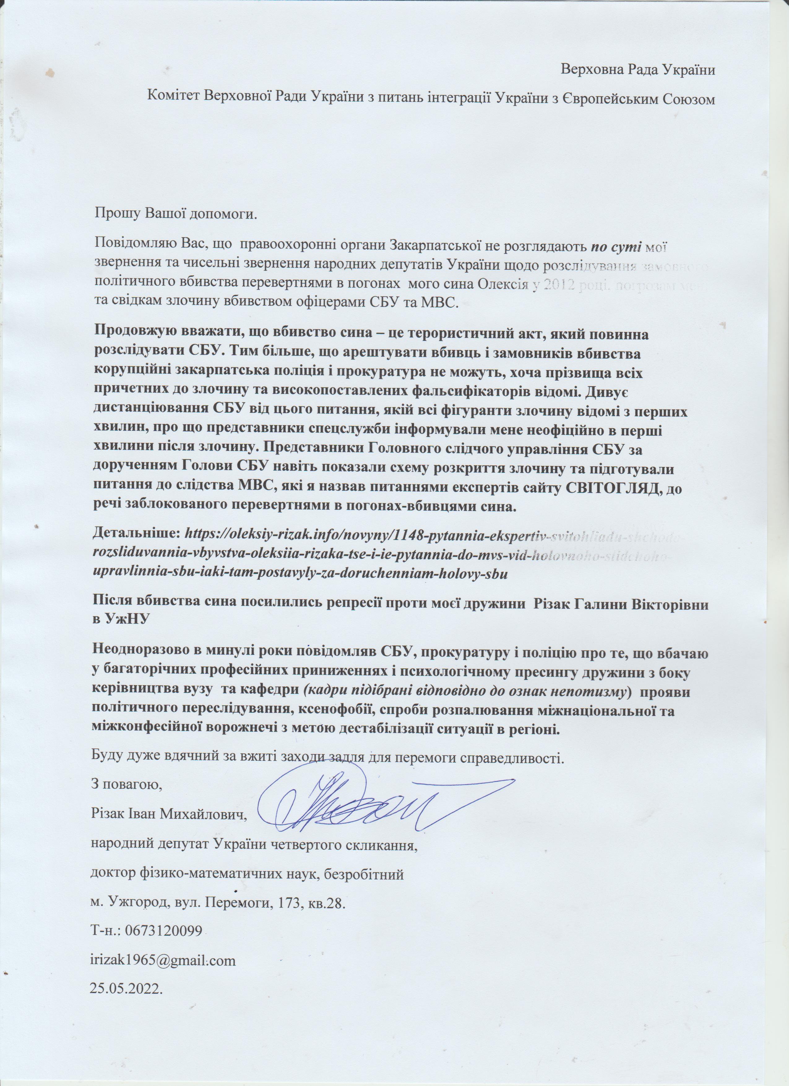 Шановні Анатолію Леонідовичу, Василю Дмитровичу, Василю Миколайовичу! Звертаюся до Вас як батько, як колишній керівник області, як простий житель цього краю, який хоче, щоб на цій землі ніколи не проливалася кров наших рідних, знайомих і близьких. Переконаний, що у політичного керівництва держави є достатньо волі для того, щоб поставити на місце «безпредельщиков», які пробують дестабілізувати ситуацію у державі. Переконаний, що події на кшталт помаранчевого терору у 2005 роців області більше не повторяться. З глибокою повагою, Різак Іван Михайлович, що проживає за адресою м. Ужгород, вул. Капушанська, б.173 кв. 28, голова Закарпатської обласної державної адміністрації (вересень 2002р. – січень 2005р.), народний депутат IV скликання, державний службовець І рангу, багаторічний голова і член координаційного комітету по боротьбі з організованою злочинністю при ОДА, кандидат фізико-математичних наук, тимчасово непрацюючий.