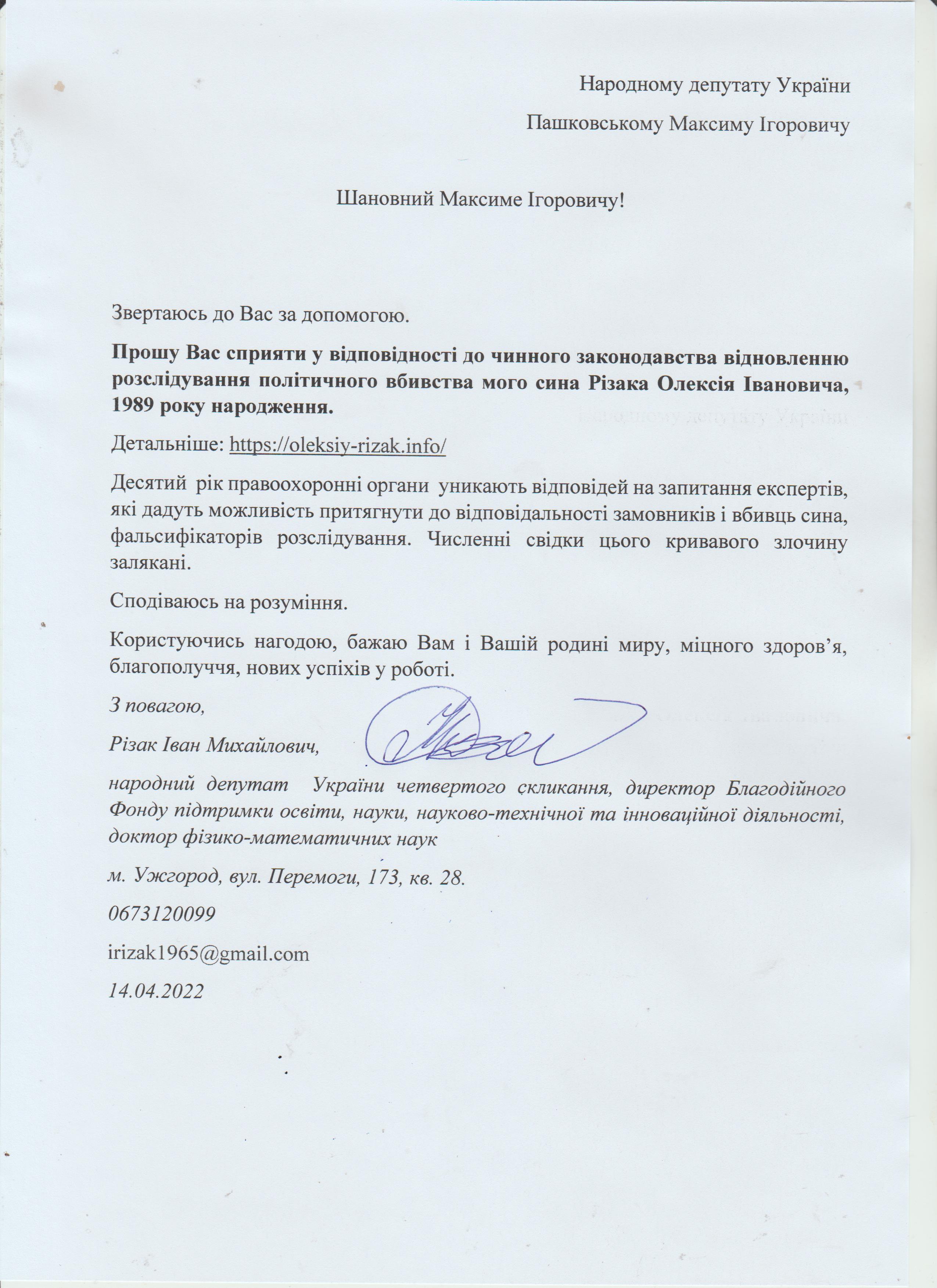 Шановні Анатолію Леонідовичу, Василю Дмитровичу, Василю Миколайовичу! Звертаюся до Вас як батько, як колишній керівник області, як простий житель цього краю, який хоче, щоб на цій землі ніколи не проливалася кров наших рідних, знайомих і близьких. Переконаний, що у політичного керівництва держави є достатньо волі для того, щоб поставити на місце «безпредельщиков», які пробують дестабілізувати ситуацію у державі. Переконаний, що події на кшталт помаранчевого терору у 2005 роців області більше не повторяться. З глибокою повагою, Різак Іван Михайлович, що проживає за адресою м. Ужгород, вул. Капушанська, б.173 кв. 28, голова Закарпатської обласної державної адміністрації (вересень 2002р. – січень 2005р.), народний депутат IV скликання, державний службовець І рангу, багаторічний голова і член координаційного комітету по боротьбі з організованою злочинністю при ОДА, кандидат фізико-математичних наук, тимчасово непрацюючий.