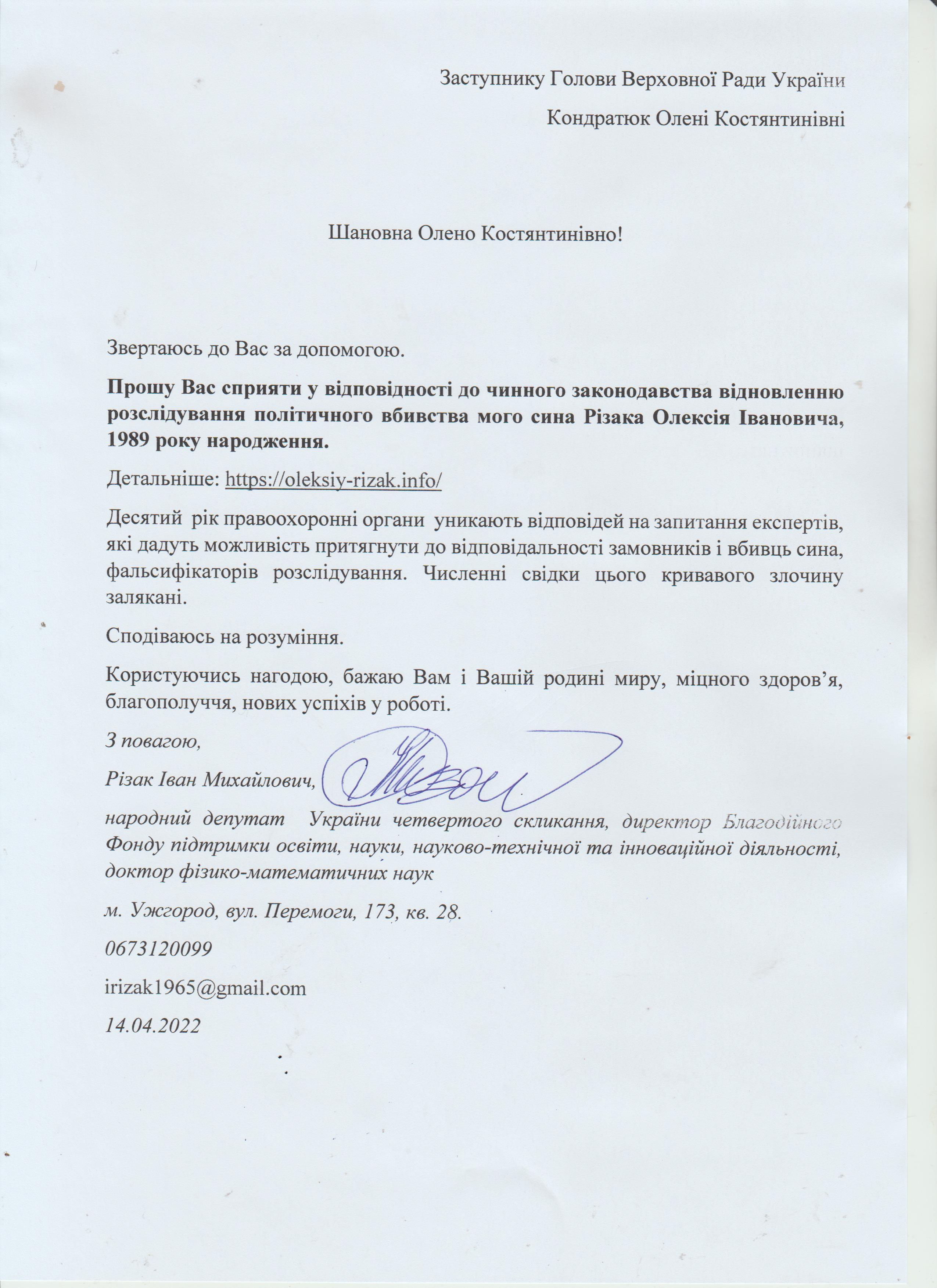 Це дає мені підстави говорити про те, що вбивство мого сина – чітко спланована спецоперація з відповідним інформаційним забезпеченням по своїм масштабам схожа на гебельсівську пропаганду. На час поширення цієї версії загибелі сина не було жодної, підкреслюю жодної, підстави говорити про самогубство, оскільки на той час слідчі не знайшли і сліду падіння з багатоповерхівки Олексія Різака, а також не провели жодної слідчої дії з громадянкою із-за «нещасливої» любові до якої мій син закінчив життя самогубством. Щиро прошу Вас, в найближчі години перекваліфікувати цю трагедію за статею КПК «вбивство» і всебічно, об’єктивно та системно провести відповідні слідчі дії для знаходження впливових замовників і звірів-вбивць мого рідного сина. Коротко Вас проінформую, що Різак Олексій Іванович, 1989 р.н., магістр фінансів (закінчив економічний факультет Харківського національного університету імені В.Н. Каразіна з відзнакою), магістр – юрист (закінчив магістратуру національного університету «Юридична академія України імені Ярослава Мудрого»), має військове звання – молодший лейтенант запасу, працював головним державним податковим інспектором першого рангу ДПС у Закарпатській області. Активно займався спортом. У свій час виступав за юнацьку збірну України з футболу, професійний клуб ФК «Закарпаття». На сьогоднішній день виступав за збірну ДПС у Закарпатській області, щоденно займався фізкультурою (для прикладу скажу, щоранку віджимався до 500 разів, а кількість ранкових стрибків на скакалці сягала 2000 разів, разом зі мною освоював східні єдиноборства), мав щирі відносини із дівчиною, колегами по роботі, був серйозним і відповідальним фахівцем. Додам також, що за півтори години до знаходження його тіла я спілкувався з ним особисто по телефону і обговорював подробиці матчу чемпіонату Італії з футболу Мілан – Фіорентина, під час цієї розмови ми обговорили майбутню поїздку у Київ, а також похід у гості до знайомих. Переконаний, нічого не могло статися за ці півтори години після нашої доброї розмови з почуттям гумору і присутності його дівчини, якій я передав вітання.