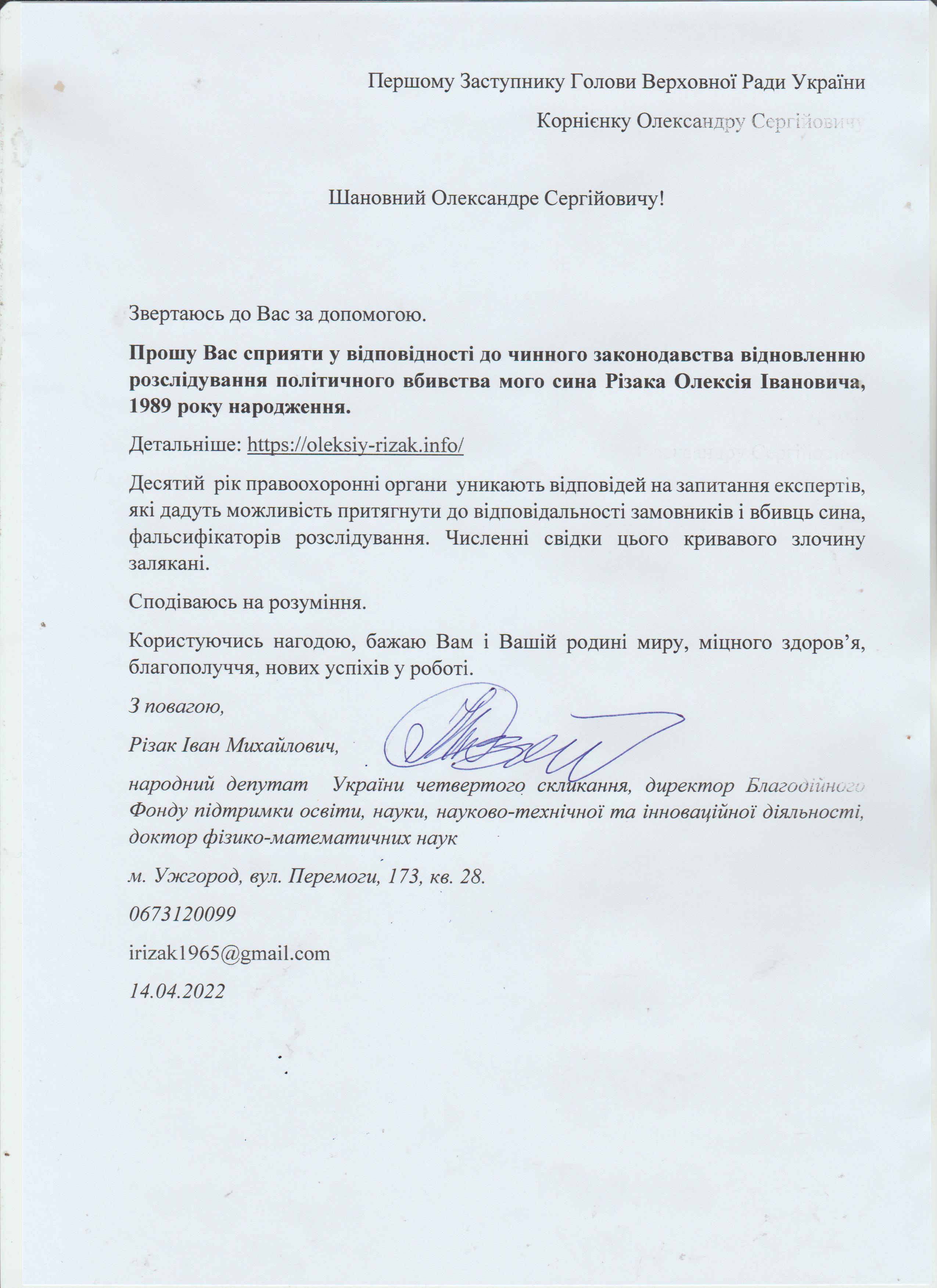 З метою сприяння слідству, а також всебічно об’єктивного розслідування справи прошу Вас доручити своїм підлеглим перевірити наступні питання: 1) чи міг володіти працівник ДПС в Закарпатській області Олексій Різак якоюсь інформацією про тіньовий та кримінальний бізнес в області, знання якої загрожувало б його життю? 2) перевірити у відповідних державних органах наявність у Різака Олексія Івановича та його близьких родичів майна, фінансів, земельних ділянок, підприємств, бізнесу, акцій, облігацій та інших цінних паперів, володіння якими могло б потенційно загрожувати його життю з боку конкурентів та інших співвласників? 3) чи були у нього відносини з громадянкою чи її родичами такими, що могли серйозно впливати на його майновий, матеріальний та ін. стан. 4) чи залучались до спеціальної перевірки, яку потрібно проходити при зарахуванні на державну службу, підрозділи зовнішнього спостереження якоїсь із правоохоронних структур області (я стверджую, що з часу переїзду мене в Закарпаття за нами було встановлене тотальне зовнішнє спостереження)? 5) хотілося б дізнатися (думаю, що це не є слідчою таємницею) в який час і з допомогою якого транспорту 16 листопада 2012 року виїхав син від своєї дівчини, чи проводжала вона його сама або з близькими родичами, чи бачила щось підозріле і яким таксі він виїжджав додому? 6) хотілося б також дізнатися хто першим побачив тіло вбитого юнака і повідомив швидку допомогу і міліцію? 7) з метою перевірки версії спроби отруєння сина Олексія, прошу дати на перевірку у спеціальну токсикологічну лабораторію результати трьох аналізів в «Астра-дія» і одного аналізу, проведеного в кардіодиспансері кілька тижнів тому.