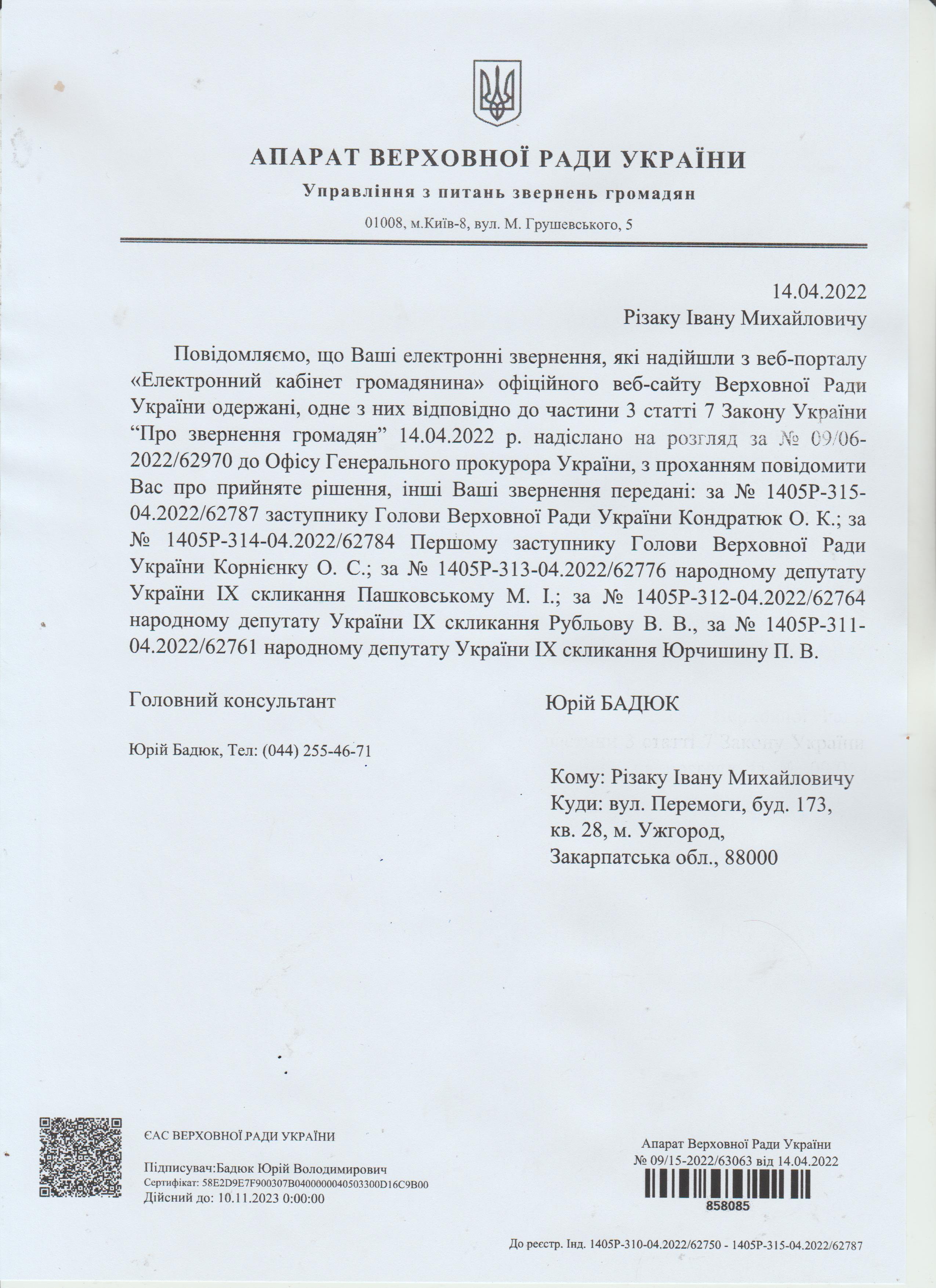 Шановні Анатолію Леонідовичу, Василю Дмитровичу, Василю Миколайовичу! Звертаюся до Вас як батько, як колишній керівник області, як простий житель цього краю, який хоче, щоб на цій землі ніколи не проливалася кров наших рідних, знайомих і близьких. Переконаний, що у політичного керівництва держави є достатньо волі для того, щоб поставити на місце «безпредельщиков», які пробують дестабілізувати ситуацію у державі. Переконаний, що події на кшталт помаранчевого терору у 2005 роців області більше не повторяться. З глибокою повагою, Різак Іван Михайлович, що проживає за адресою м. Ужгород, вул. Капушанська, б.173 кв. 28, голова Закарпатської обласної державної адміністрації (вересень 2002р. – січень 2005р.), народний депутат IV скликання, державний службовець І рангу, багаторічний голова і член координаційного комітету по боротьбі з організованою злочинністю при ОДА, кандидат фізико-математичних наук, тимчасово непрацюючий.