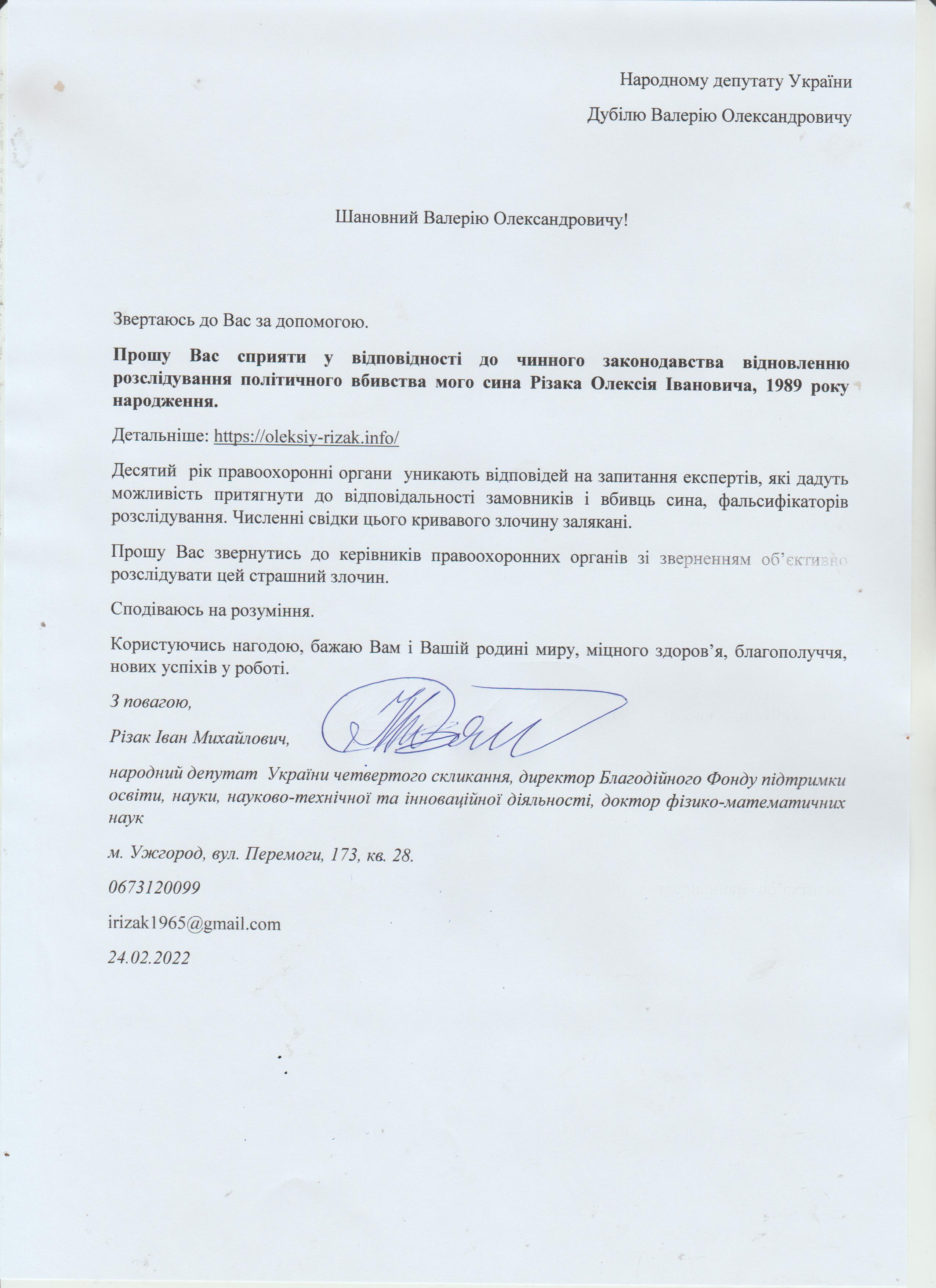З метою сприяння слідству, а також всебічно об’єктивного розслідування справи прошу Вас доручити своїм підлеглим перевірити наступні питання: 1) чи міг володіти працівник ДПС в Закарпатській області Олексій Різак якоюсь інформацією про тіньовий та кримінальний бізнес в області, знання якої загрожувало б його життю? 2) перевірити у відповідних державних органах наявність у Різака Олексія Івановича та його близьких родичів майна, фінансів, земельних ділянок, підприємств, бізнесу, акцій, облігацій та інших цінних паперів, володіння якими могло б потенційно загрожувати його життю з боку конкурентів та інших співвласників? 3) чи були у нього відносини з громадянкою чи її родичами такими, що могли серйозно впливати на його майновий, матеріальний та ін. стан. 4) чи залучались до спеціальної перевірки, яку потрібно проходити при зарахуванні на державну службу, підрозділи зовнішнього спостереження якоїсь із правоохоронних структур області (я стверджую, що з часу переїзду мене в Закарпаття за нами було встановлене тотальне зовнішнє спостереження)? 5) хотілося б дізнатися (думаю, що це не є слідчою таємницею) в який час і з допомогою якого транспорту 16 листопада 2012 року виїхав син від своєї дівчини, чи проводжала вона його сама або з близькими родичами, чи бачила щось підозріле і яким таксі він виїжджав додому? 6) хотілося б також дізнатися хто першим побачив тіло вбитого юнака і повідомив швидку допомогу і міліцію? 7) з метою перевірки версії спроби отруєння сина Олексія, прошу дати на перевірку у спеціальну токсикологічну лабораторію результати трьох аналізів в «Астра-дія» і одного аналізу, проведеного в кардіодиспансері кілька тижнів тому.