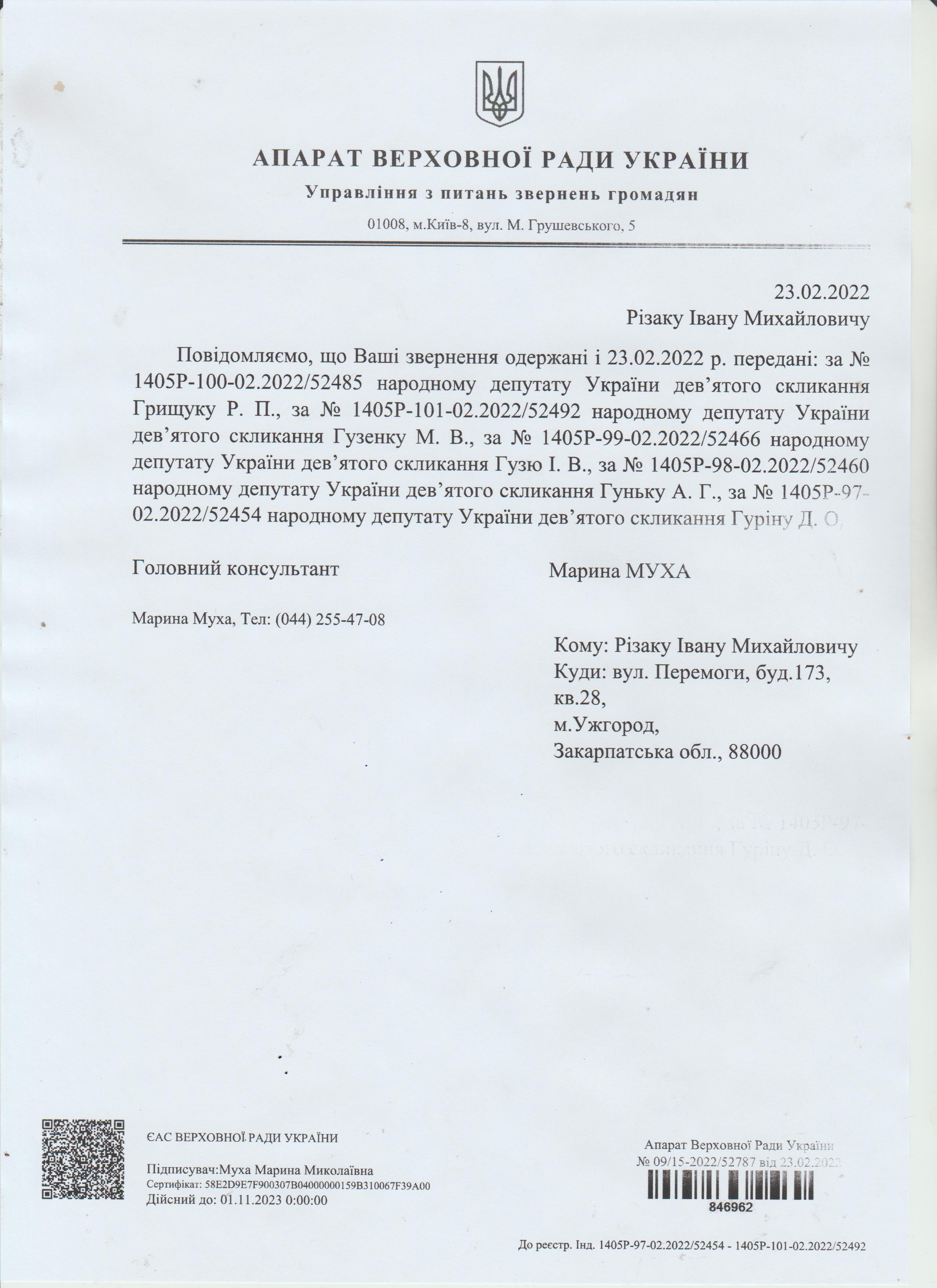 Шановні Анатолію Леонідовичу, Василю Дмитровичу, Василю Миколайовичу! Звертаюся до Вас як батько, як колишній керівник області, як простий житель цього краю, який хоче, щоб на цій землі ніколи не проливалася кров наших рідних, знайомих і близьких. Переконаний, що у політичного керівництва держави є достатньо волі для того, щоб поставити на місце «безпредельщиков», які пробують дестабілізувати ситуацію у державі. Переконаний, що події на кшталт помаранчевого терору у 2005 роців області більше не повторяться. З глибокою повагою, Різак Іван Михайлович, що проживає за адресою м. Ужгород, вул. Капушанська, б.173 кв. 28, голова Закарпатської обласної державної адміністрації (вересень 2002р. – січень 2005р.), народний депутат IV скликання, державний службовець І рангу, багаторічний голова і член координаційного комітету по боротьбі з організованою злочинністю при ОДА, кандидат фізико-математичних наук, тимчасово непрацюючий.