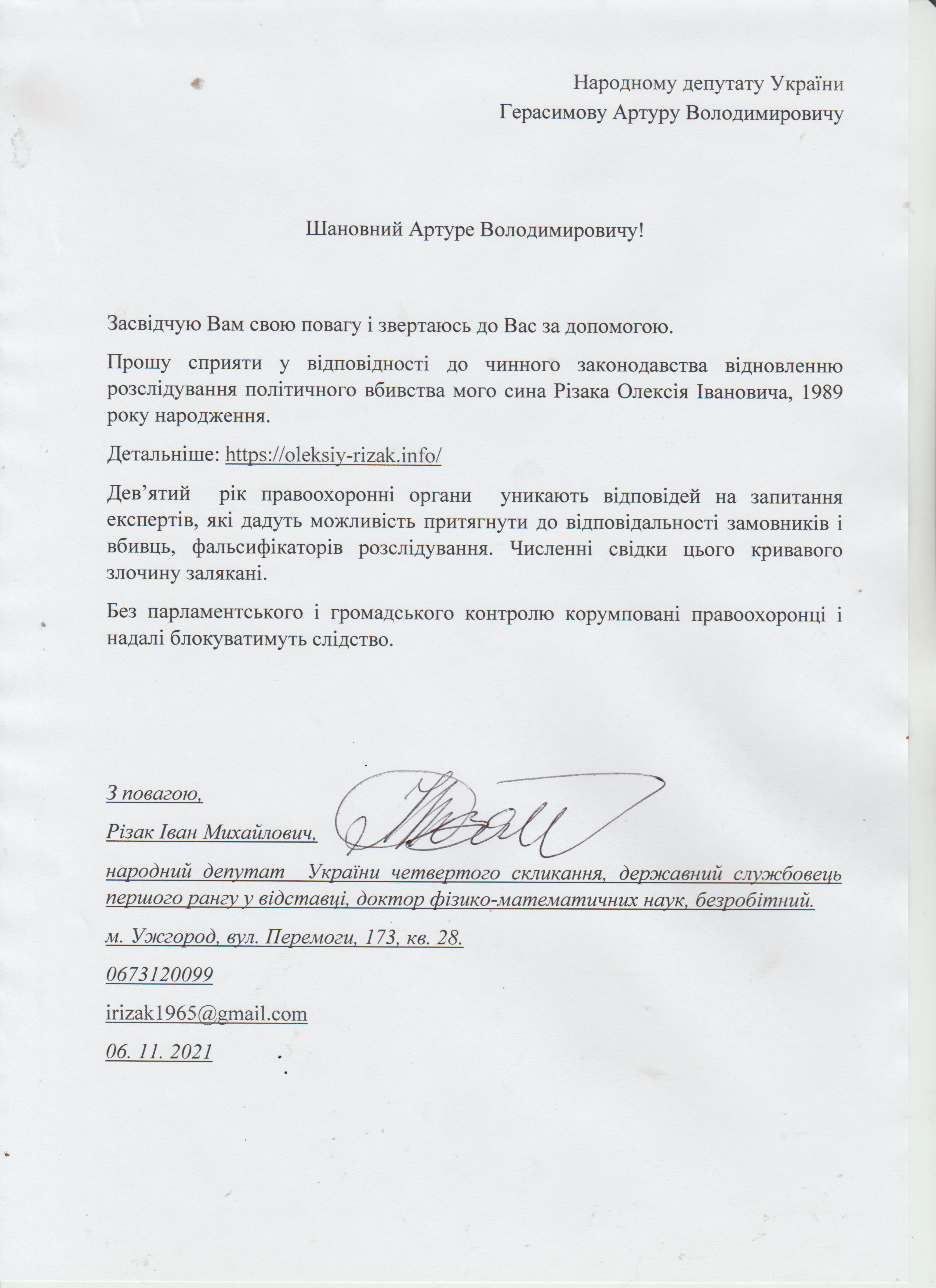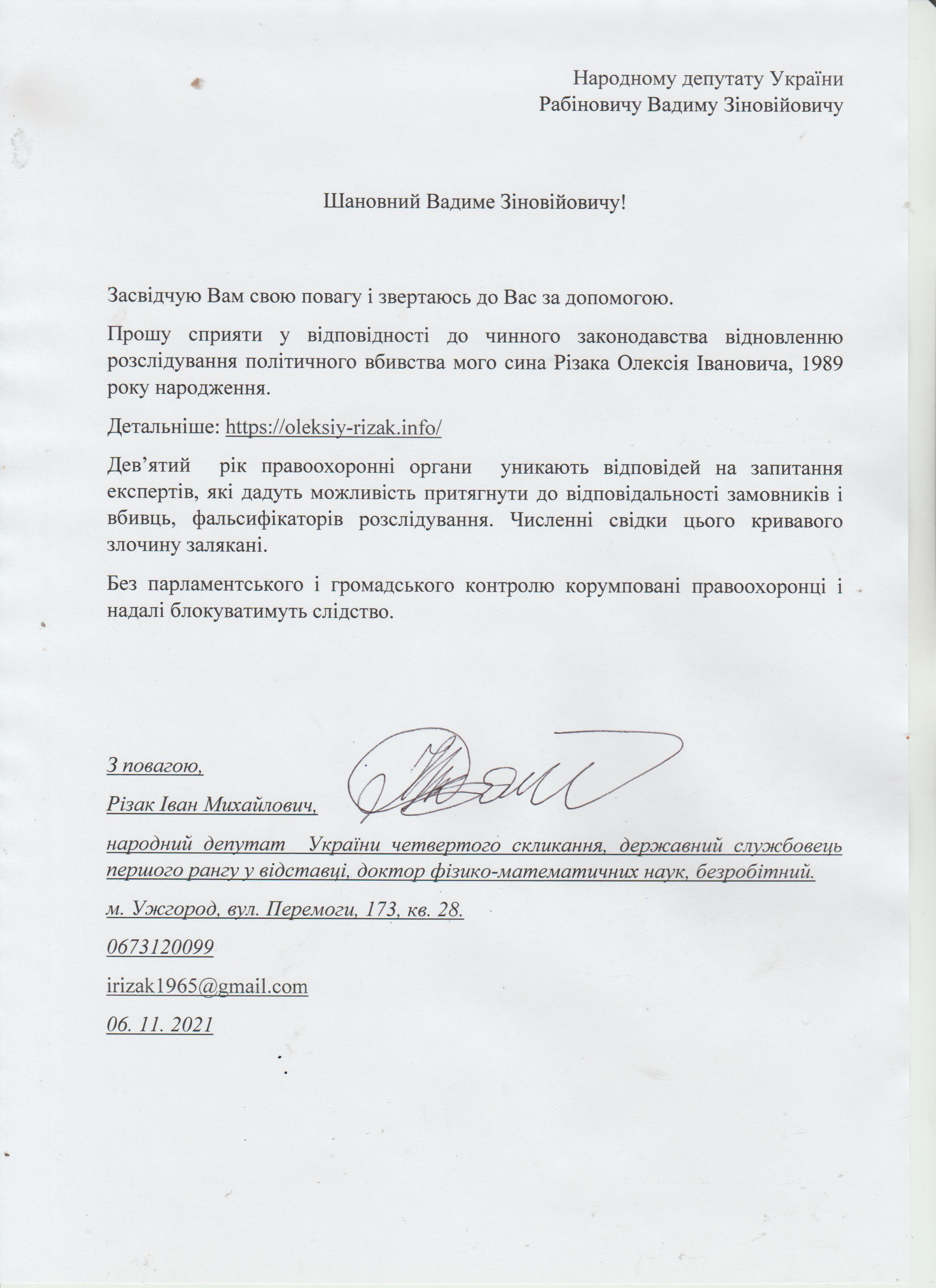 З метою сприяння слідству, а також всебічно об’єктивного розслідування справи прошу Вас доручити своїм підлеглим перевірити наступні питання: 1) чи міг володіти працівник ДПС в Закарпатській області Олексій Різак якоюсь інформацією про тіньовий та кримінальний бізнес в області, знання якої загрожувало б його життю? 2) перевірити у відповідних державних органах наявність у Різака Олексія Івановича та його близьких родичів майна, фінансів, земельних ділянок, підприємств, бізнесу, акцій, облігацій та інших цінних паперів, володіння якими могло б потенційно загрожувати його життю з боку конкурентів та інших співвласників? 3) чи були у нього відносини з громадянкою чи її родичами такими, що могли серйозно впливати на його майновий, матеріальний та ін. стан. 4) чи залучались до спеціальної перевірки, яку потрібно проходити при зарахуванні на державну службу, підрозділи зовнішнього спостереження якоїсь із правоохоронних структур області (я стверджую, що з часу переїзду мене в Закарпаття за нами було встановлене тотальне зовнішнє спостереження)? 5) хотілося б дізнатися (думаю, що це не є слідчою таємницею) в який час і з допомогою якого транспорту 16 листопада 2012 року виїхав син від своєї дівчини, чи проводжала вона його сама або з близькими родичами, чи бачила щось підозріле і яким таксі він виїжджав додому? 6) хотілося б також дізнатися хто першим побачив тіло вбитого юнака і повідомив швидку допомогу і міліцію? 7) з метою перевірки версії спроби отруєння сина Олексія, прошу дати на перевірку у спеціальну токсикологічну лабораторію результати трьох аналізів в «Астра-дія» і одного аналізу, проведеного в кардіодиспансері кілька тижнів тому.