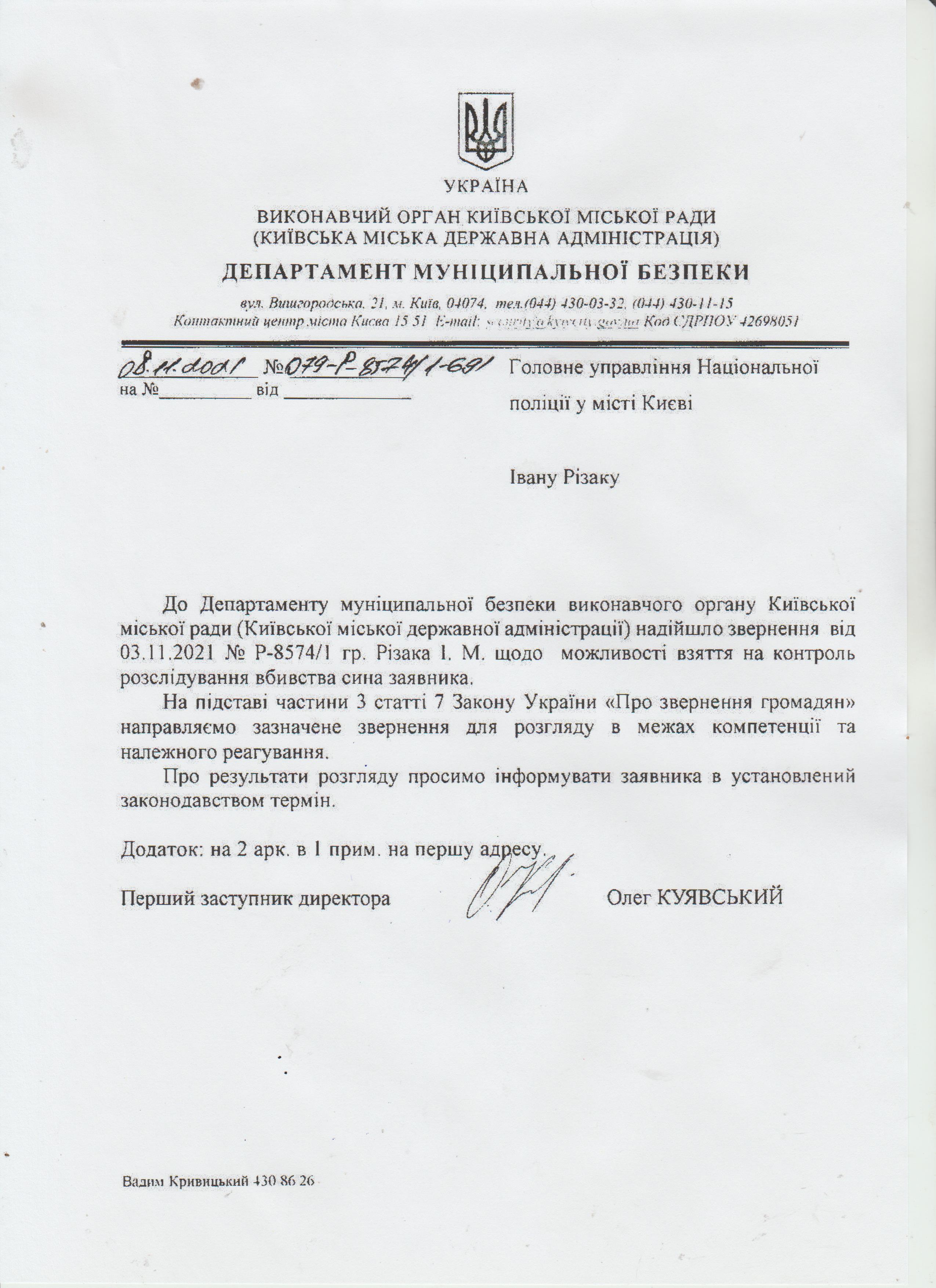 Звертаюся до Вас у зв’язку з тим,що близько двох тижнів тому при невідомих обставинах був убитий єдиний мій син – Олексій Іванович Різак, 1989 р.н. Перш за все, був дуже здивований повідомленням прес-центру УМВС в той же вечір, а також поширенням багатьма ЗМІ інформації про те, що основною причиною трагічної загибелі мого сина є самогубство.