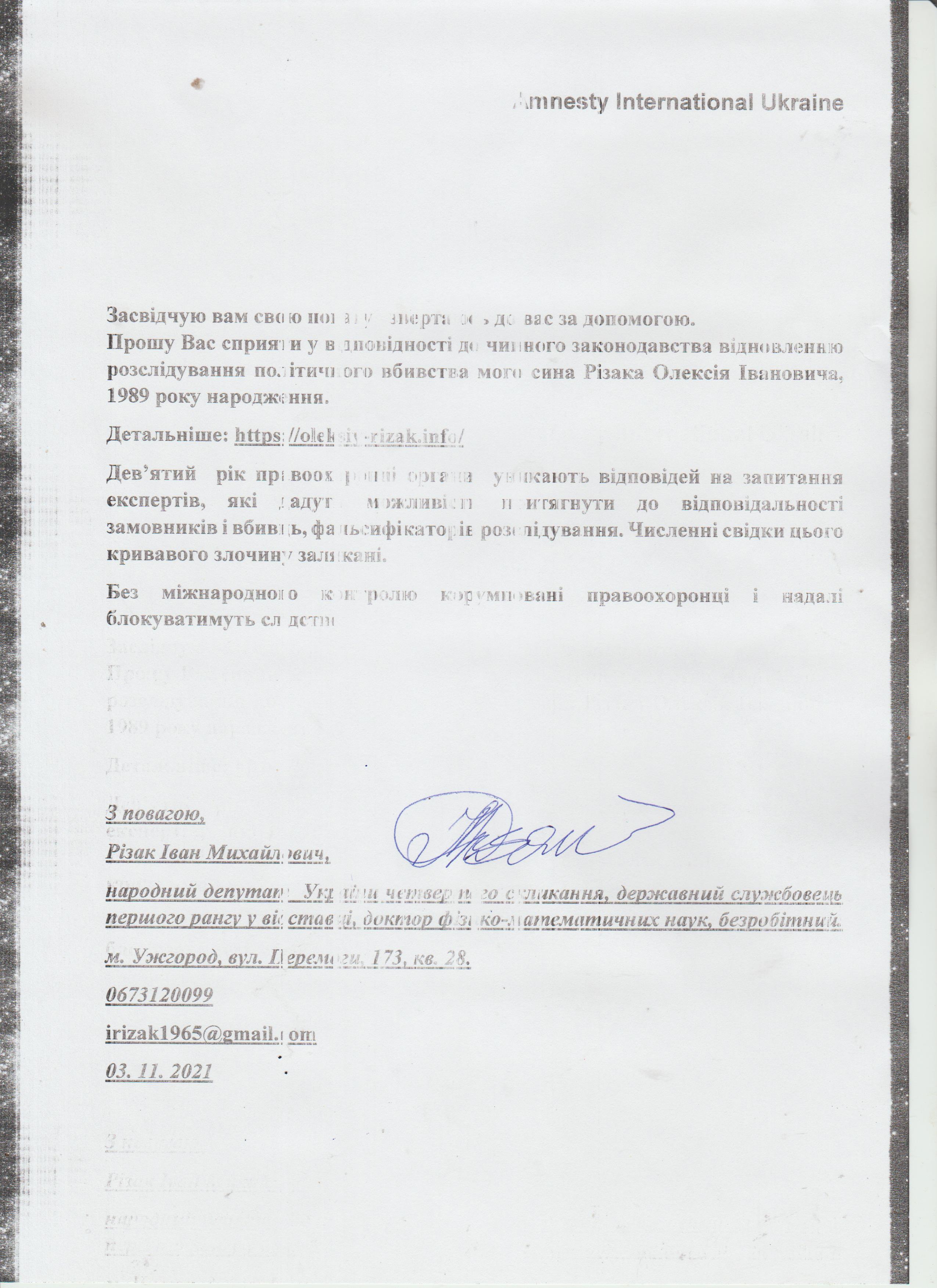 З метою сприяння слідству, а також всебічно об’єктивного розслідування справи прошу Вас доручити своїм підлеглим перевірити наступні питання: 1) чи міг володіти працівник ДПС в Закарпатській області Олексій Різак якоюсь інформацією про тіньовий та кримінальний бізнес в області, знання якої загрожувало б його життю? 2) перевірити у відповідних державних органах наявність у Різака Олексія Івановича та його близьких родичів майна, фінансів, земельних ділянок, підприємств, бізнесу, акцій, облігацій та інших цінних паперів, володіння якими могло б потенційно загрожувати його життю з боку конкурентів та інших співвласників? 3) чи були у нього відносини з громадянкою чи її родичами такими, що могли серйозно впливати на його майновий, матеріальний та ін. стан. 4) чи залучались до спеціальної перевірки, яку потрібно проходити при зарахуванні на державну службу, підрозділи зовнішнього спостереження якоїсь із правоохоронних структур області (я стверджую, що з часу переїзду мене в Закарпаття за нами було встановлене тотальне зовнішнє спостереження)? 5) хотілося б дізнатися (думаю, що це не є слідчою таємницею) в який час і з допомогою якого транспорту 16 листопада 2012 року виїхав син від своєї дівчини, чи проводжала вона його сама або з близькими родичами, чи бачила щось підозріле і яким таксі він виїжджав додому? 6) хотілося б також дізнатися хто першим побачив тіло вбитого юнака і повідомив швидку допомогу і міліцію? 7) з метою перевірки версії спроби отруєння сина Олексія, прошу дати на перевірку у спеціальну токсикологічну лабораторію результати трьох аналізів в «Астра-дія» і одного аналізу, проведеного в кардіодиспансері кілька тижнів тому.